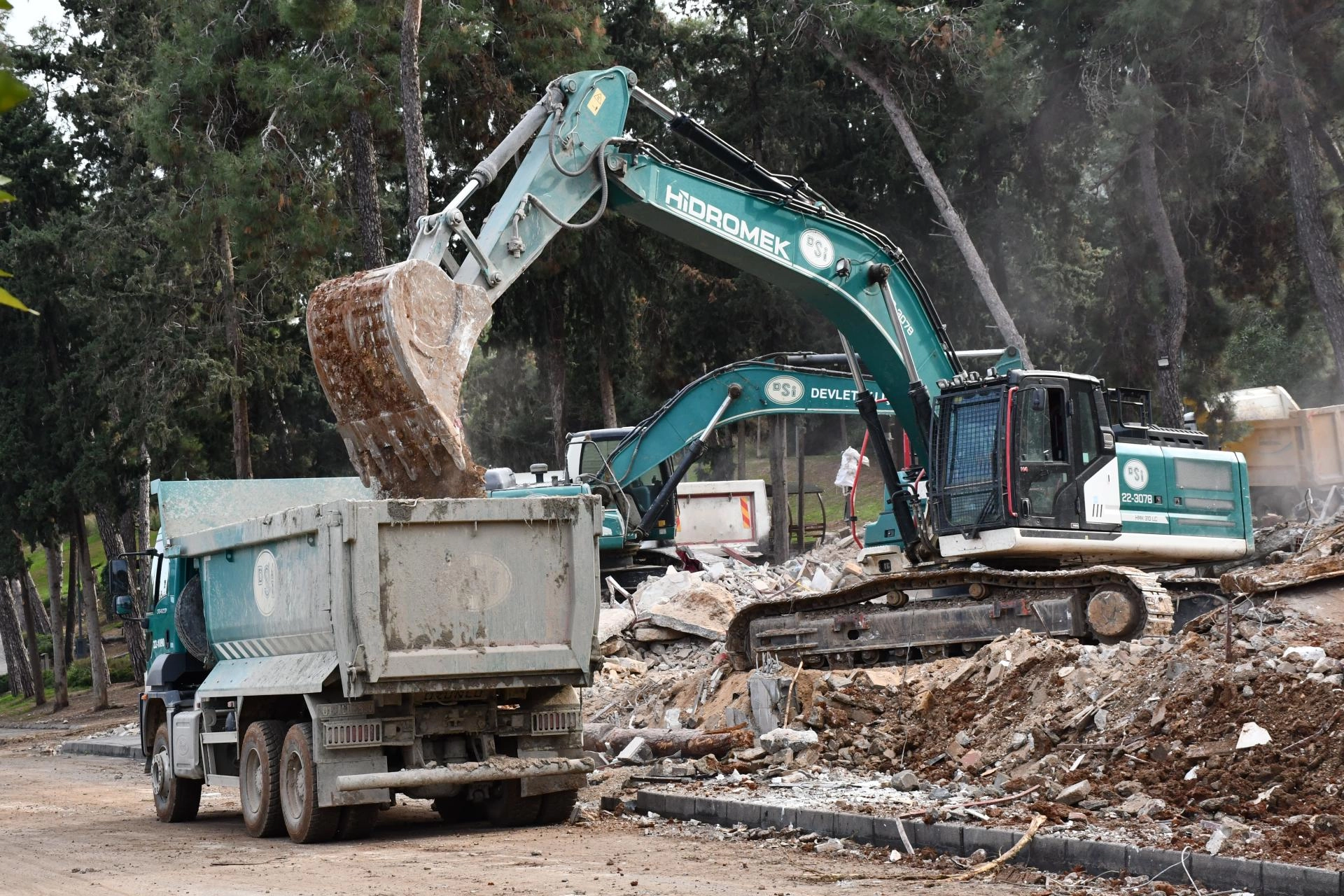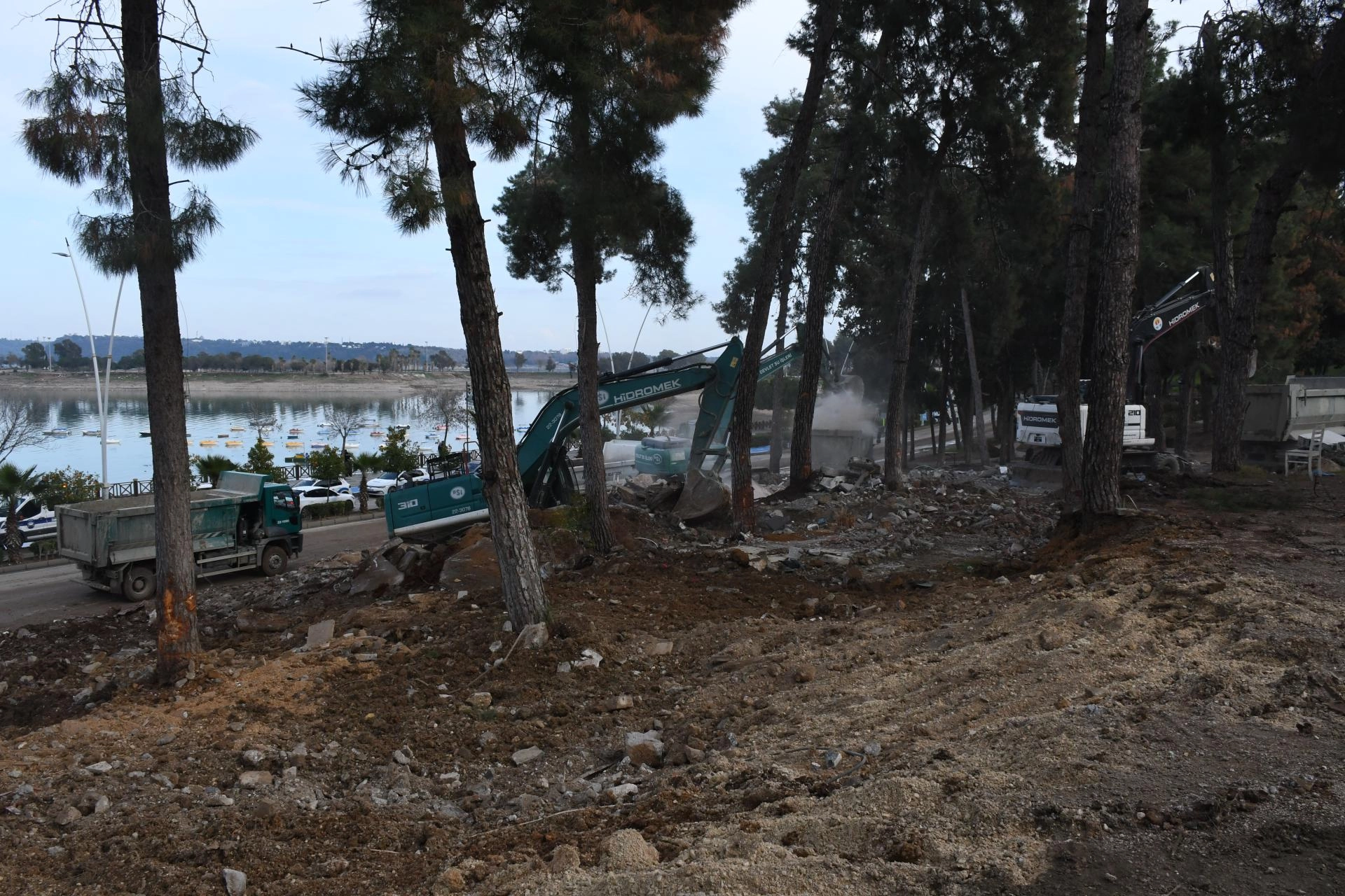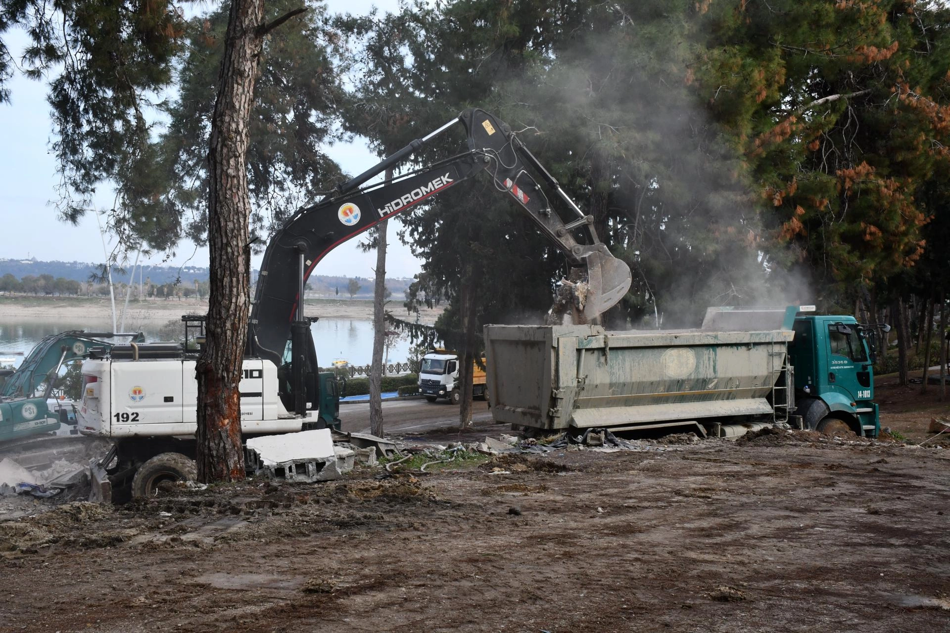 Devlet Su İşleri ve Büyükşehir Belediyesi ekiplerince iş makineleriyle yıkılan yapıların kalıntıları, kamyonlarla bölgeden uzaklaştırılıyor.