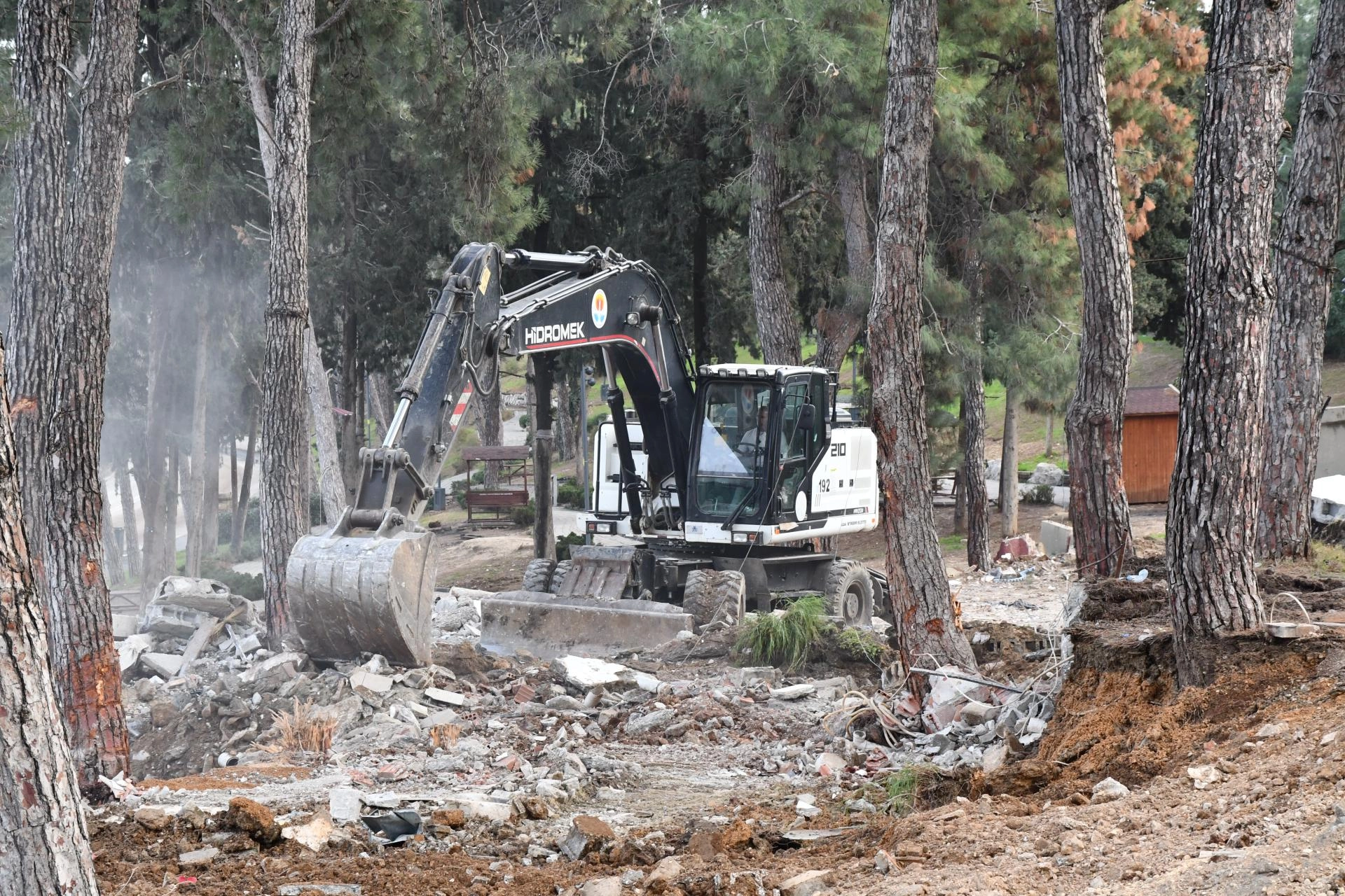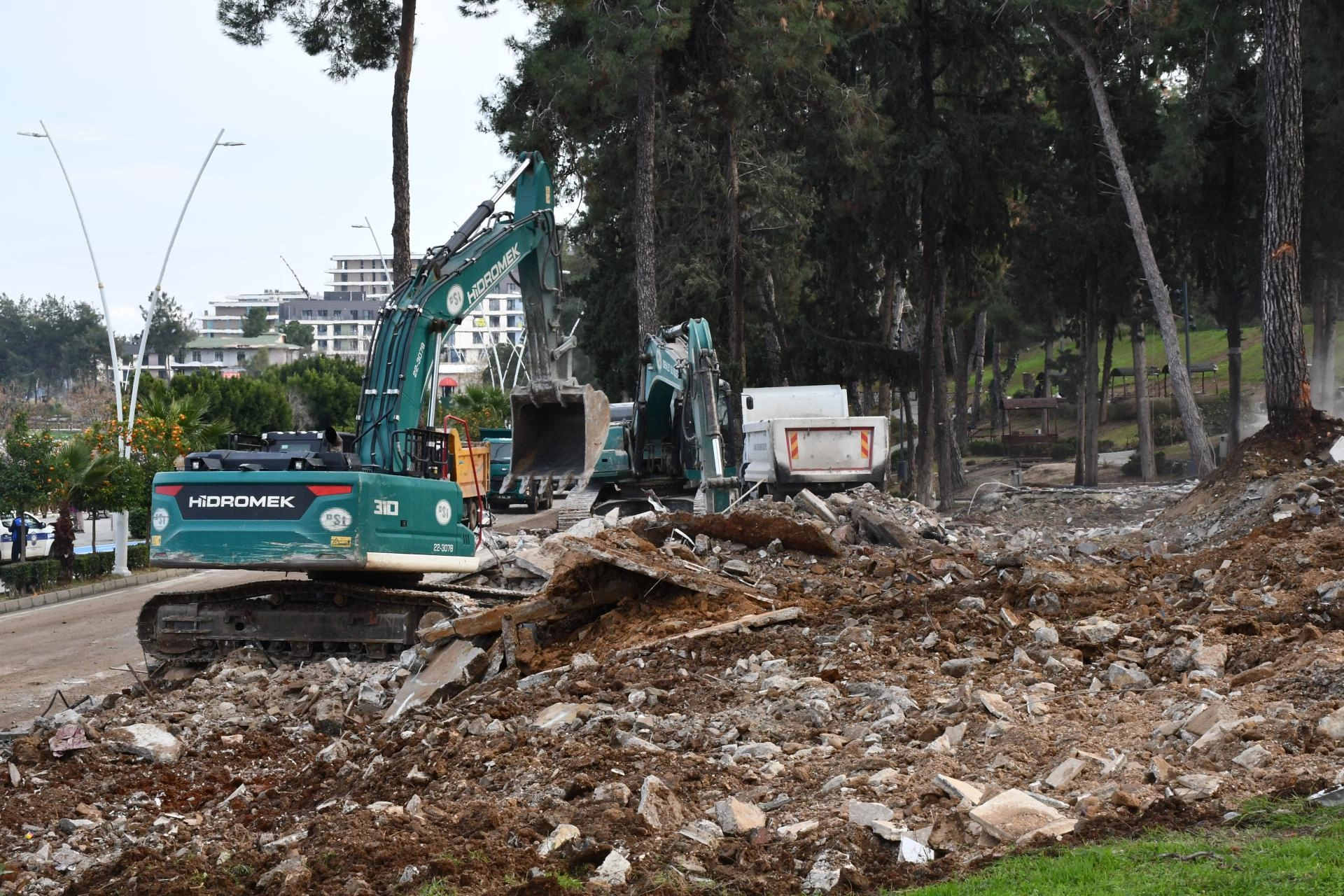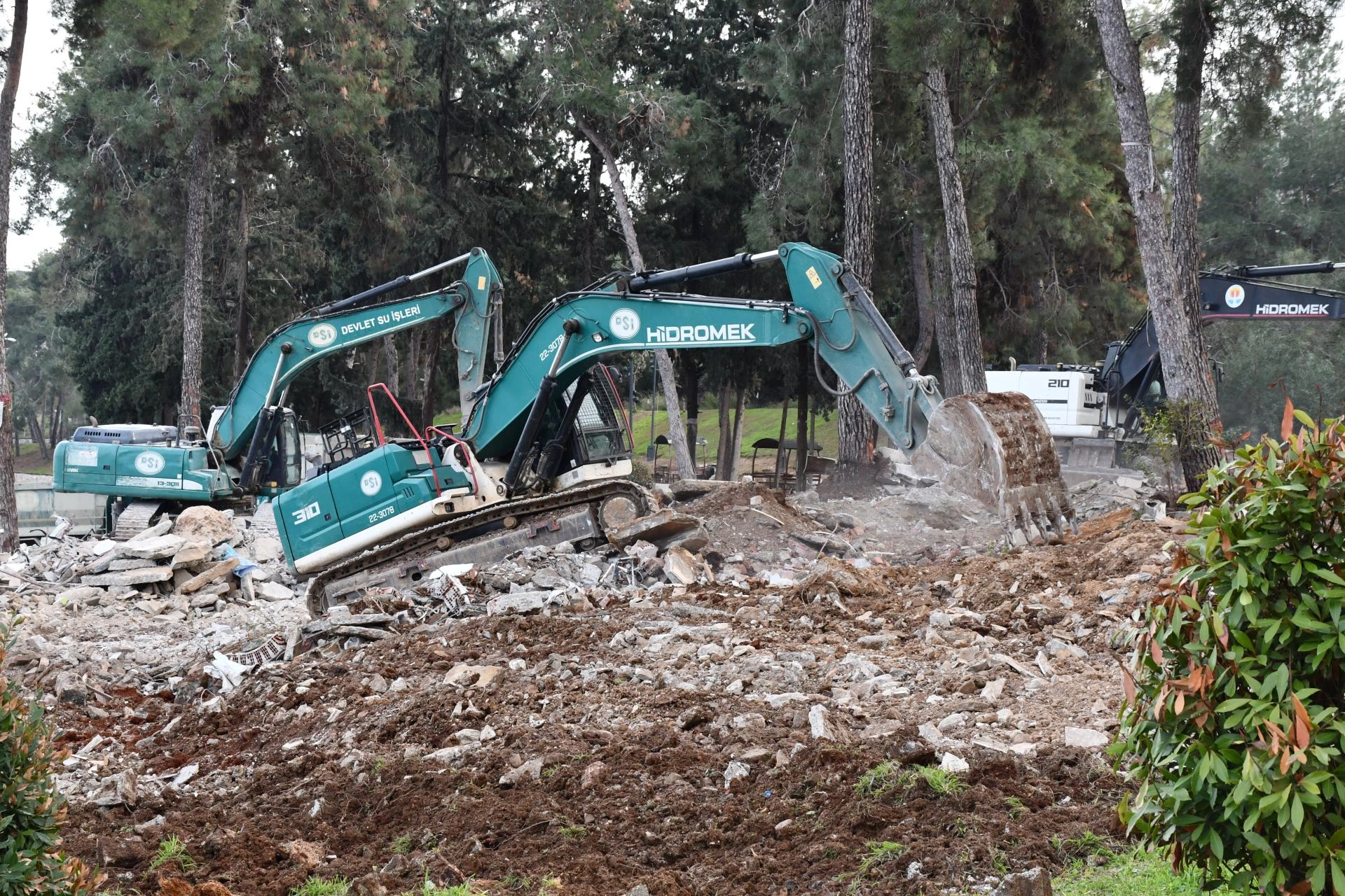 Devlet Su İşleri ve Büyükşehir Belediyesi ekiplerince iş makineleriyle yıkılan yapıların kalıntıları, kamyonlarla bölgeden uzaklaştırılıyor.