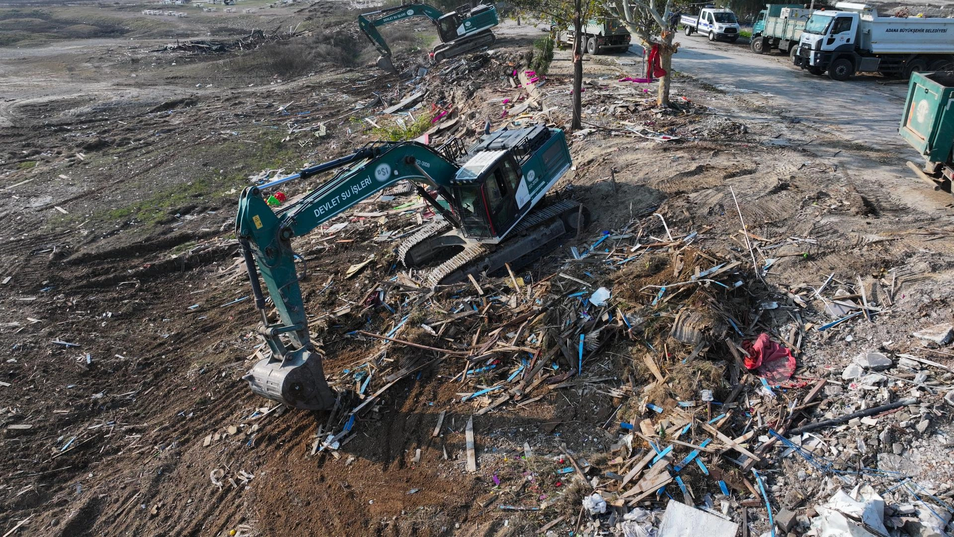 DSİ ve Büyükşehir Belediyesi ekiplerince iş makineleriyle yıkılan kaçak yapıların enkazı kamyonlara yüklenerek alandan taşınıyor.