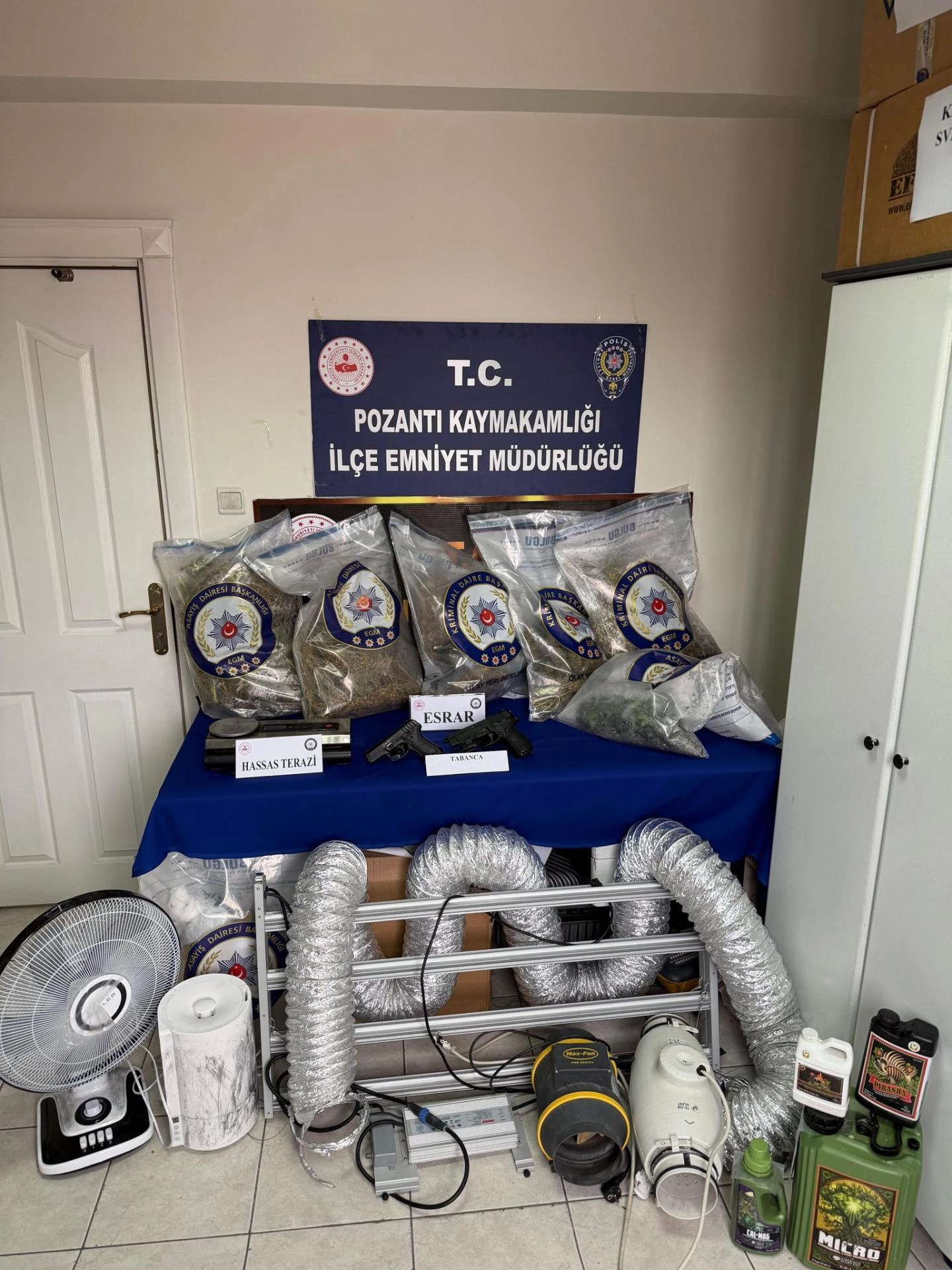 Söz konusu adrese operasyon düzenleyen ekipler yapılan aramada 2 kilo 774 gram esrar, 40 kök kenevir, ruhsatsız tabanca, 50 fişek ve uyuşturucu üretiminde kullanılan malzemeler ele geçirdi, M.A'yı gözaltına aldı.