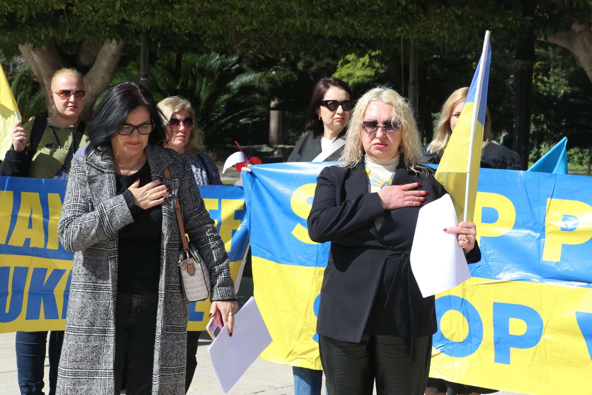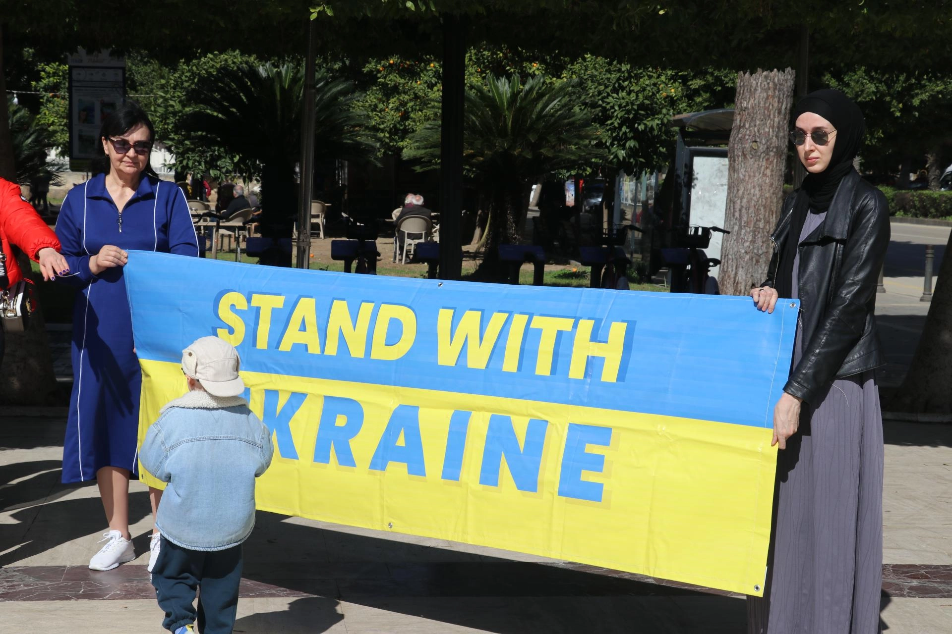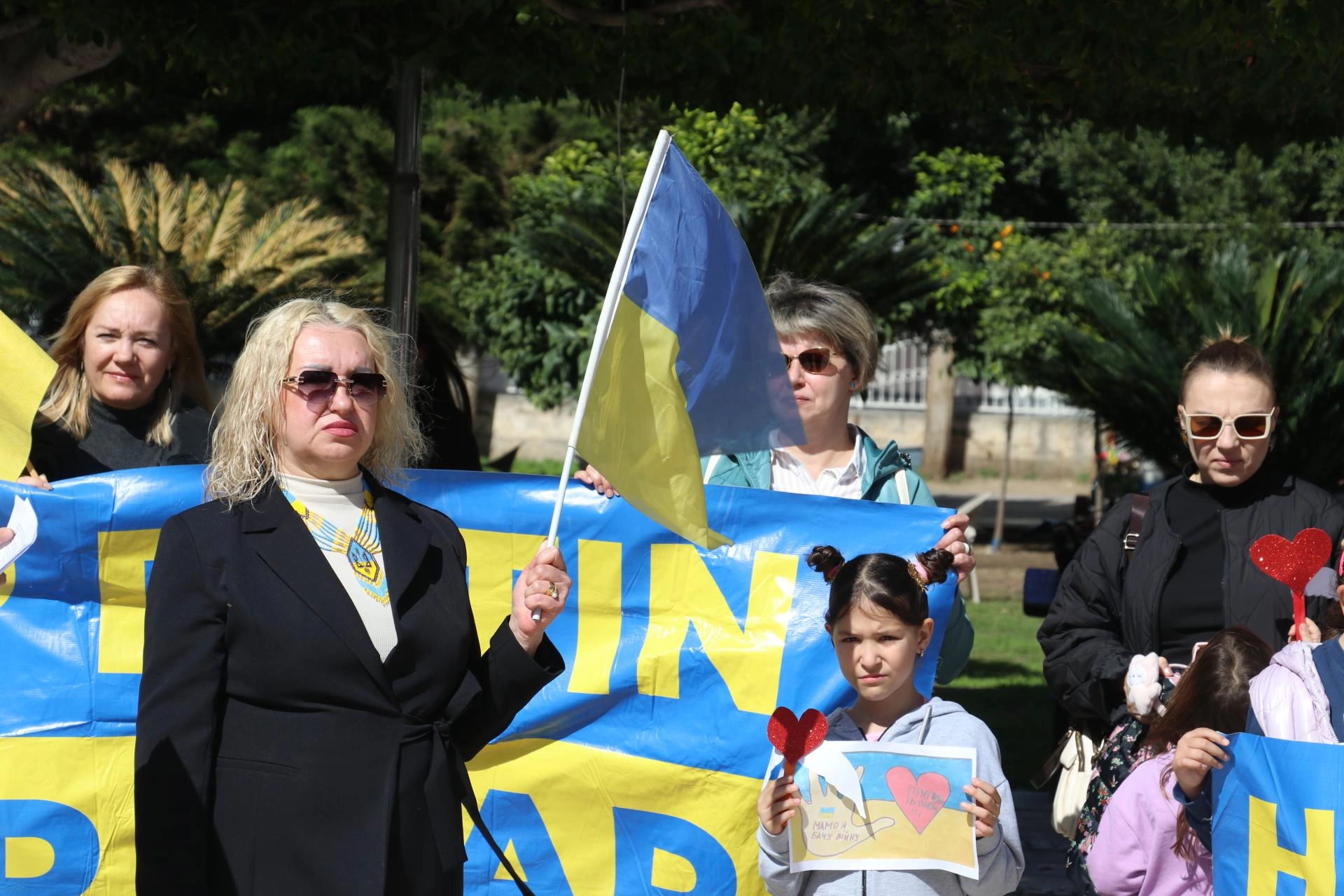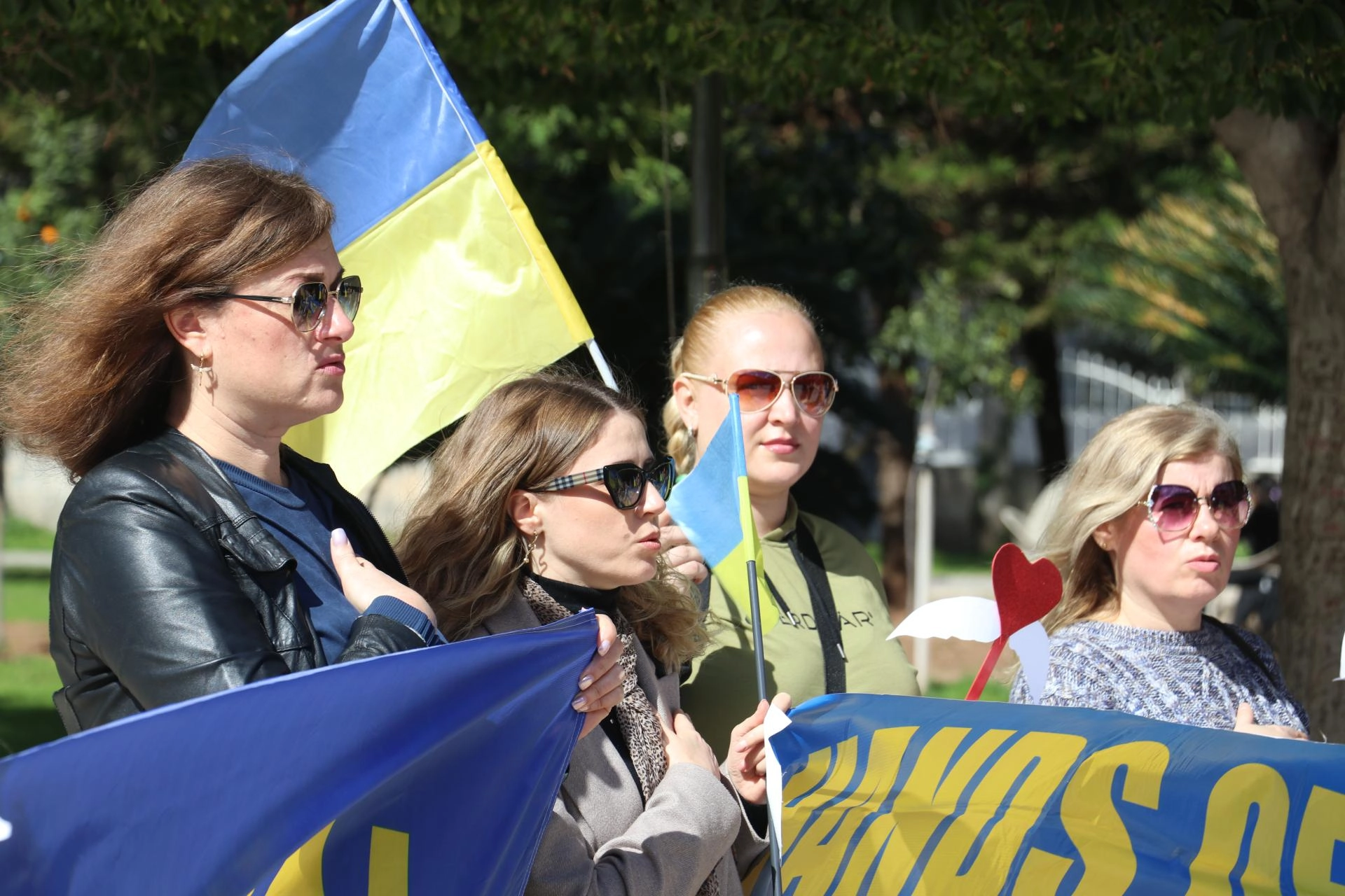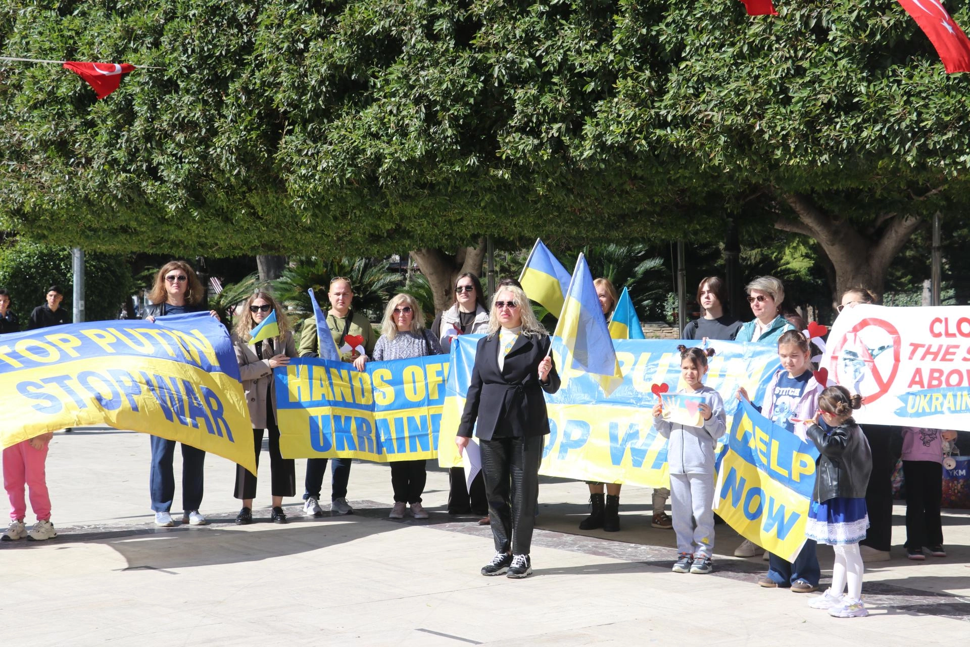 Etkinlikte katılımcılar, Ukrayna bayrakları ile İngilizce "Putin'i durdur, savaşı durdur" ve "Ukrayna'dan ellerinizi çekin" yazılı pankartlar taşıdı.