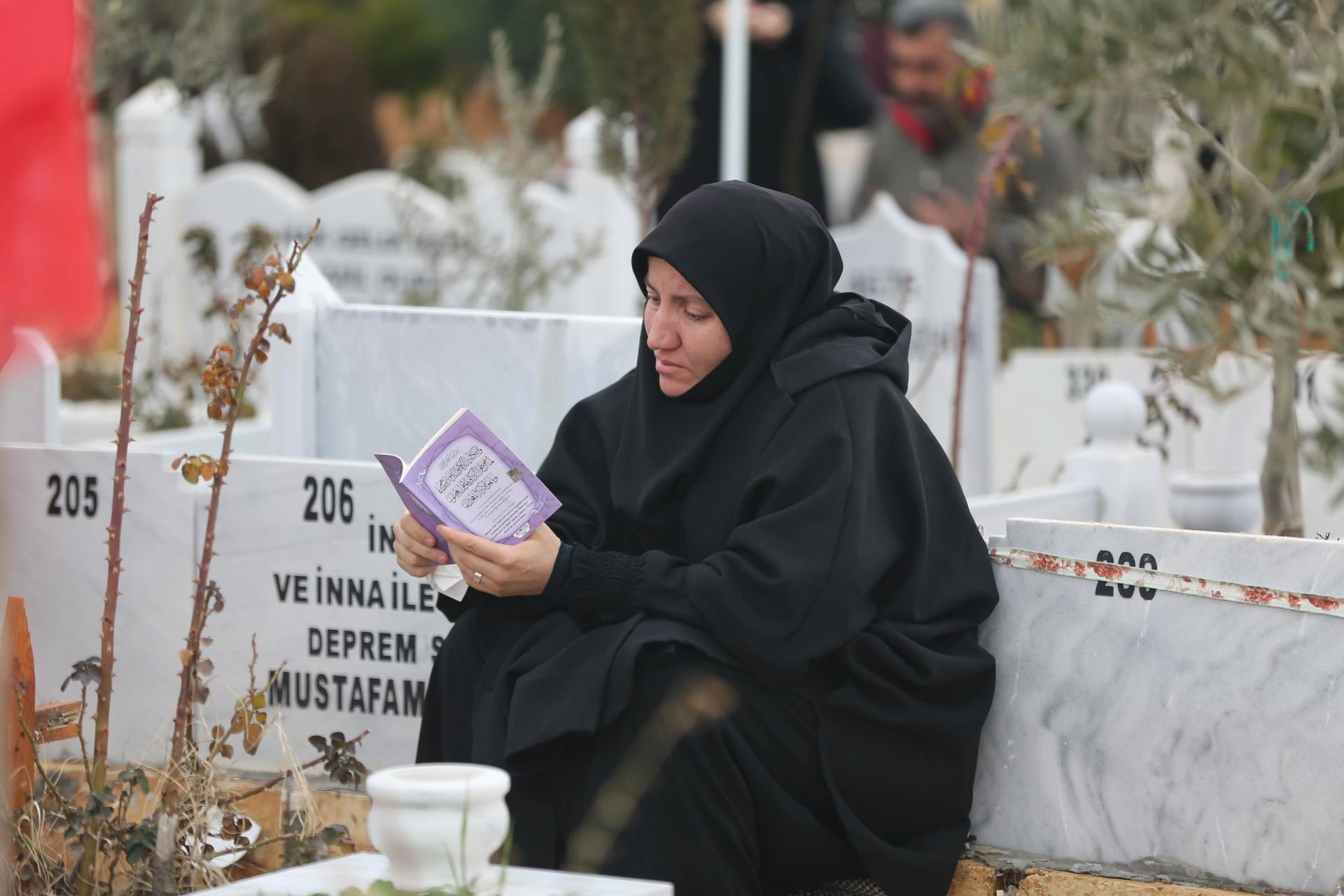 Yeni Mezarlık'taki "Deprem Şehitliği"ne giden vatandaşlar, yakınlarının kabirlerinde dua edip Kur'an-ı Kerim okudu.