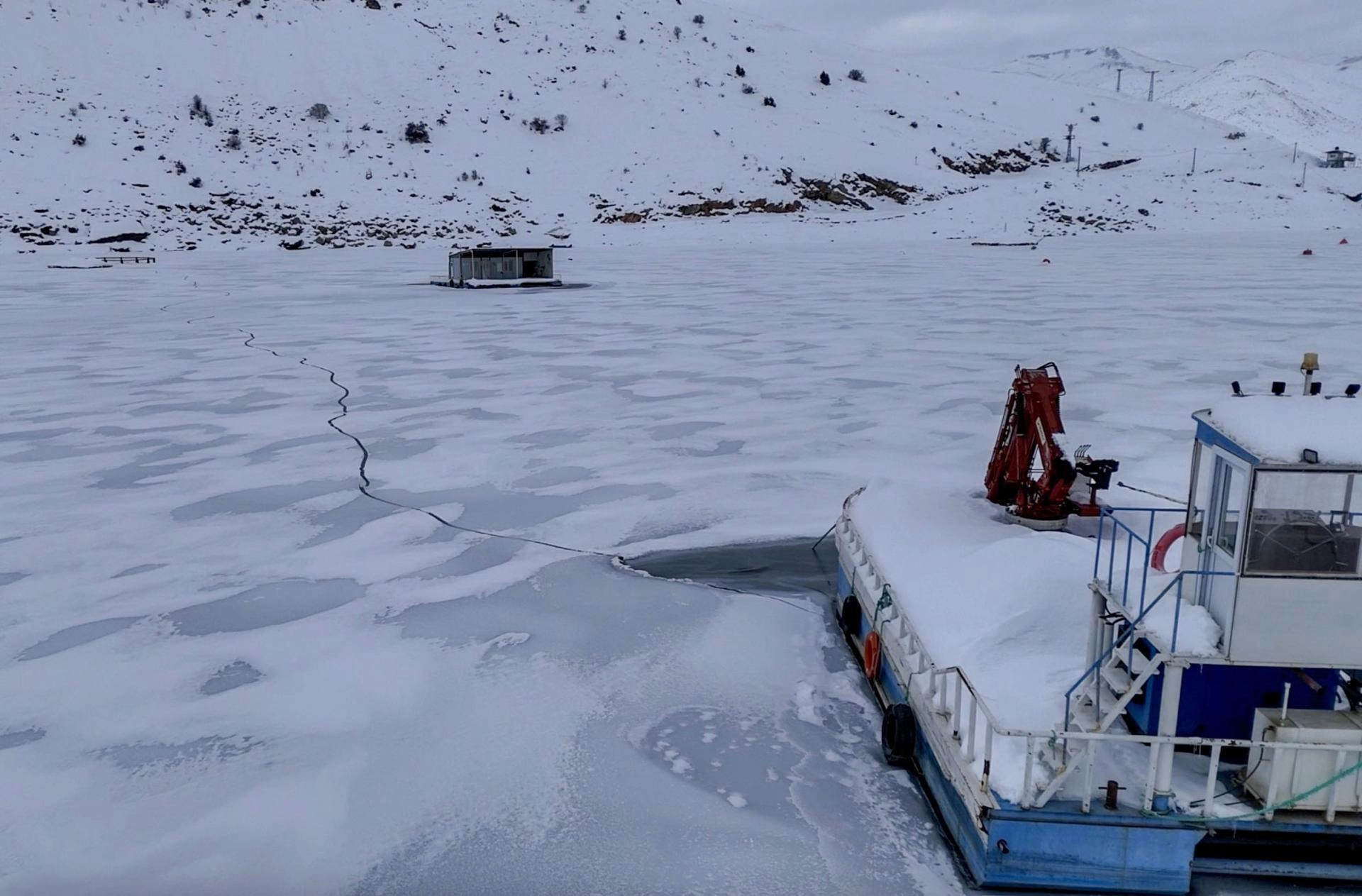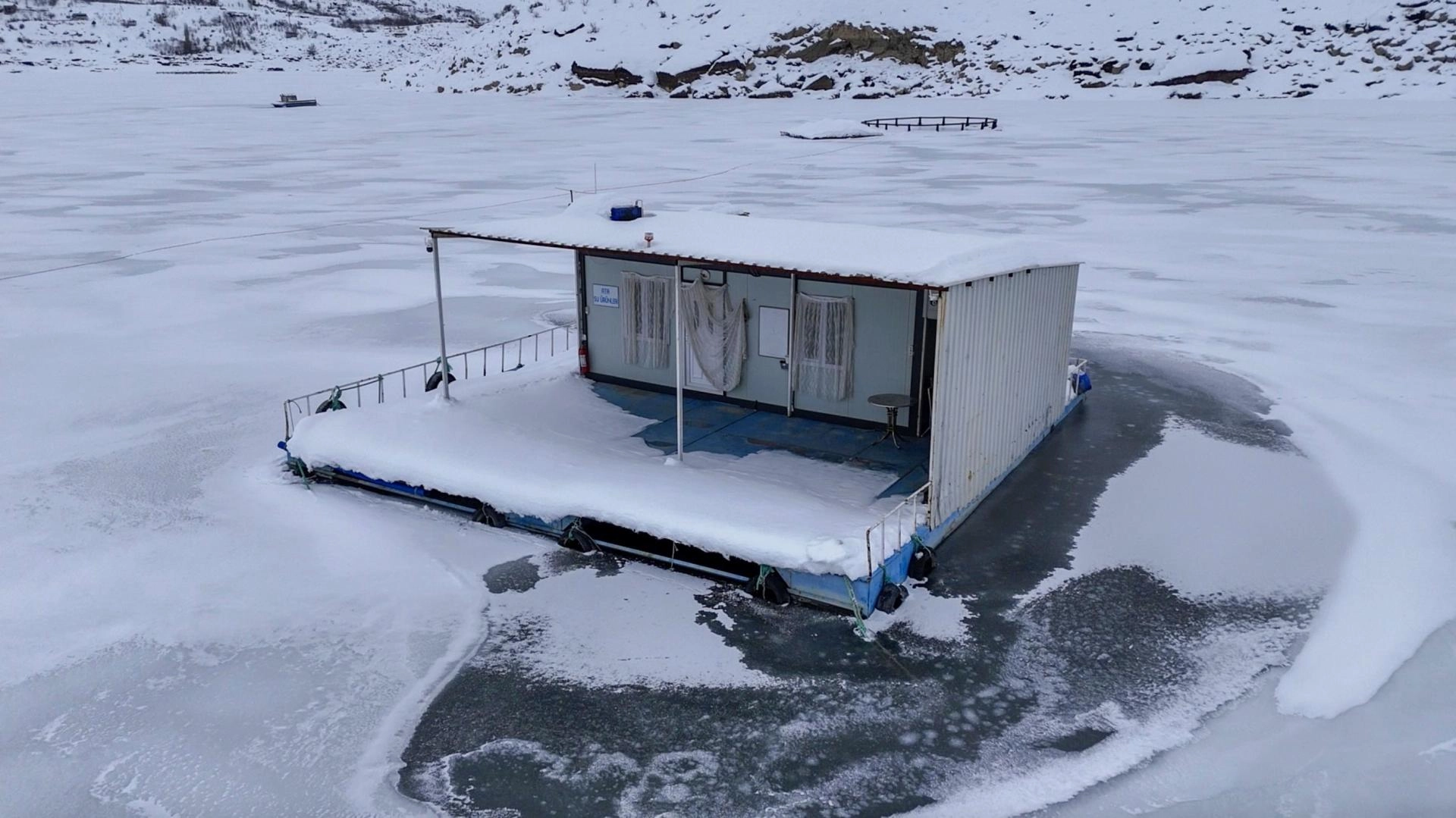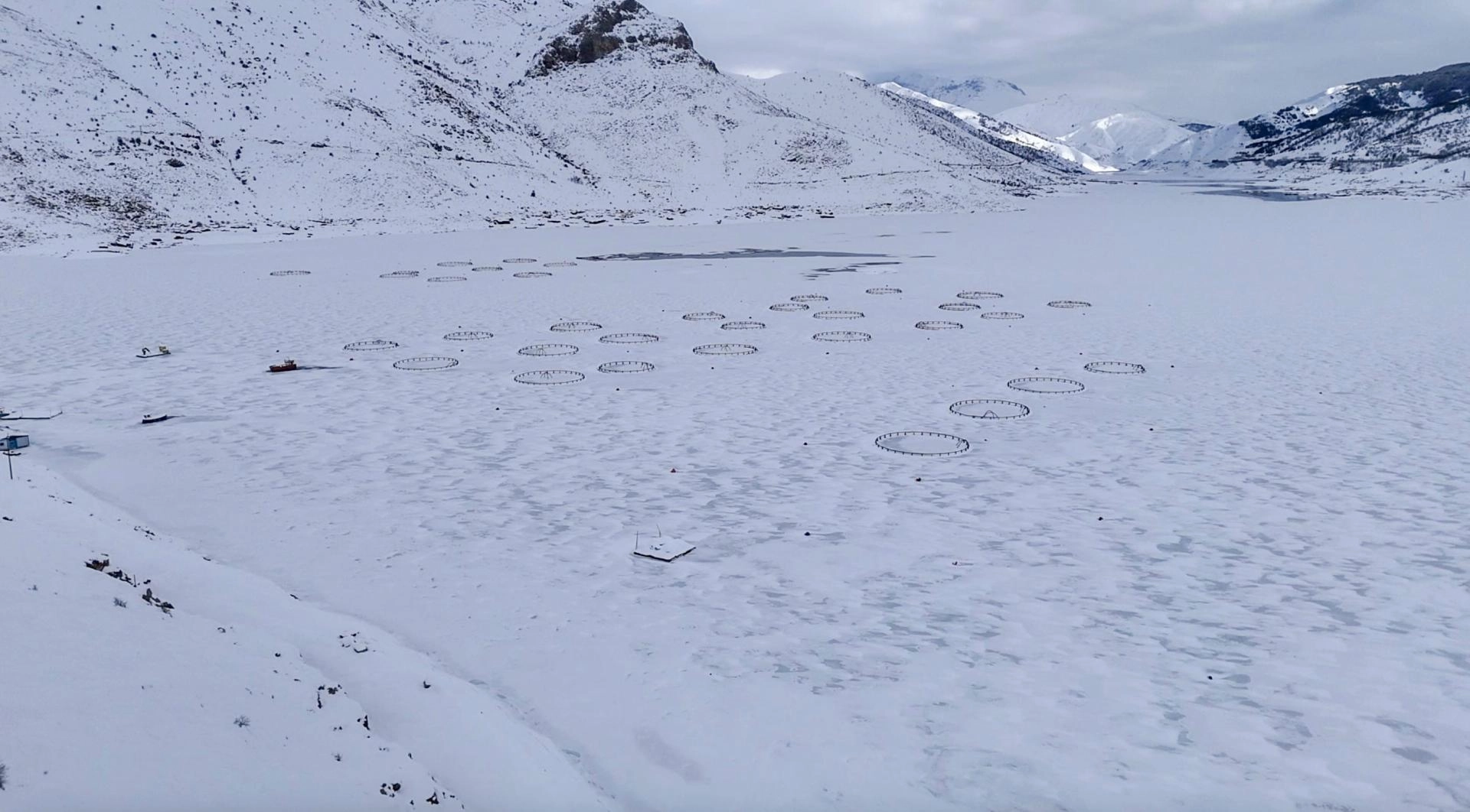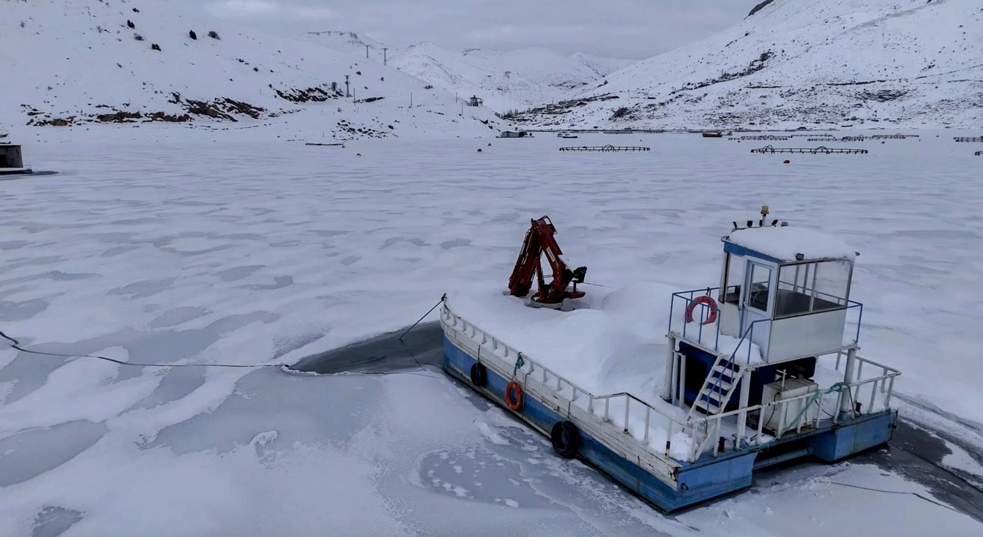 Barajdaki tekne, alabalık kafesleri ve yüzen adaların donması fotoğraf tutkunları ve doğaseverler için güzel manzaralar oluşturdu.
