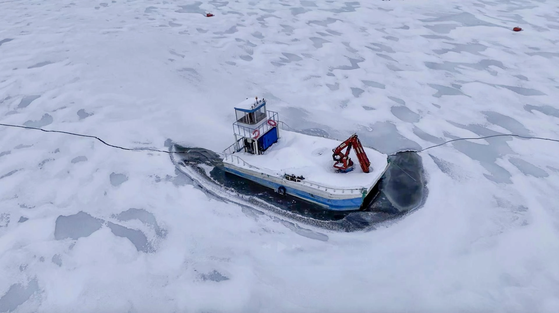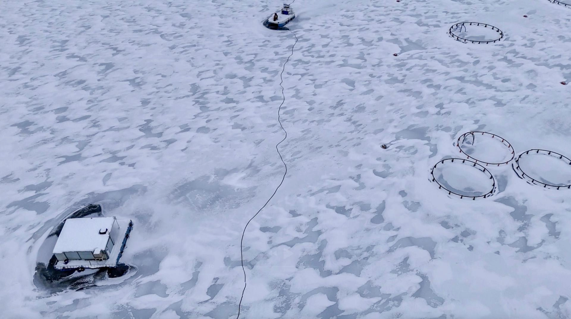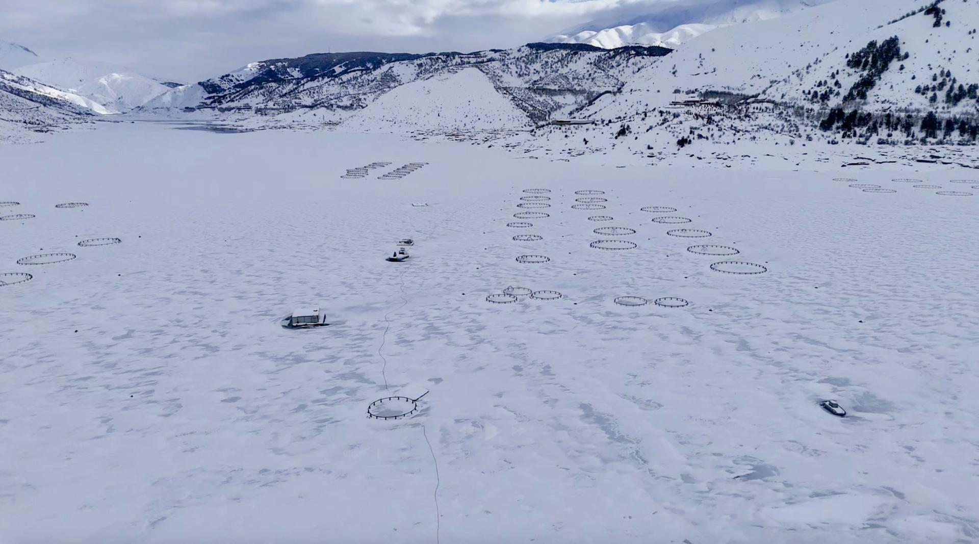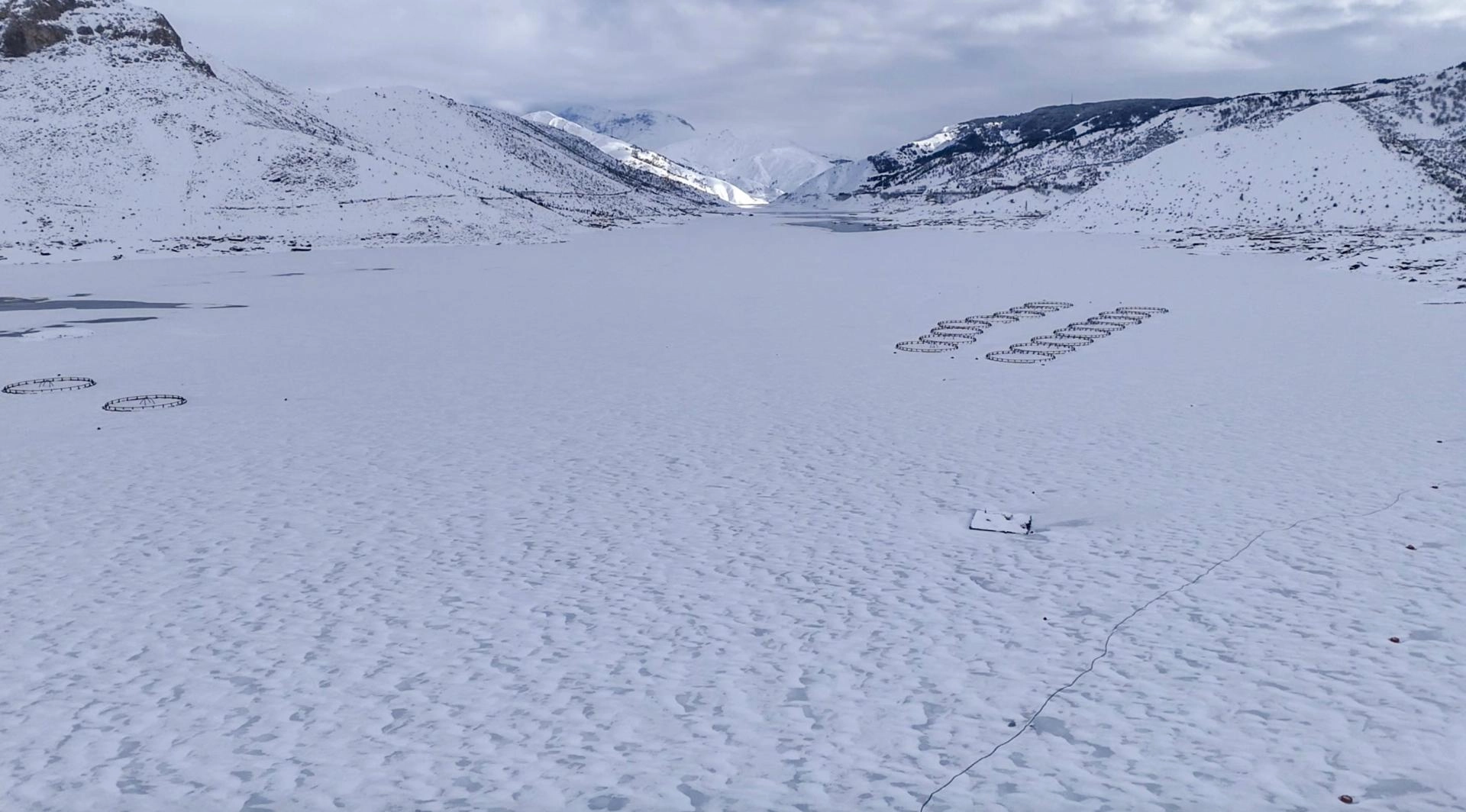 Barajdaki tekne, alabalık kafesleri ve yüzen adaların donması fotoğraf tutkunları ve doğaseverler için güzel manzaralar oluşturdu.