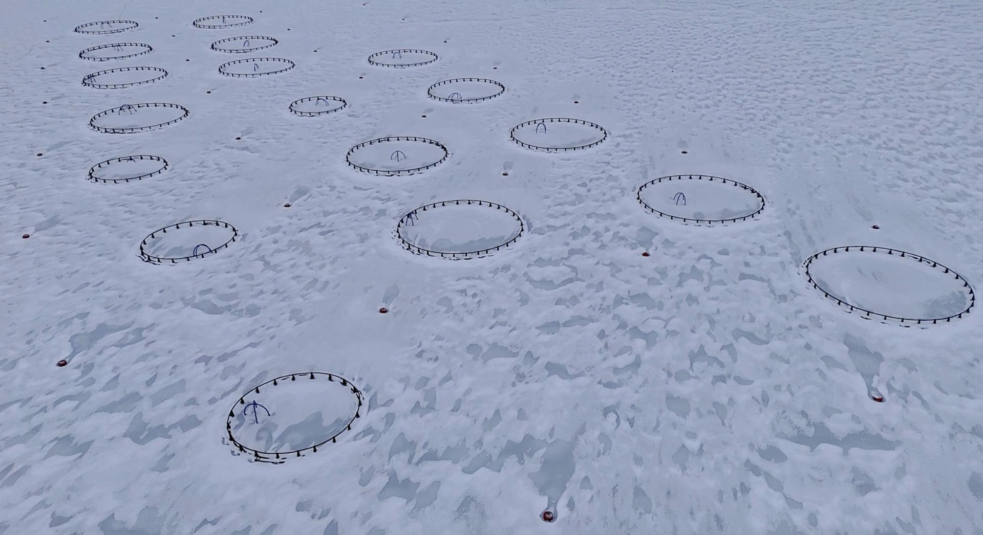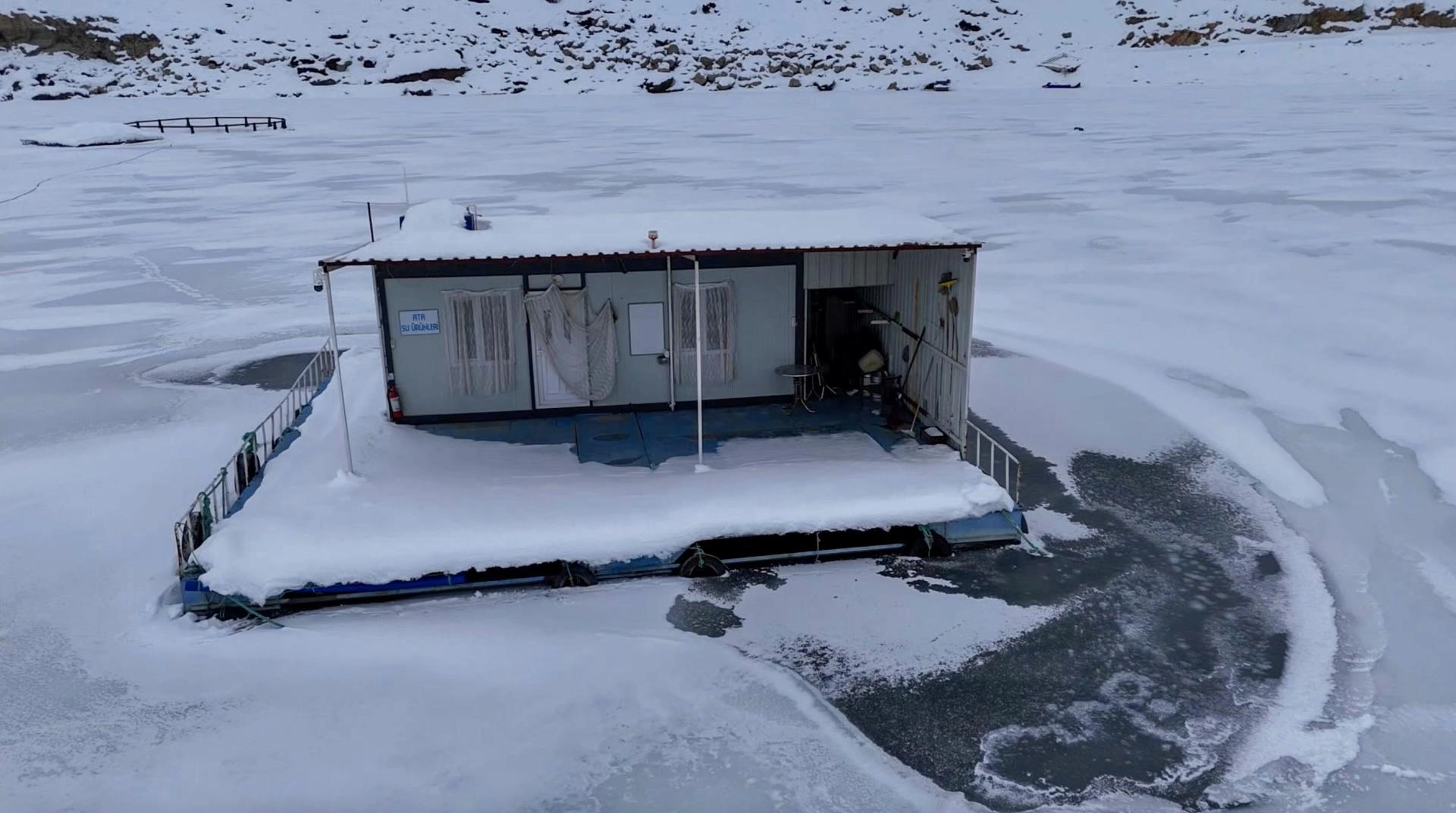Göldeki tekne ve alabalık yetiştirilen kafeslerin de donduğunu aktaran Aktürk, "Çat Barajı'nın donduğunu duyunca bölgeye geldim. Baraj tamamen donmuş. Bu manzarayı yaklaşık 10 yıl önce görmüştük." dedi.