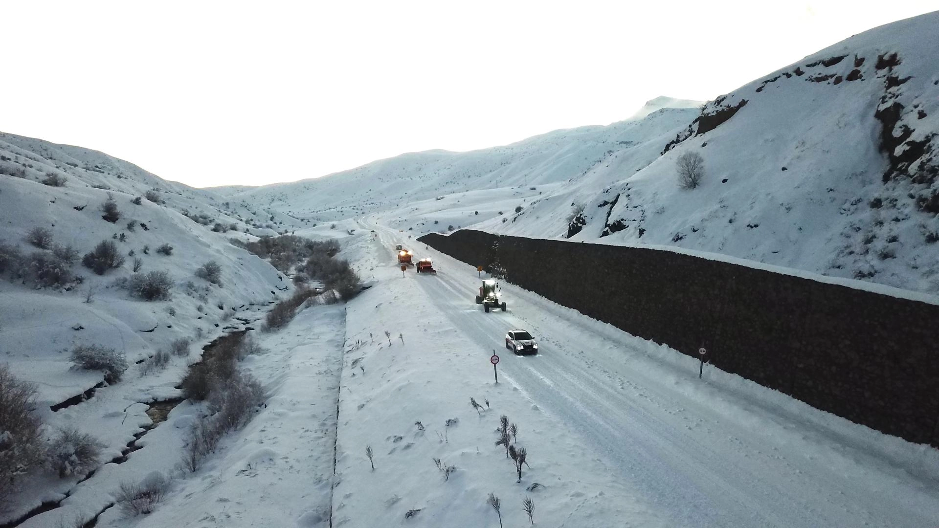 Şube Şefi Osman Ökten'in öncülüğünde yürütülen karla mücadele çalışması, Anadolu Ajansı (AA) ekibince dronla görüntülendi.