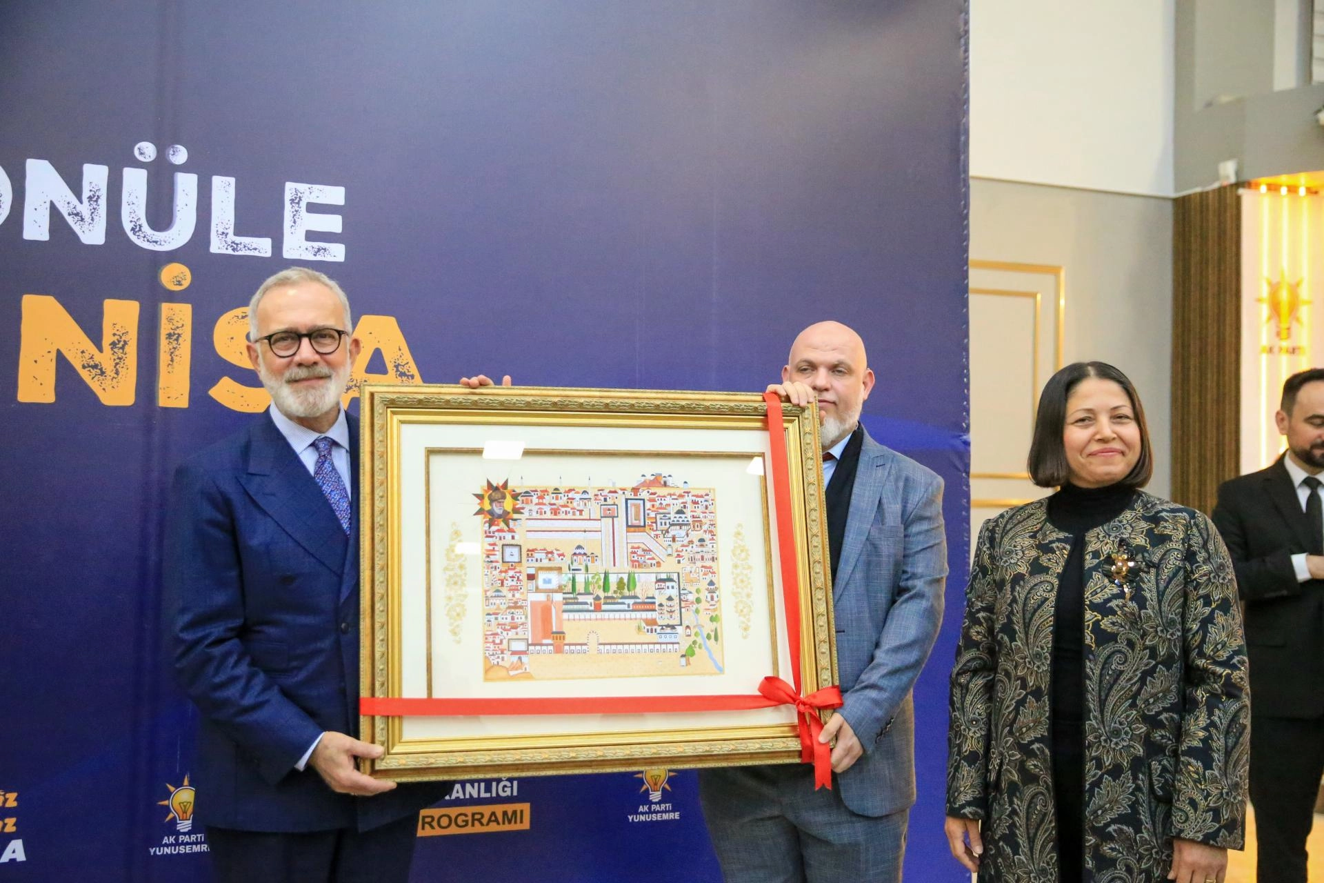 Konuşmanın sonunda sanatçı Suna Ongan, Manisa Saray-ı Amire temalı minyatür çalışmasını Yenişehirlioğlu'na hediye etti.