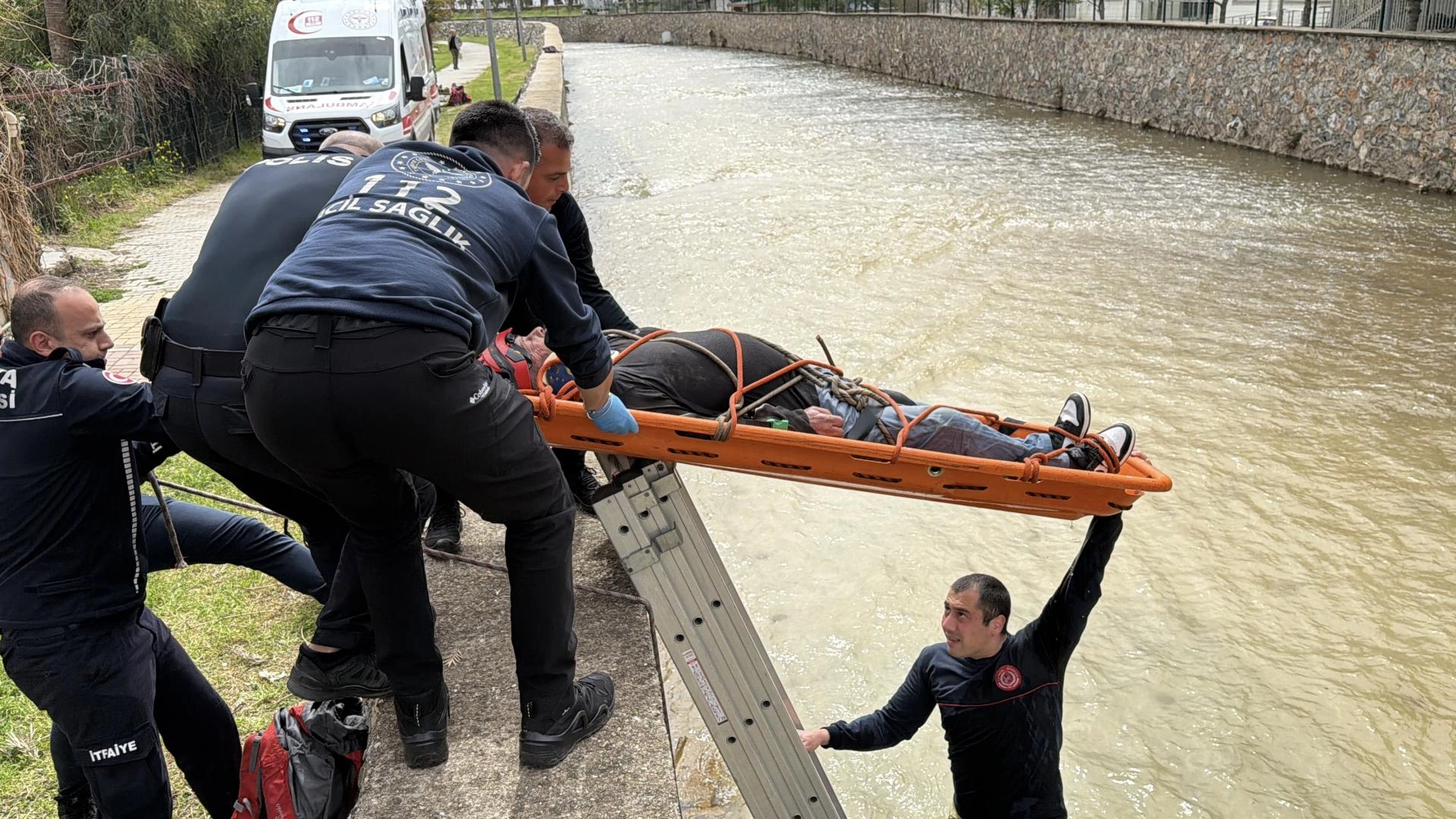 Debisi düşük olan çayın beton zeminine çarparak yaralanan kişi, itfaiye ekibince sarkıtılan merdiven yardımıyla kurtarıldı.