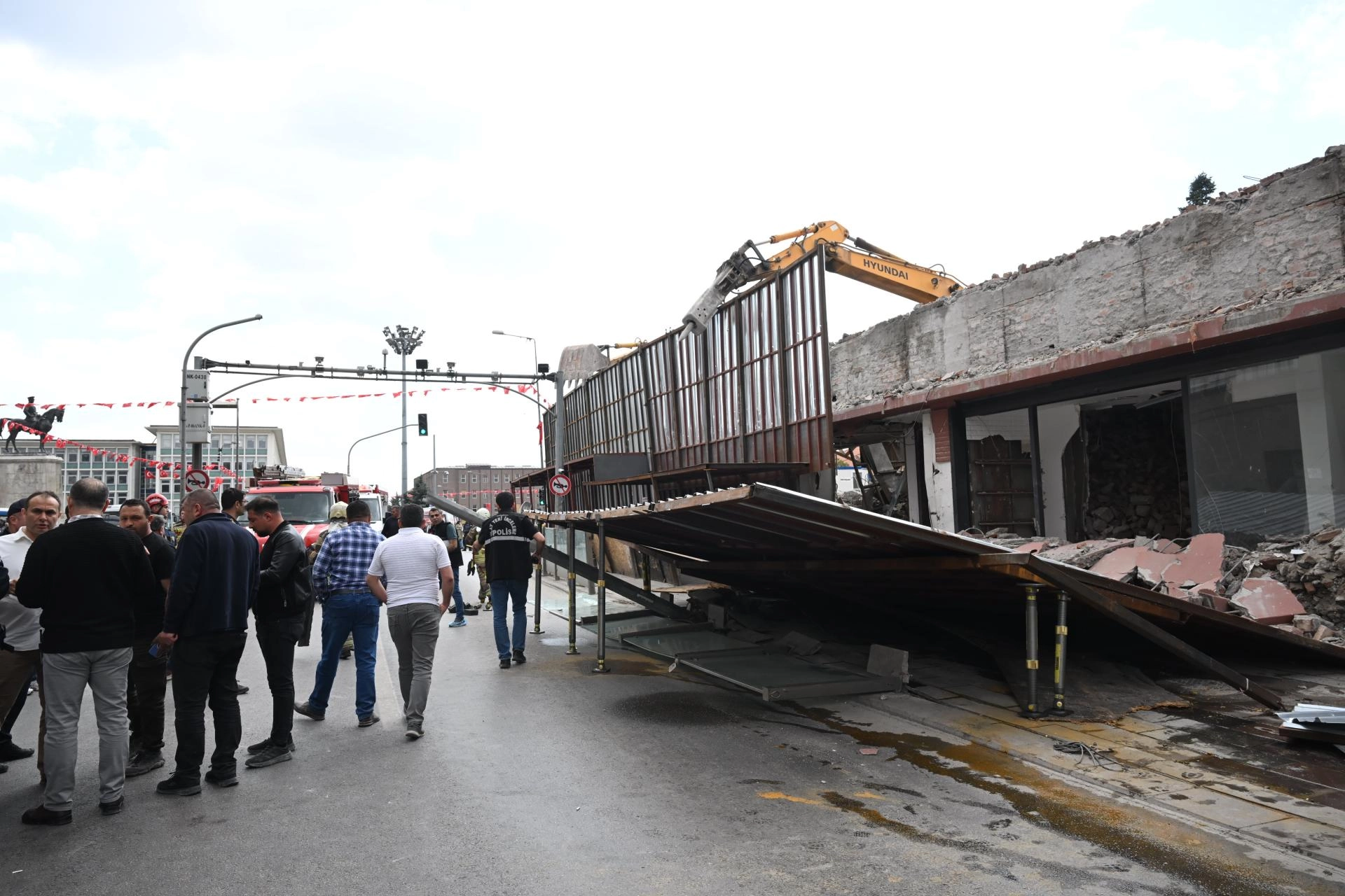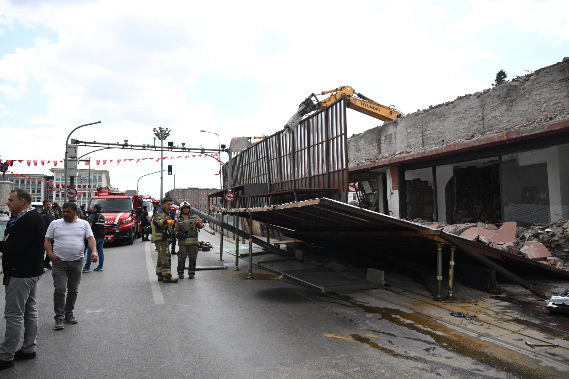 Ulus'ta yıkım çalışmaları yürütüldüğü için etrafı demir koruyucu platformla çevrilen dört katlı binanın platformu yola doğru çöktü.