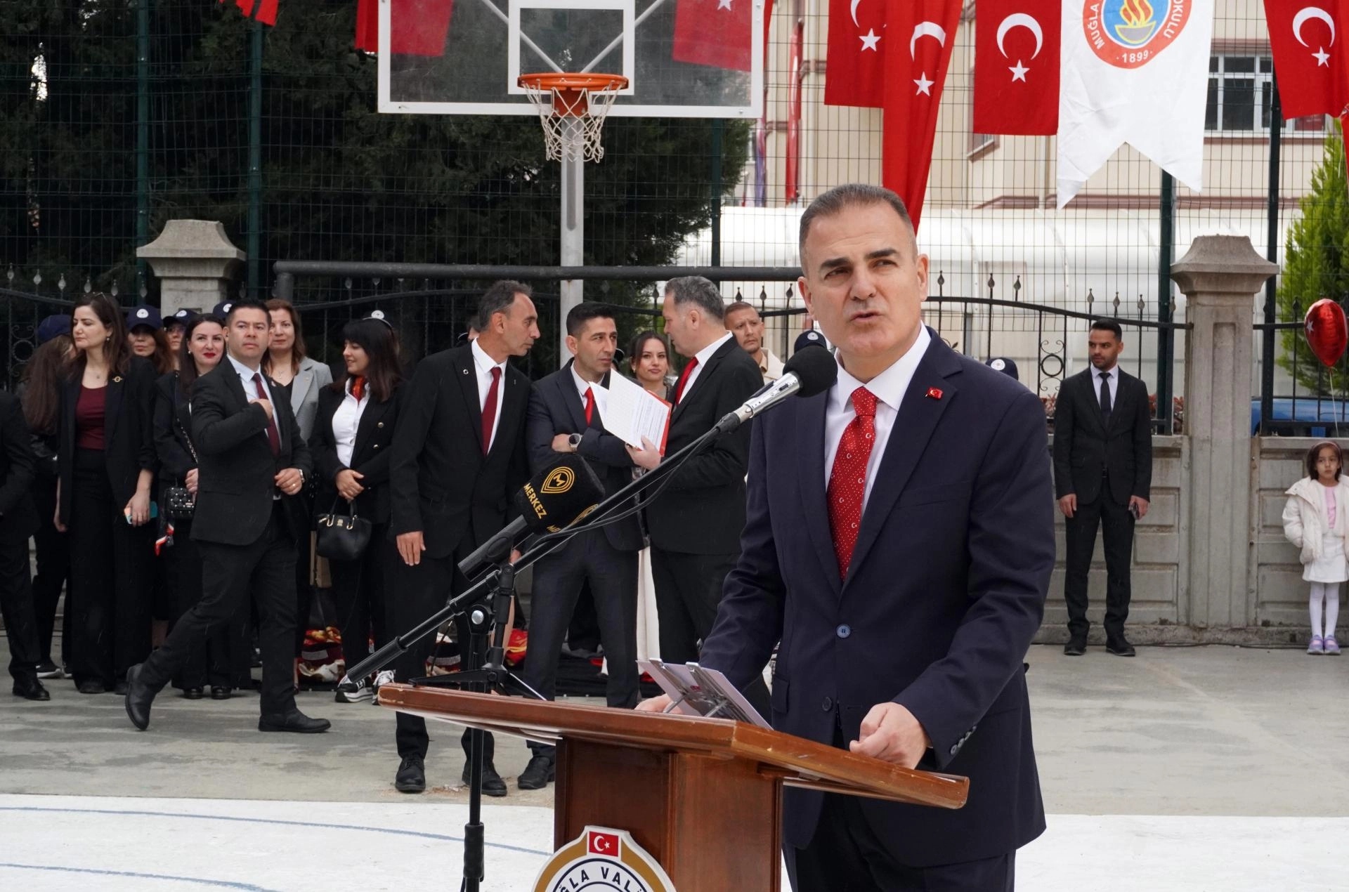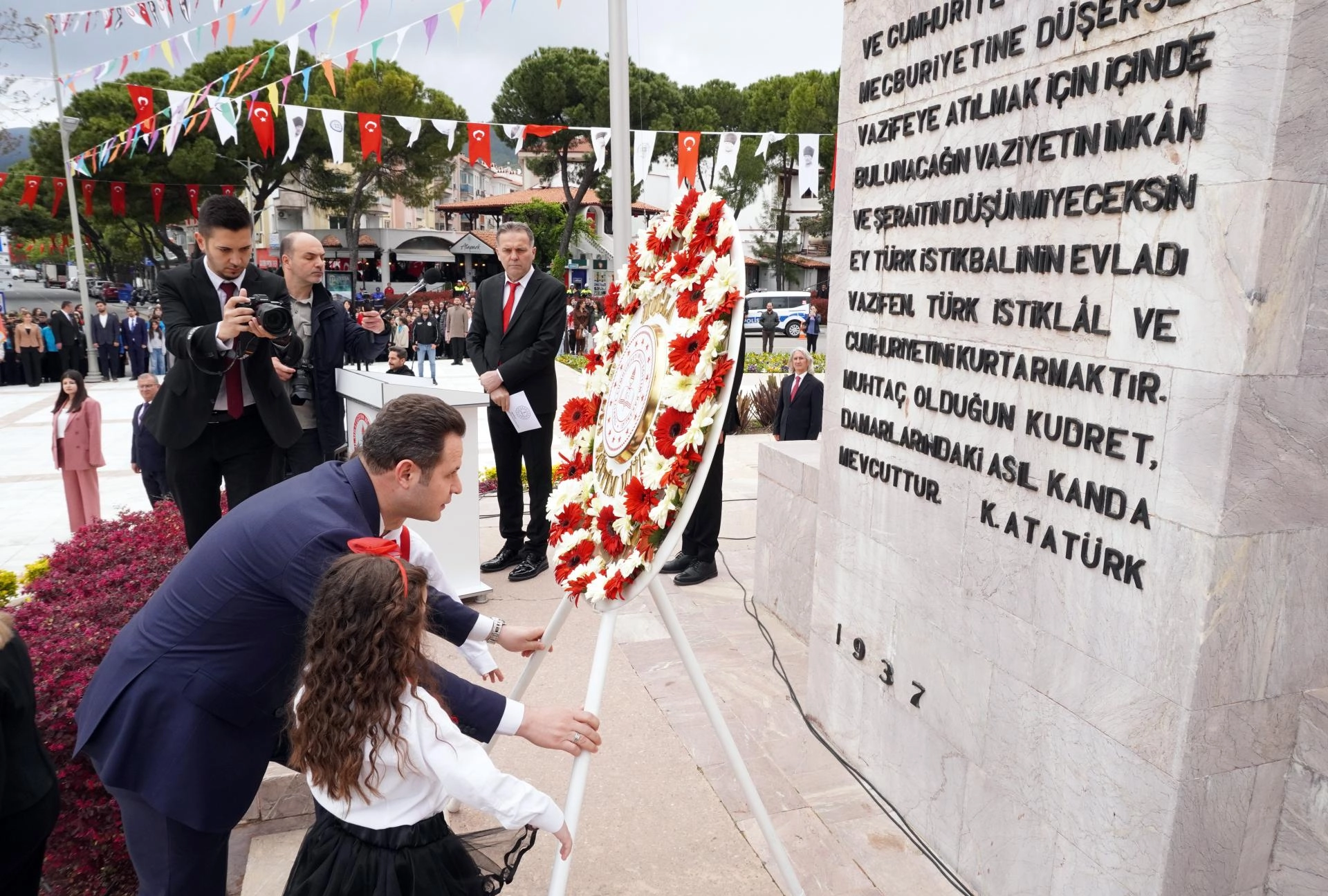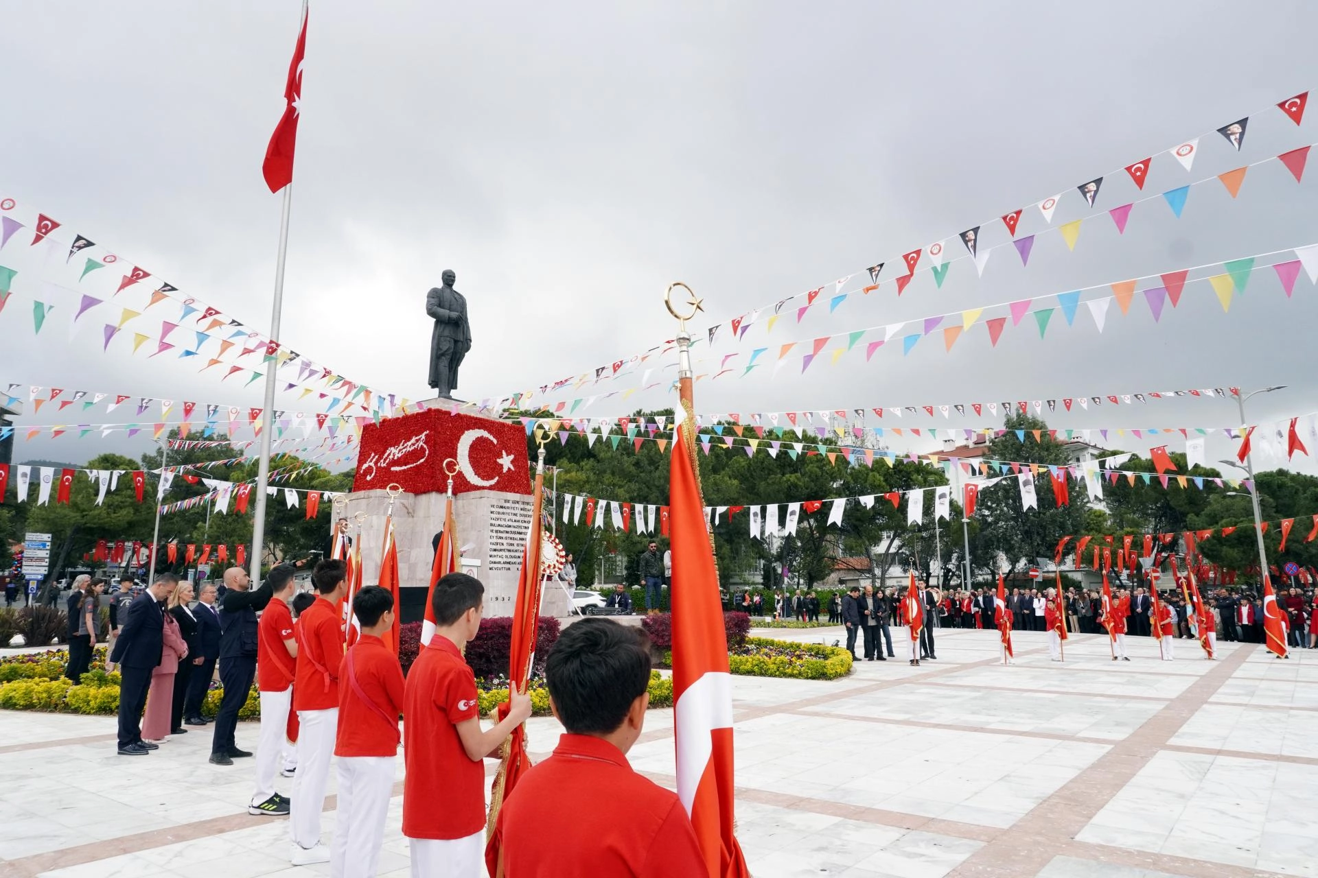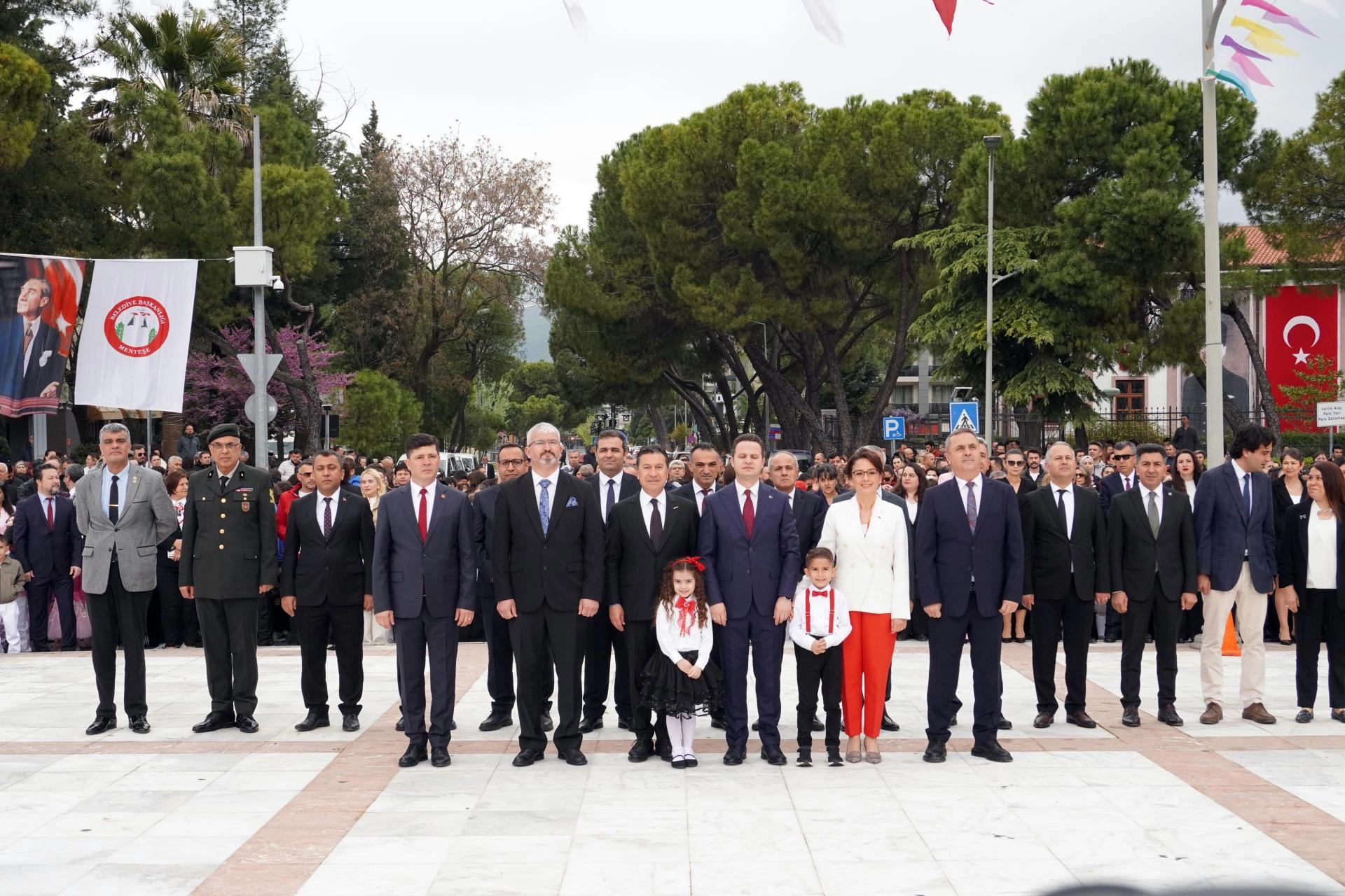 Merkez ilçe Menteşe'de Cumhuriyet Meydanı'ndaki törende, Atatürk Anıtı'na çelenk sunuldu.