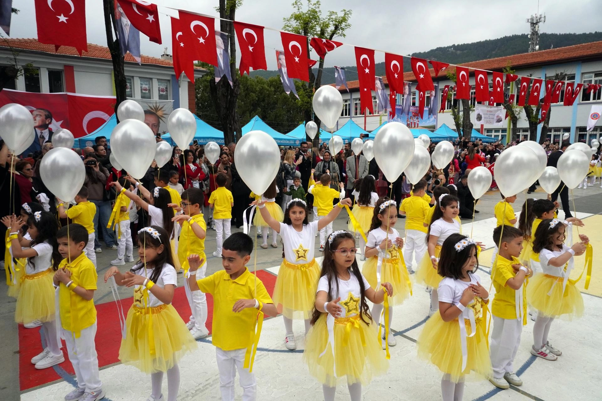 Aksu ilçesine bağlı Çamköy Mahallesi'ndeki Rabiye-Mehmet Ülger İlkokulu'nda 4-B sınıfı öğrencileri, Antalyaspor temalı 23 Nisan gösterisi yaptı.