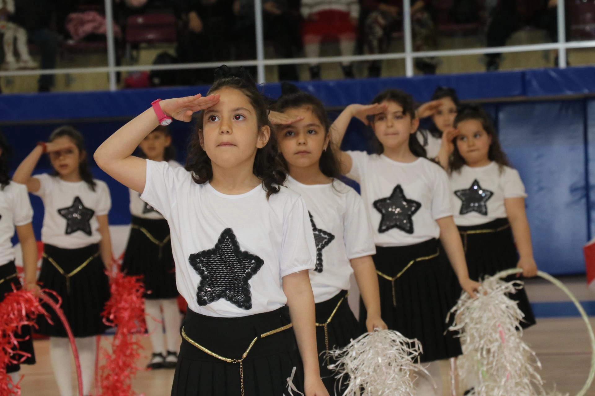 Sınıf öğretmeni Erhan Aynalı öncülüğünde Antalyaspor formaları, kaşkolları giyen, ellerinde de Akdeniz ekibinin bayrağını taşıyan çocukların Antalyaspor marşları eşliğinde yaptığı gösteri ilgiyle izlendi.