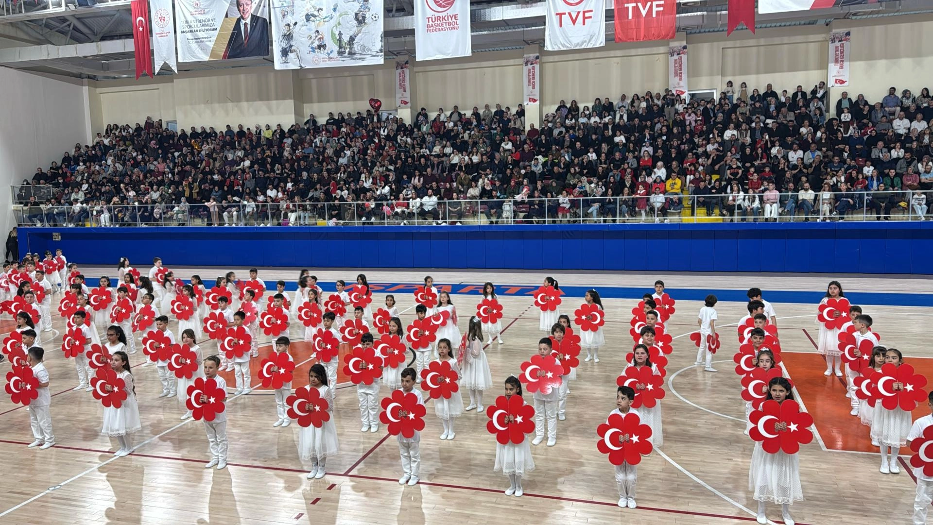 Saygı duruşunda bulunulması ve İstiklal Marşı'nın okunmasının ardından kutlamalar, Işıkkent Spor Salonu'nda devam etti.