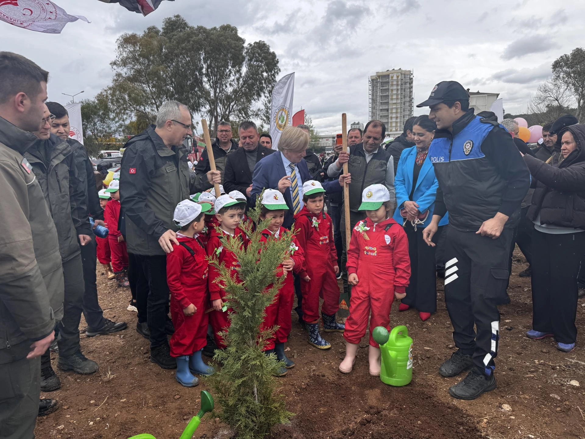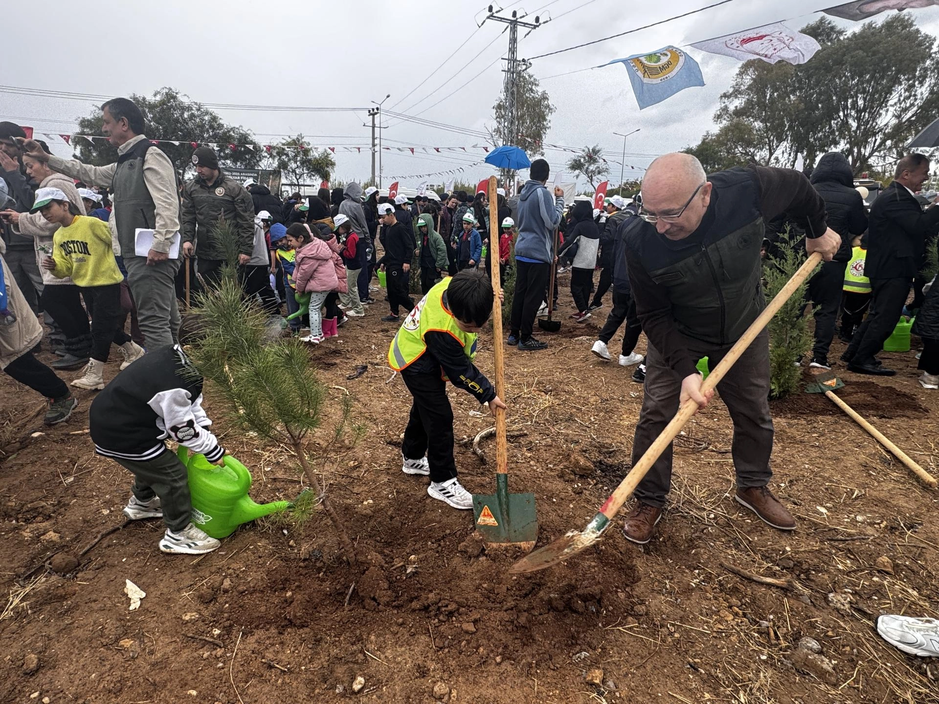 Konuşmaların ardından protokol üyeleri ve öğrenciler, 44 dönümlük alana 25 çeşit fidan dikti.