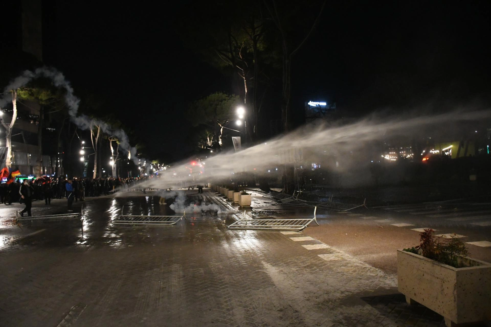 Göstericiler Başbakanlık binasına molotofkokteyli fırlatırken, polis kalabalığa göz yaşartıcı gaz ve tazyikli suyla müdahale etti.