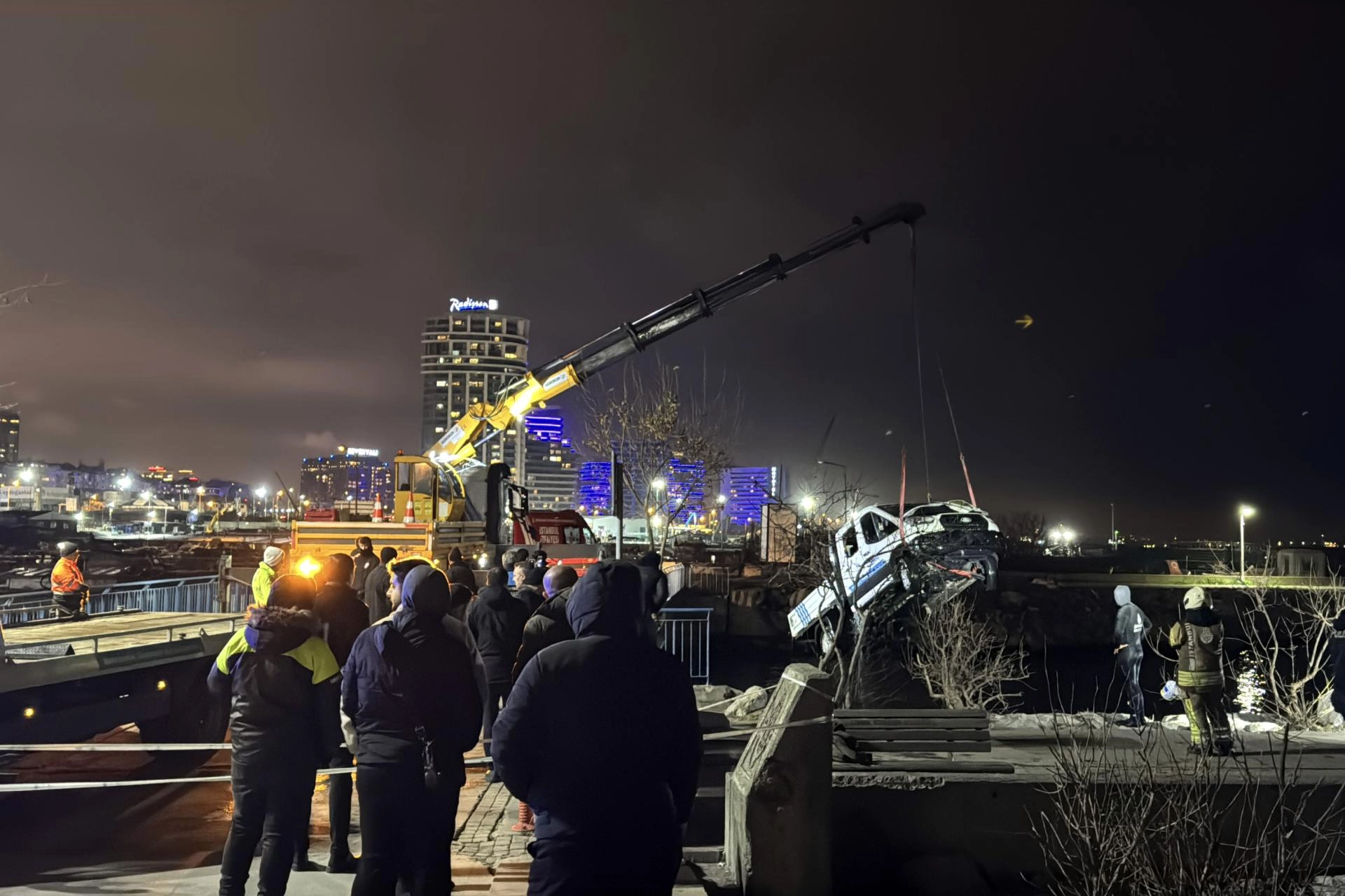 Kamyonet, ekiplerin çalışmasıyla denizden çıkarıldı.