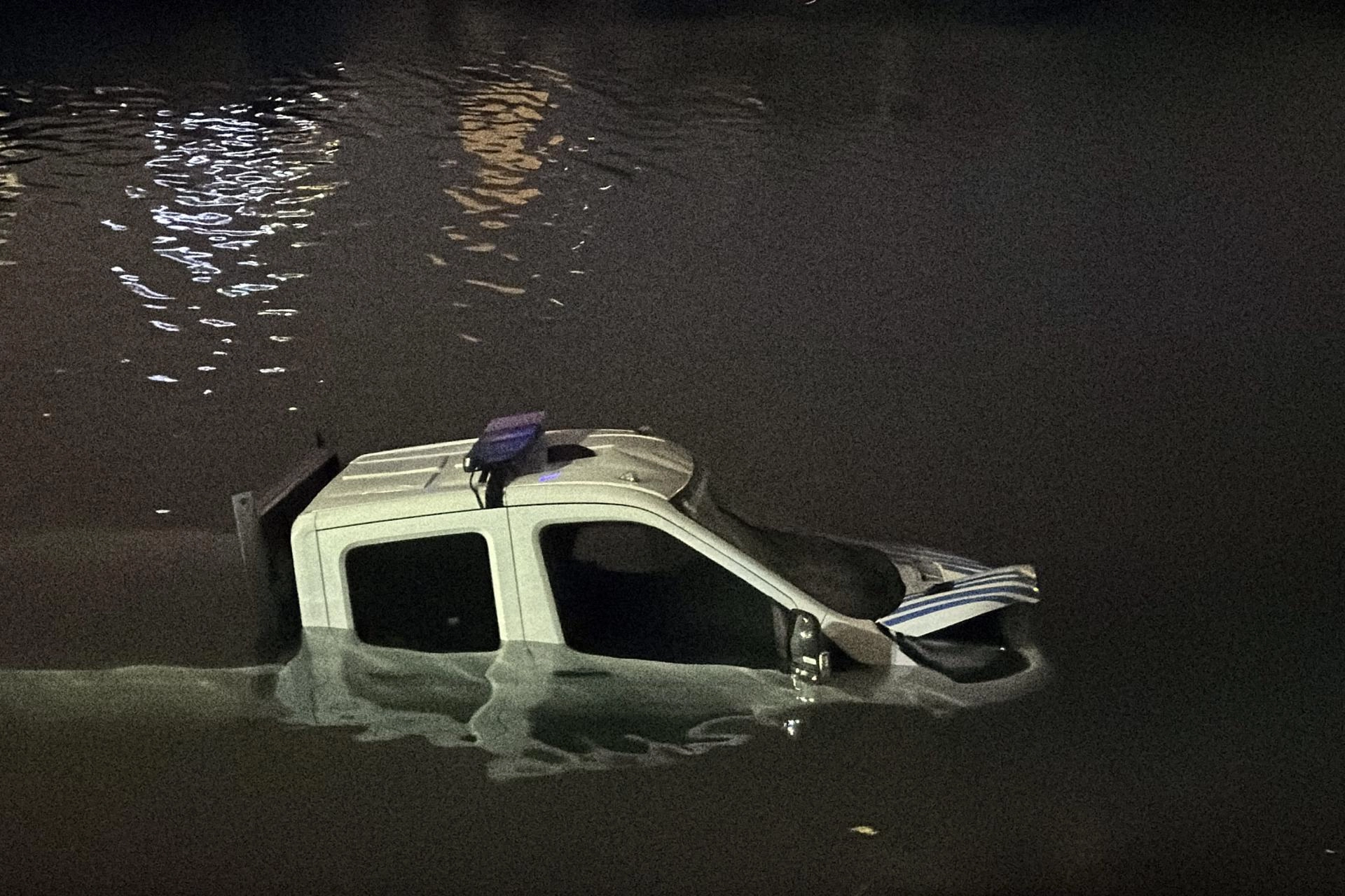 Aracın bir kısmı suya gömülürken, içerisinde bulunan iki zabıta memuru kendi imkanlarıyla denizden çıktı.