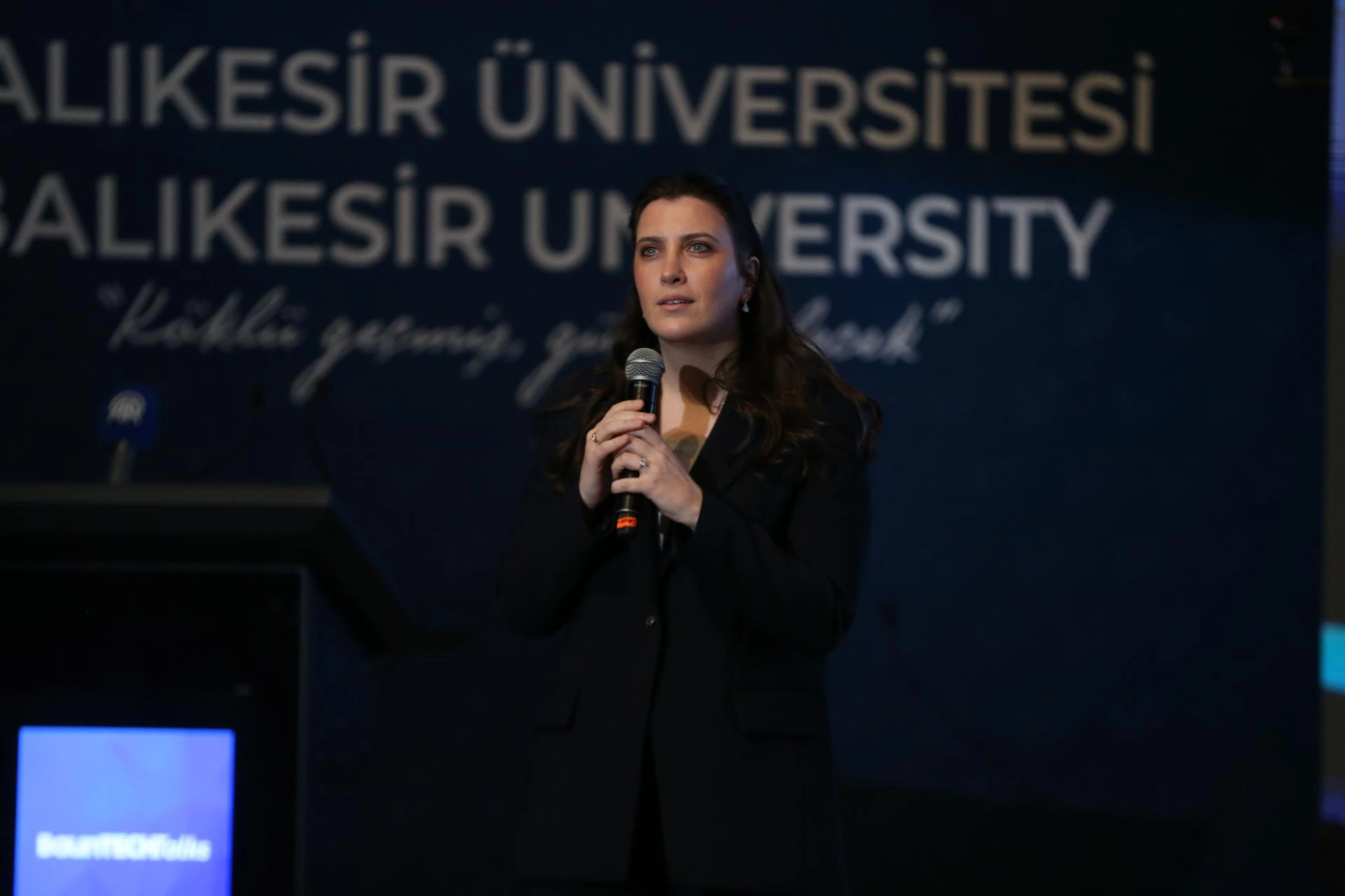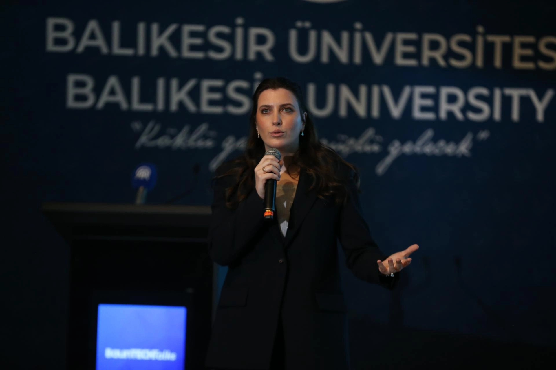 Konuşmanın ardından Balıkesir Üniversitesi Rektörü Prof. Dr. Yücel Oğurlu ve Balıkesir Teknokent Genel Müdürü Öğr. Gör. Burcu Aydemir, İrem Bayraktar Aksakal'a günün anısına hediye takdim etti.