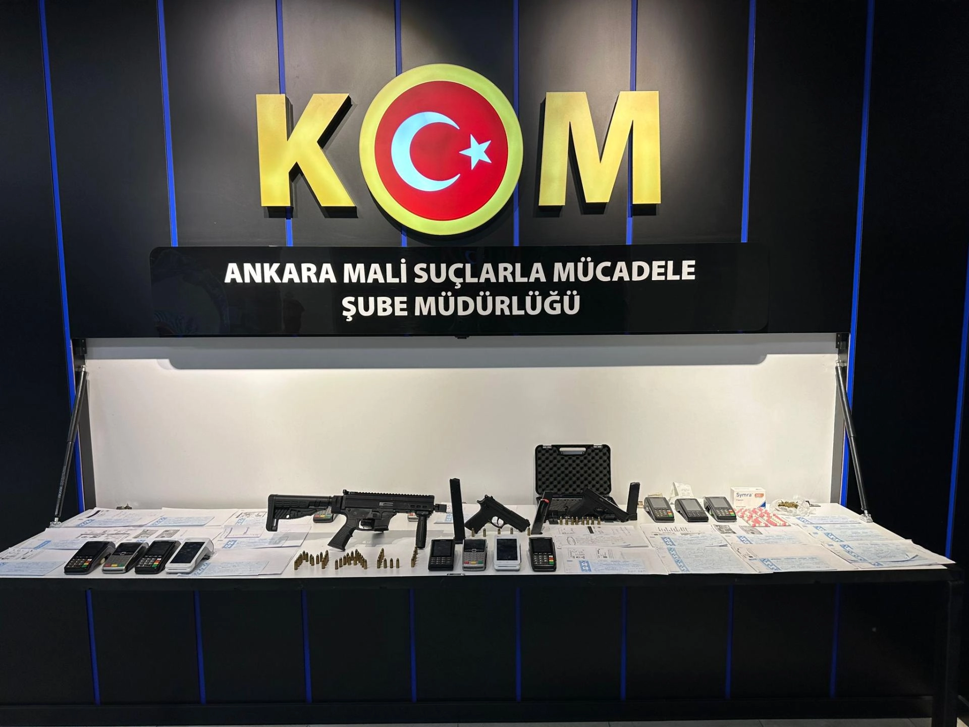 Şüphelilerin, ikamet ve iş yerlerinde yapılan aramalarda ise 1 uzun namlulu silah, 2 tabanca, 5 şarjör, 55 fişek, 84 senet, 15 POS cihazı, başka kişilere ait 12 kredi kartı, 7 doküman, bir miktar esrar ve 56 adet uyuşturucu hap ele geçirildi.