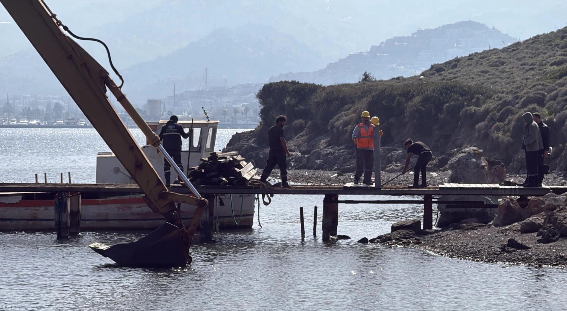 Bölgeye gelen ekipler, bir sabit kaçak iskele ile bir yüzer iskelenin kaldırılması için çalışma yürüttü. Eski deve güreşi alanının bulunduğu sahildeki iskelenin tahtaları sökülürken, yüzer platform üzerindeki iş makinesiyle yıkım işlemi tamamlandı.