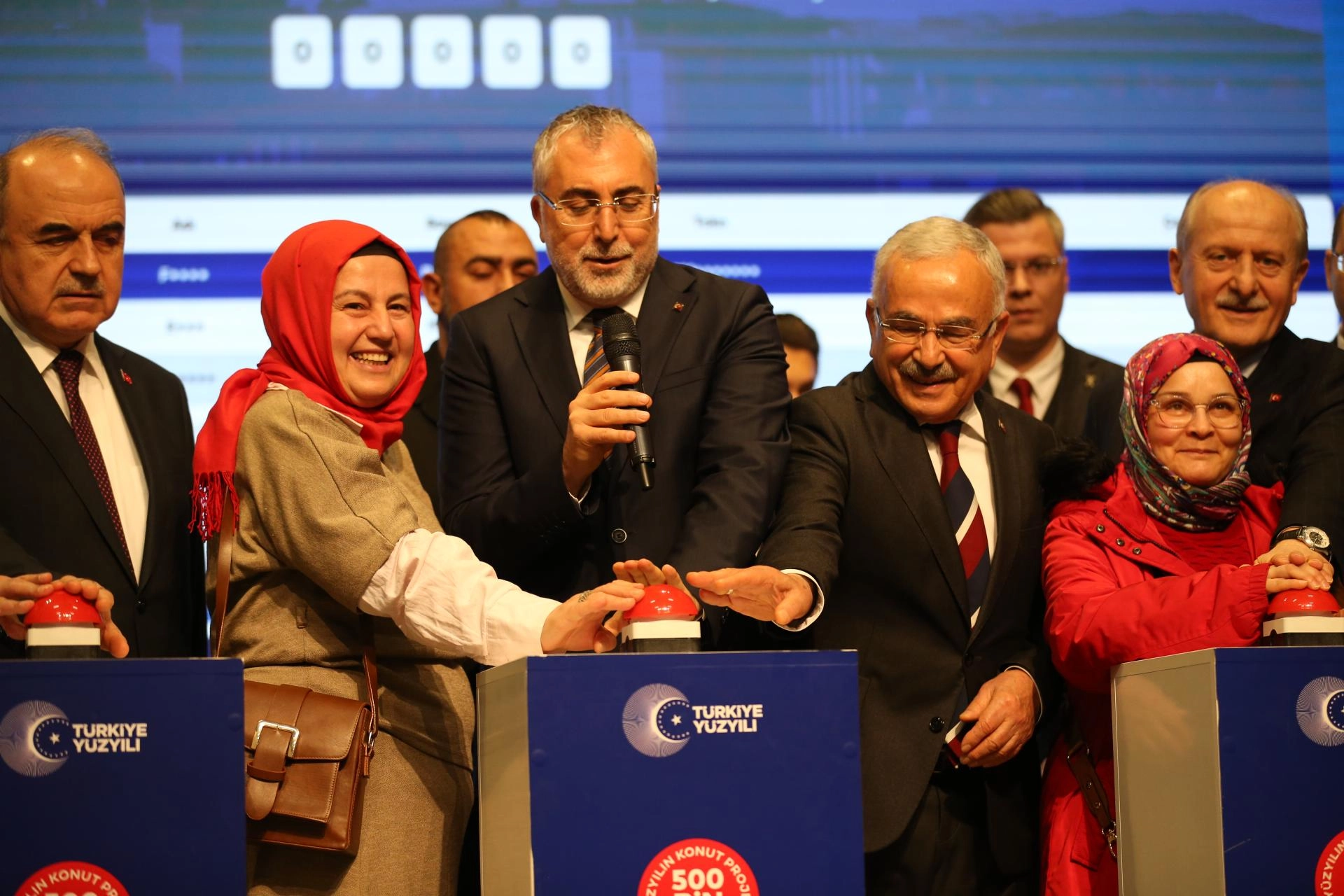 Konuşmaların ardından Bakan Işıkhan ve beraberindeki heyet, noter huzurunda TOKİ konutlarının kura çekilişi için butona bastı.