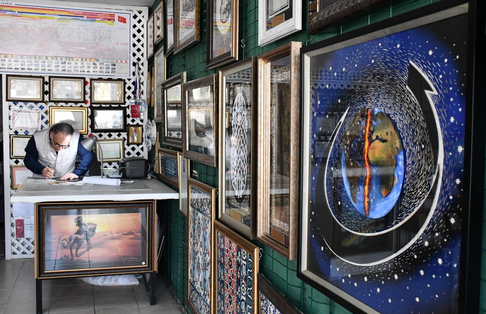 DÜZCE (AA) - GÖKSEL CÜNEYT İĞDE - Düzce'de yaşayan Hayrullah Altay, sanatın gücünden faydalanarak kat'ı, yağlı boya ve rölyef tekniğiyle ortaya çıkardığı eseriyle savaşlara ve çevre sorunlarına dikkati çekiyor.
