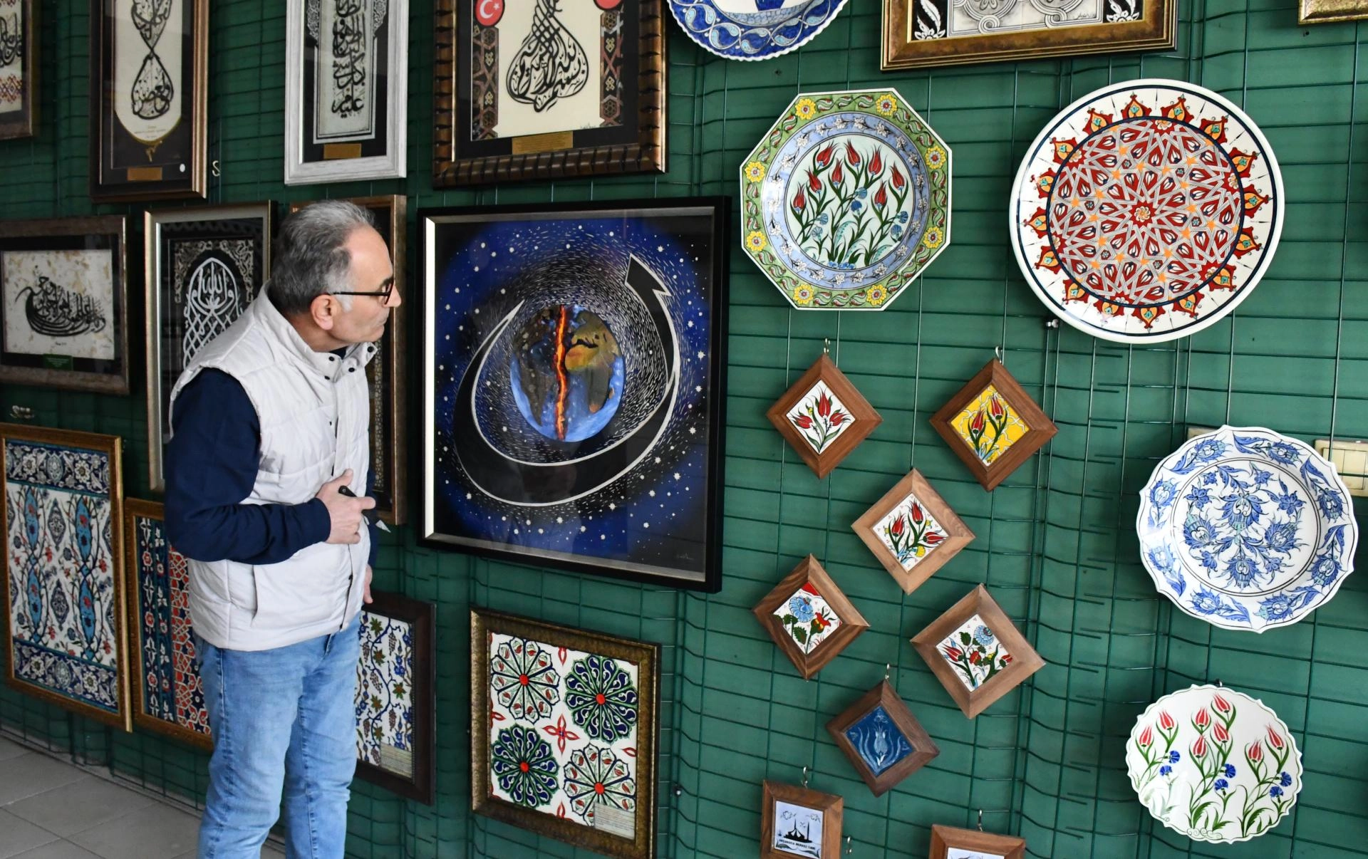 Altay, çalışmasında dünyayı, Arap alfabesindeki "nun" harfiyle çevrelediğini dile getirerek, "Bu da yerkürenin aslında ilahi bir yörünge etrafında dönmesini anlatıyor. Arka fondaki uzay boşluğu da kozmik alemde dünyanın çok az bir yer kapladığını, insanın kendi sorumluluğunun mutlak otoriteye bağlanırsa ancak düzgün yöne gideceğini anlatıyor. Bu, benim ve dünyanın, yer kürenin sessiz çığlığı. Bu, dünyanın kötü gidişatına estetik bir itiraz." ifadelerini kullandı.
