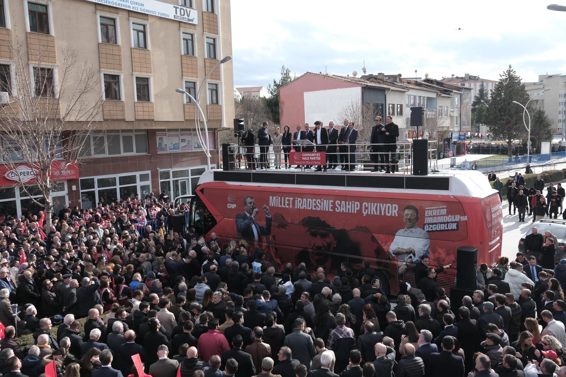 Seçimlerde 47 yıl sonra birinci parti olduklarını belirten Özel, "Biz demokrasi fikrinin insanlarıyız. Bugün mücadele Türkiye'de sandığa güvenenlerle sandıktan kaçınanlar arasındadır. Bugün Türkiye'de mücadele otokrasiyle demokrasi arasındadır. Bugün mücadele millete, emekliye, emekçiye kulak tıkayanlar, sırt dönenlerle onlar için mücadele edenler arasındadır. Daha önce AK Parti'ye, MHP'ye oy vermiş olsa da Çorum'un güzel insanlarına sesleniyorum. Artık yürüyüş 100 yıl önce olduğu gibi bir kez daha birlikte yürüyüş zamanıdır. Artık renklerini ay yıldızlı albayraktan alan Türkiye İttifakı'nda birleşme zamanıdır." diye konuştu.
