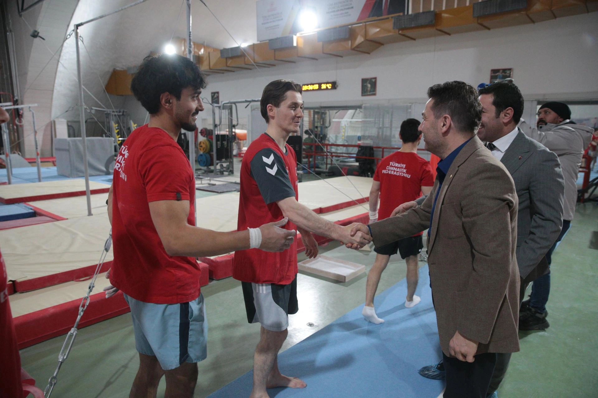 Bolu'da kamp yapan Artistik Cimnastik Erkek Milli Takımı'nı ziyaret eden Çelen, Gençlik ve Spor İl Müdürü Emrullah Güler ile Karaçayır Mahallesi'nde bulunan Murat Canbaş Cimnastik Salonu'ndaki kamp çalışmalarını yerinde inceledi.