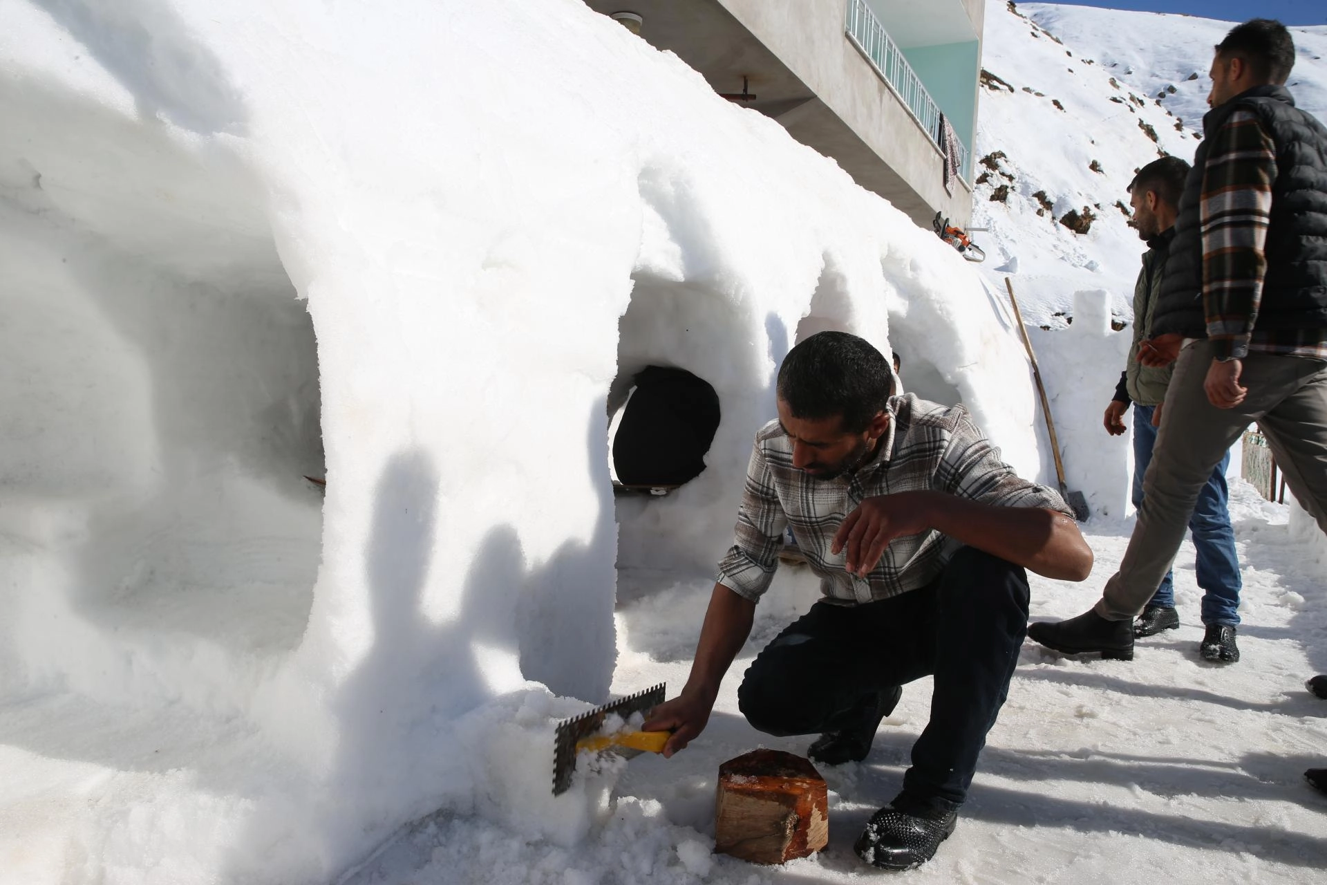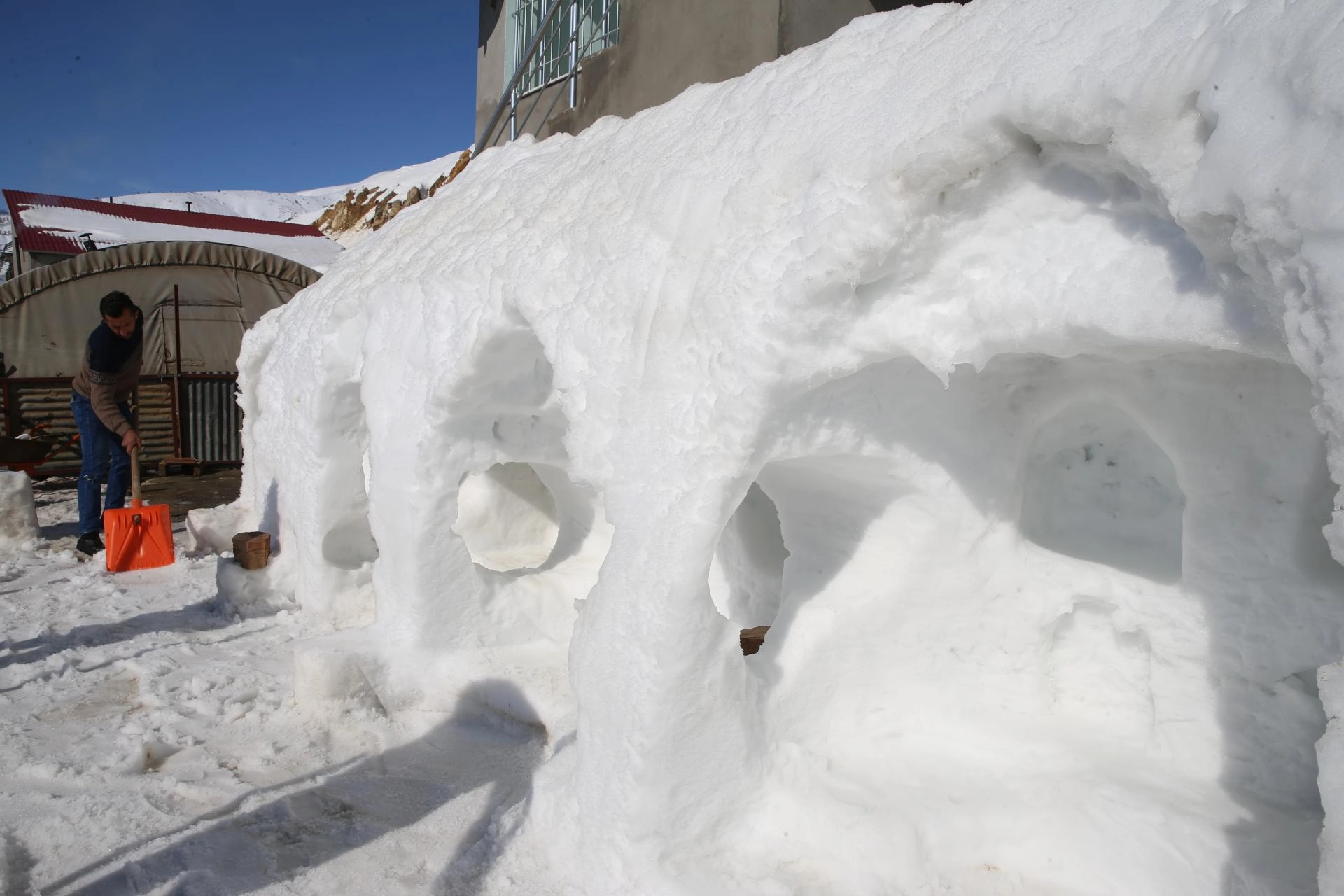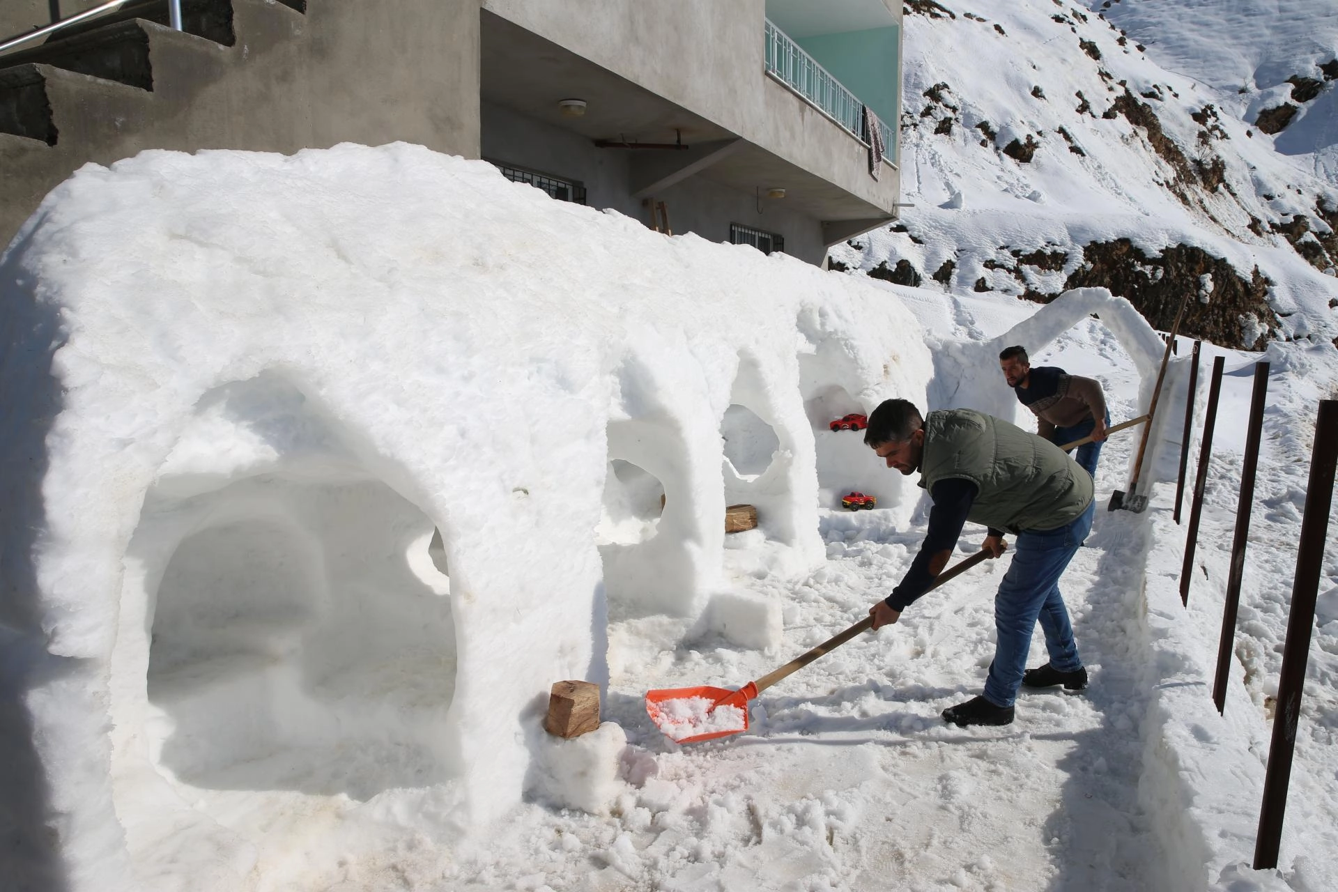 Kar kalınlığının 2 metreye ulaştığı köyde Bozdemir, 2 katlı evinin bahçesine kürek, mala ve çeşitli inşaat malzemeleriyle kardan oyun grubu oluşturdu.