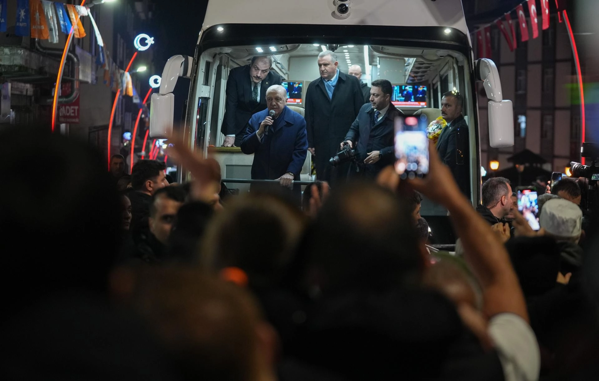 Merkez Camisi önünde kendisini bekleyen hemşehrilerini eşi Emine Erdoğan ile selamlayan Cumhurbaşkanı Erdoğan, makam aracından inerek, otobüse geçti.