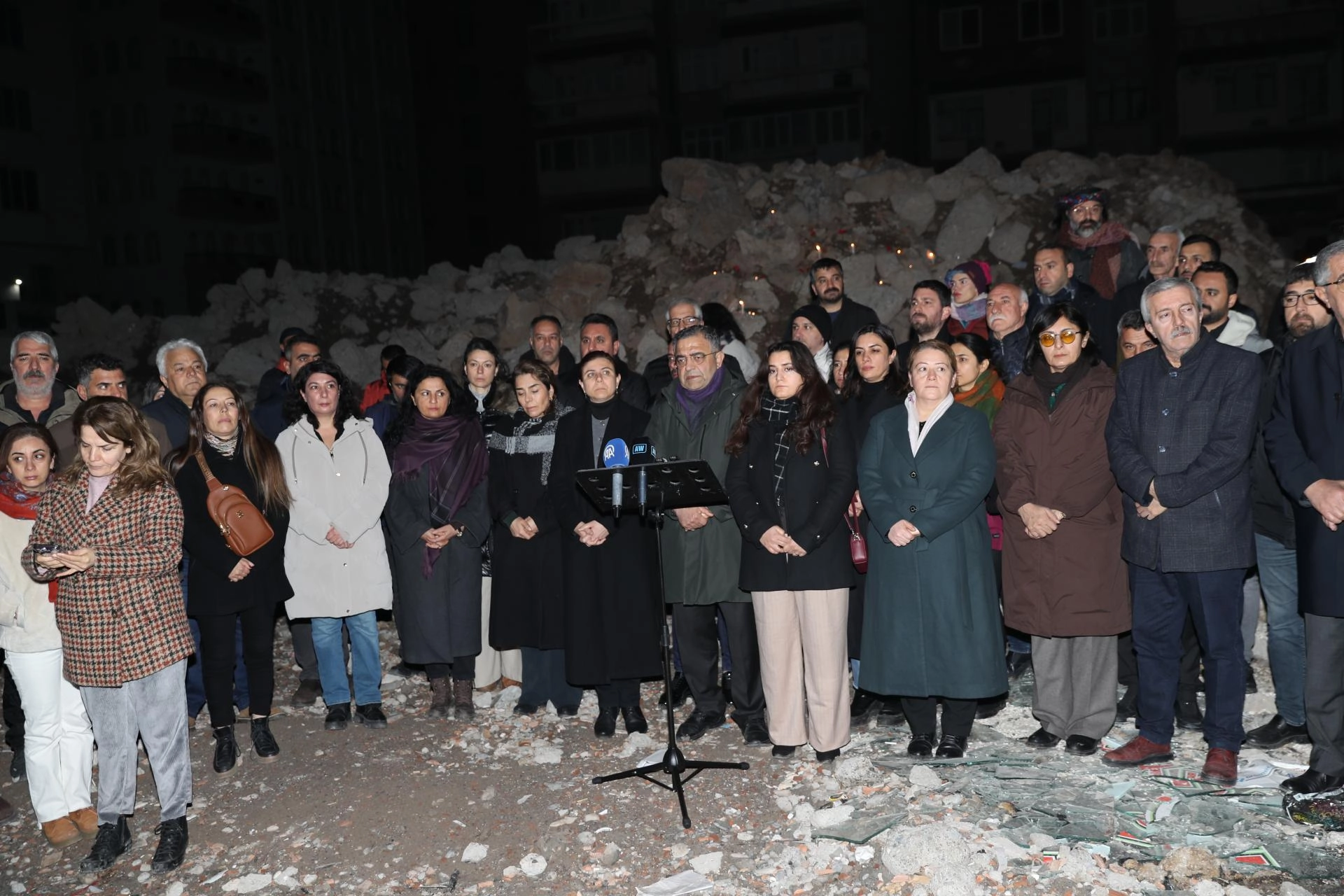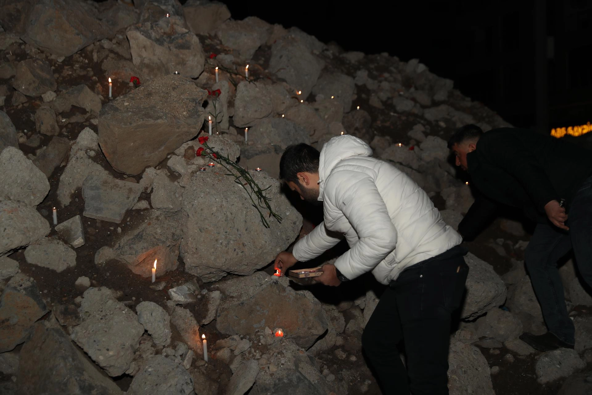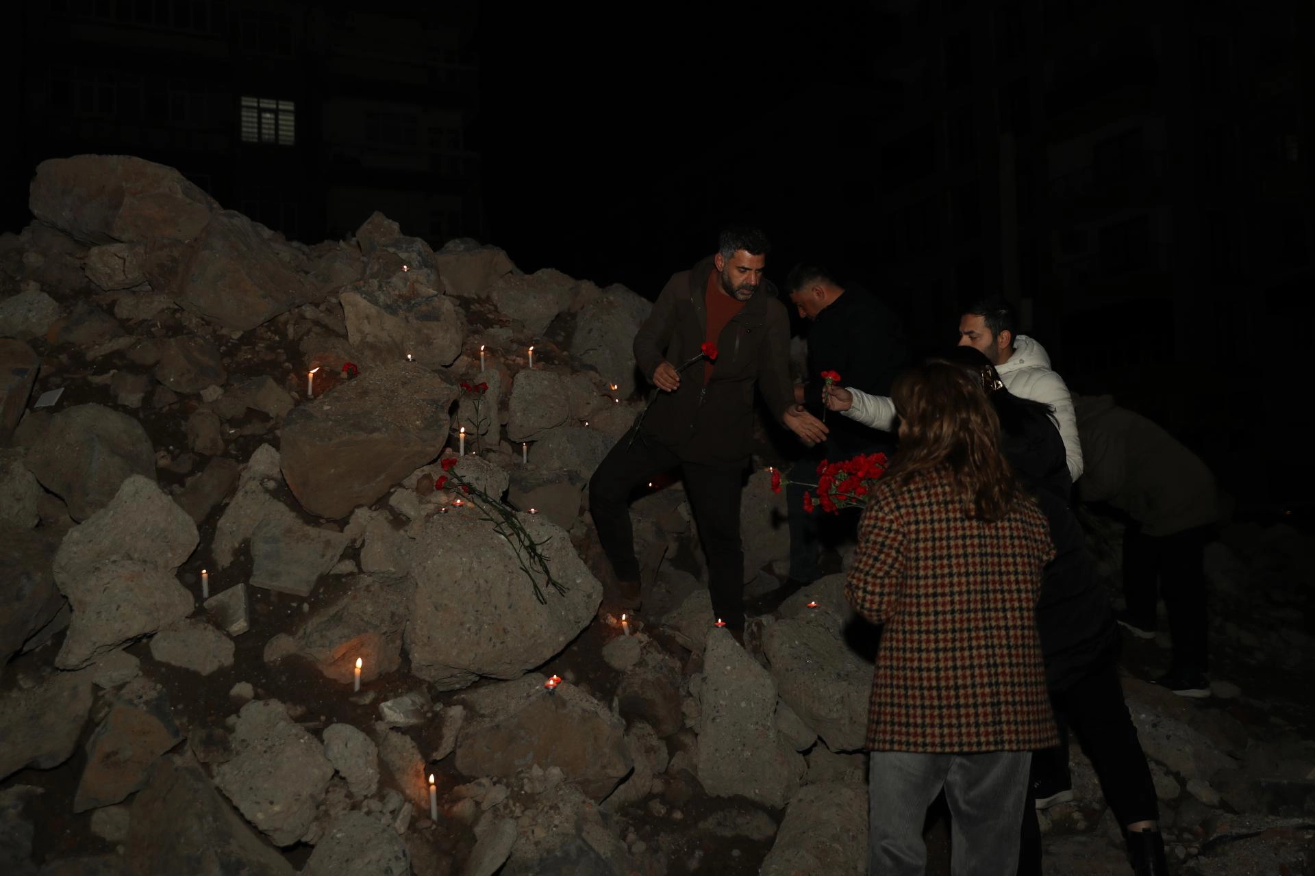 Kahramanmaraş merkezli depremlerde merkez Yenişehir ilçesine bağlı Kooperatifler Mahallesi'ndeki Kurtismailpaşa 2'nci Sokak'ta 48 kişinin hayatını kaybettiği Sözel Apartmanı'nın önüne gelenler, yaktıkları mumlar ile karanfilleri saat 04.17'de alana bıraktı.