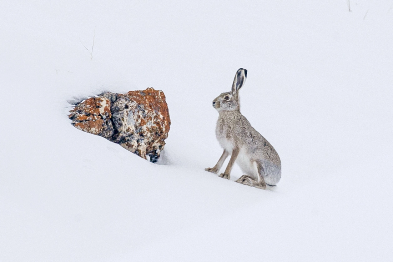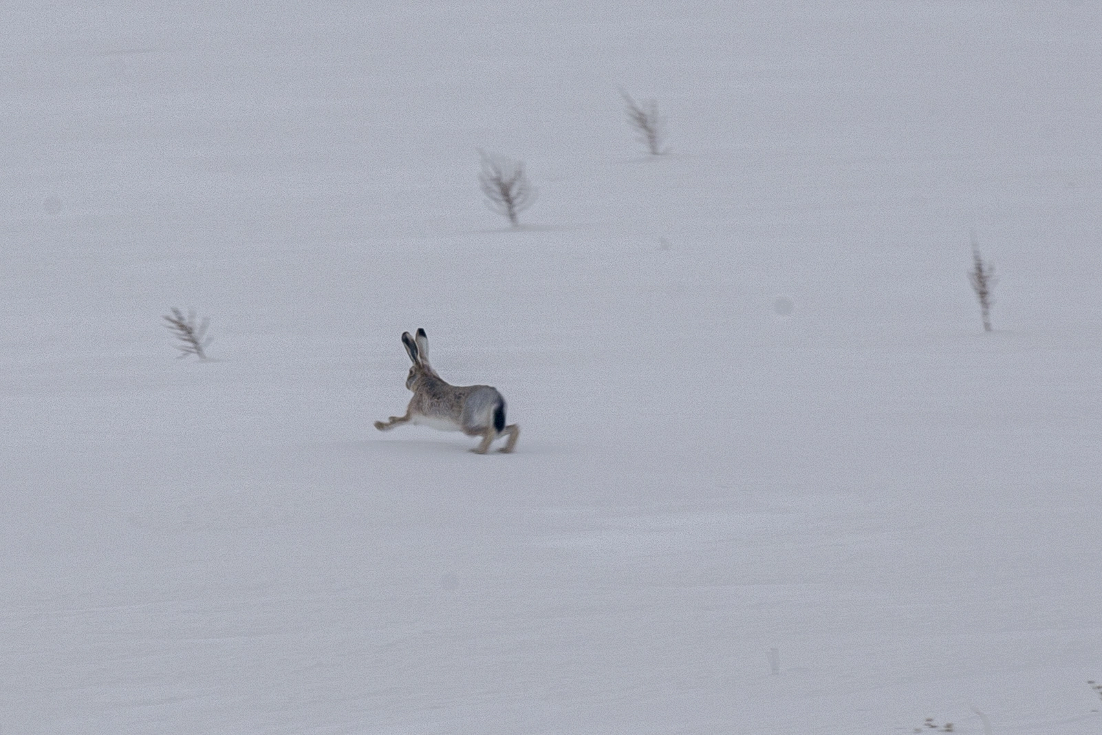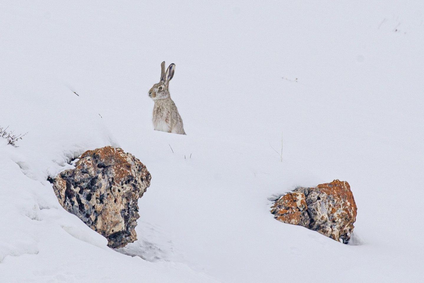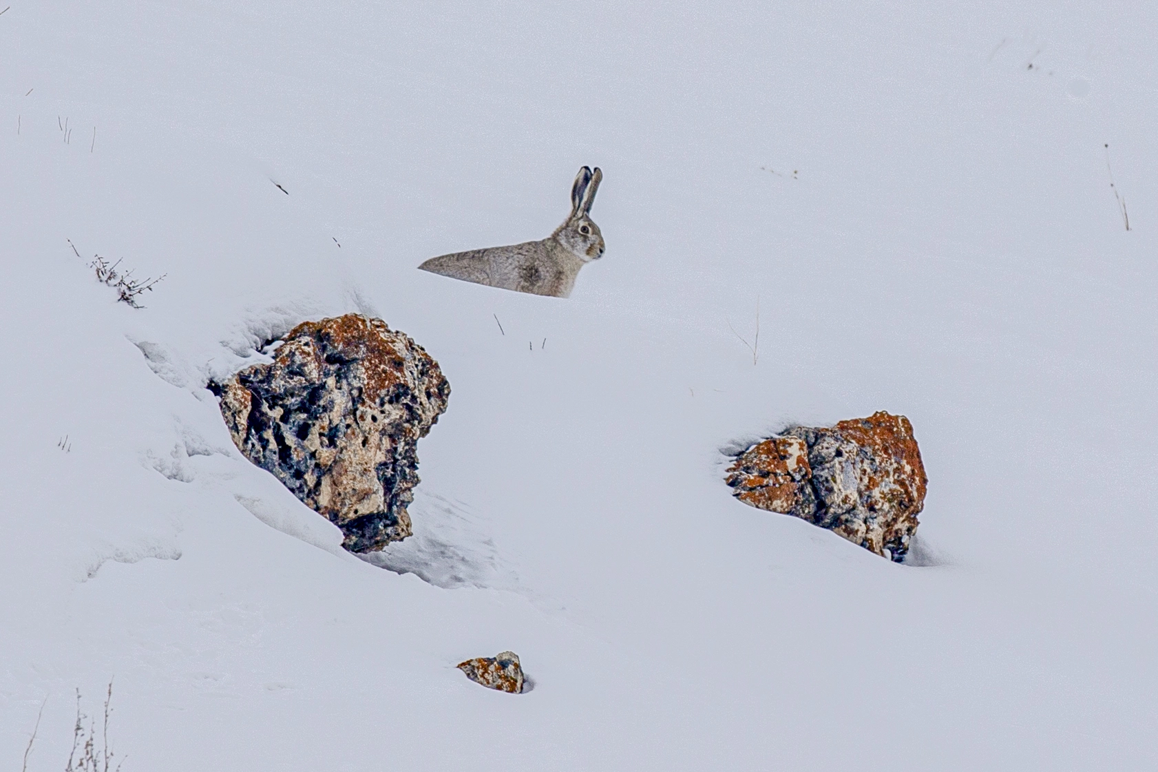 İlçenin karla kaplı Kazbel Mahallesi'nde de yaban tavşanı, karlı arazide yiyecek ararken görüntülendi.