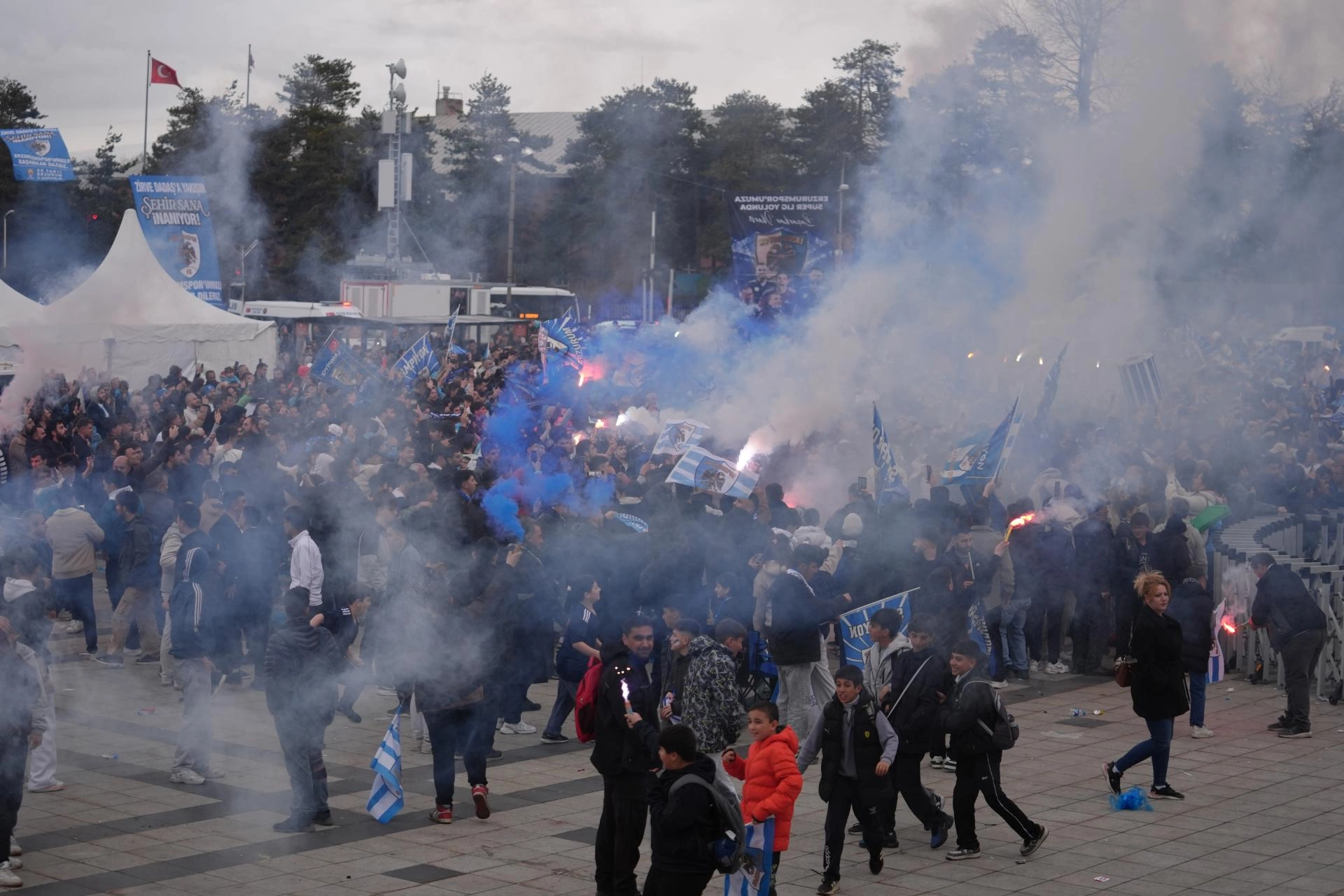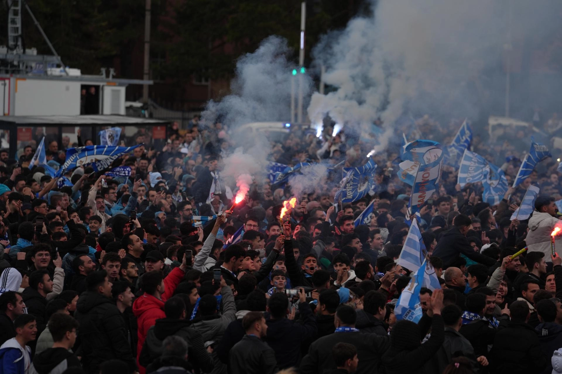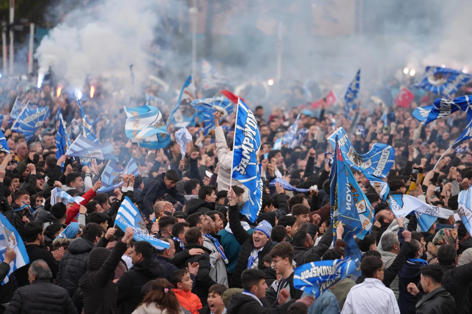 Ellerinde bayraklarla tezahüratlar yapan taraftarlar, halay çekti. Bazı taraftarlar ise Cumhuriyet Caddesi'nden araçlarıyla konvoy yaptı, korna çalarak şehri turladı.