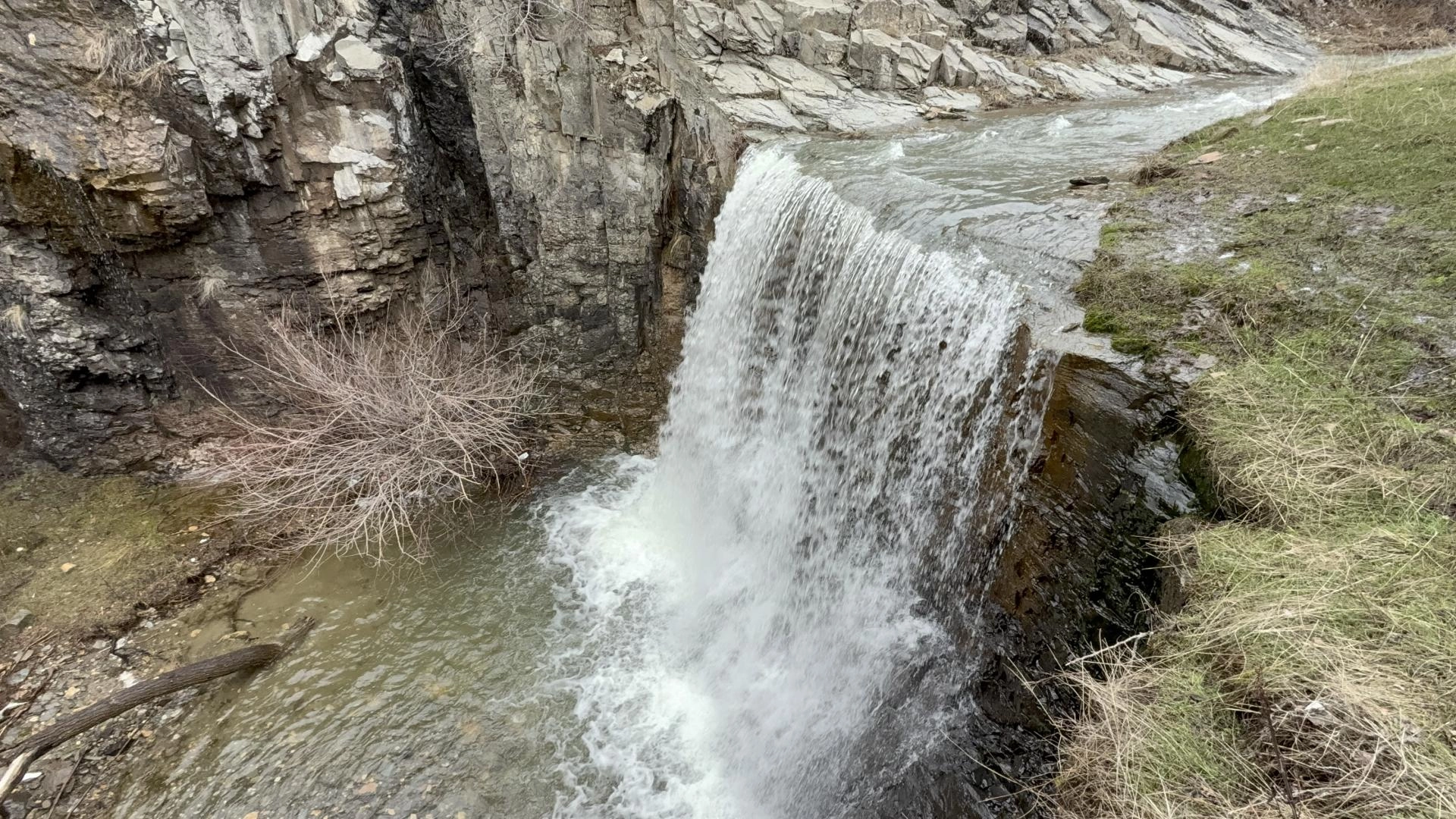 Eriyen kar suları ve yağmurun ardından yeniden akmaya başlayan şelale dronla görüntülendi.