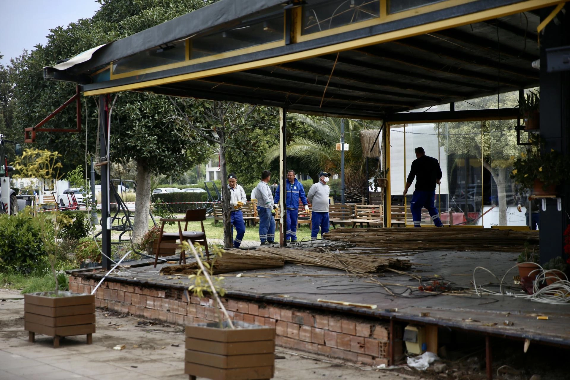 Fethiye Belediyesi ekipleri, yasal işlemlerin tamamlanmasının ardından kafe ve restoranlara ait ruhsatsız ya da imar planına aykırı yapıların kaldırılması için çalışma başlattı.