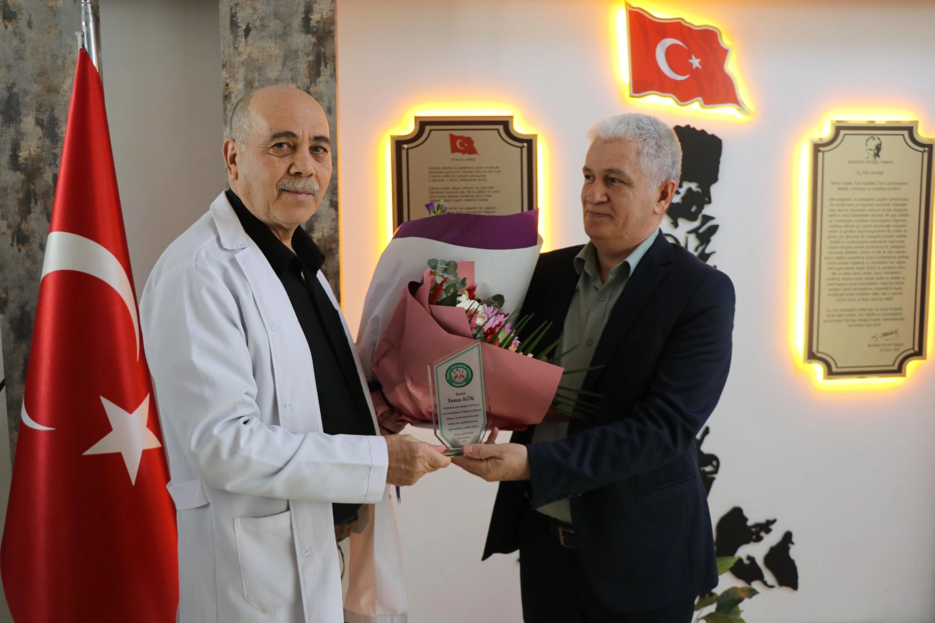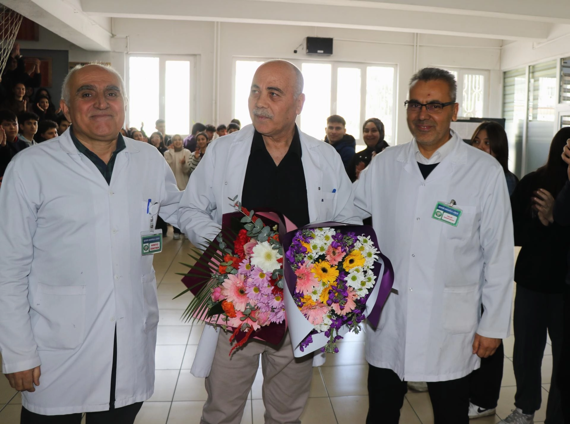 Öğretmenler odasından bina kapısına kadar öğrencilerinin arasından alkışlarla yürüyen Kök'e, hem öğrencisi hem de meslektaşı olan öğretmenler tarafından çiçek verildi.