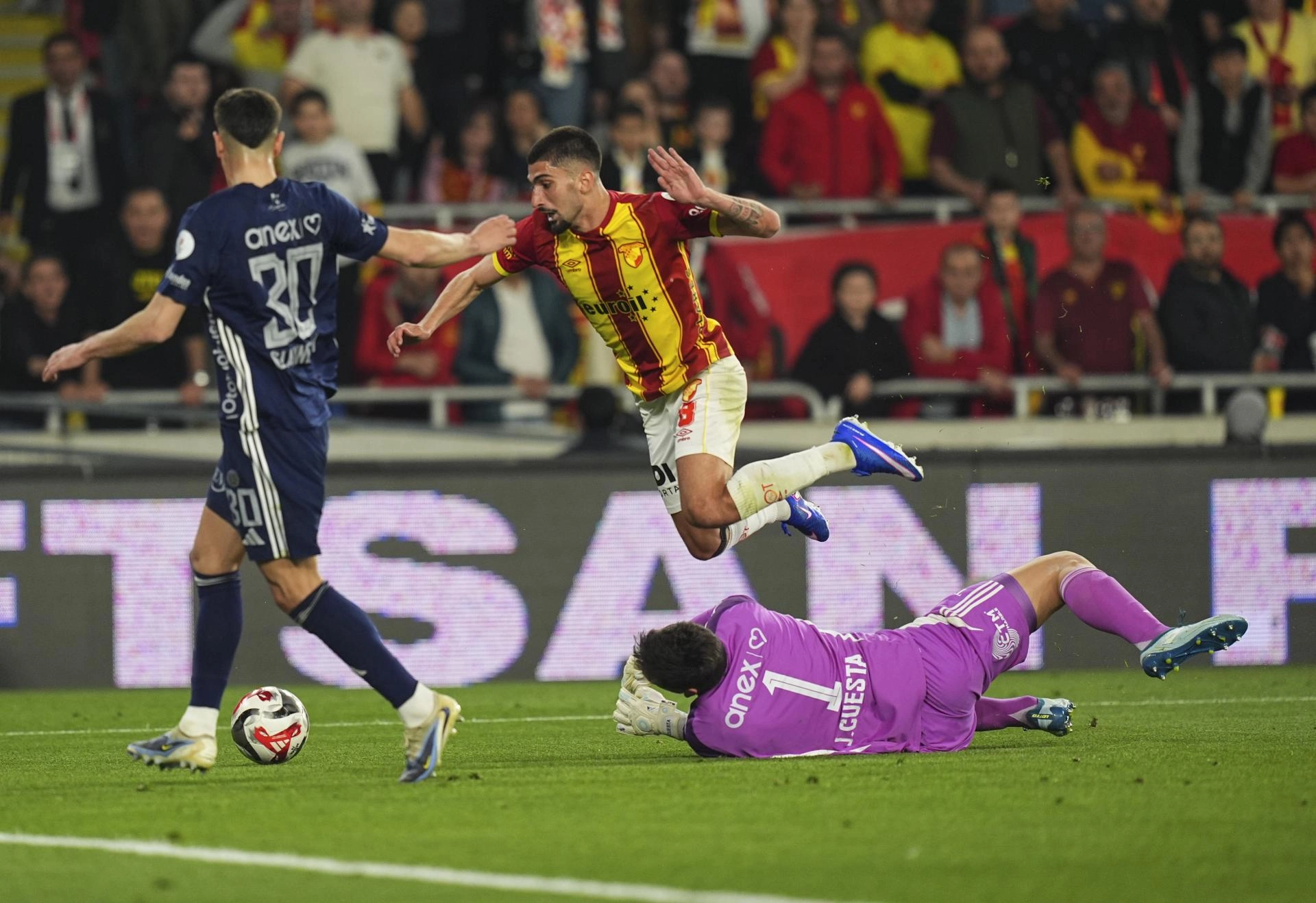 47. dakikada Göztepe gole yaklaştı. Sağ kanattan topla ceza sahasına giren Arda Okan Kurtulan'ın şutu, defans oyuncularına çarpıp kornere çıktı.