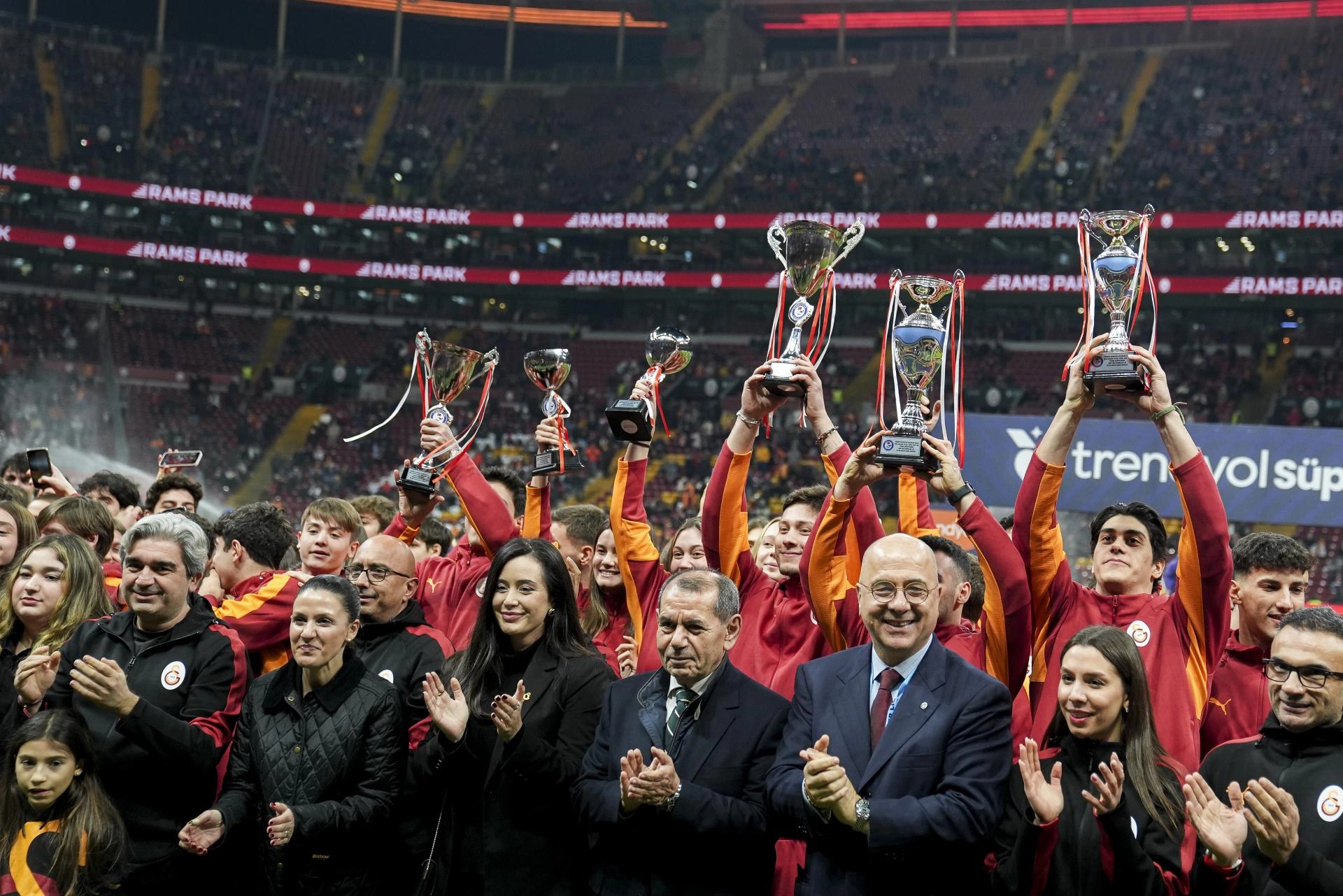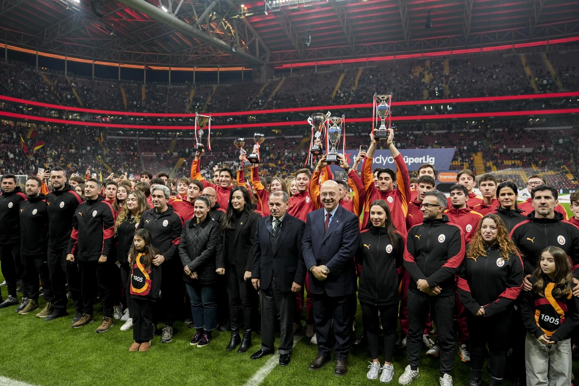 Öte yandan maç öncesinde farklı yaş kategorilerinde kupa kazanan yüzme sporcuları tribünleri selamladı.