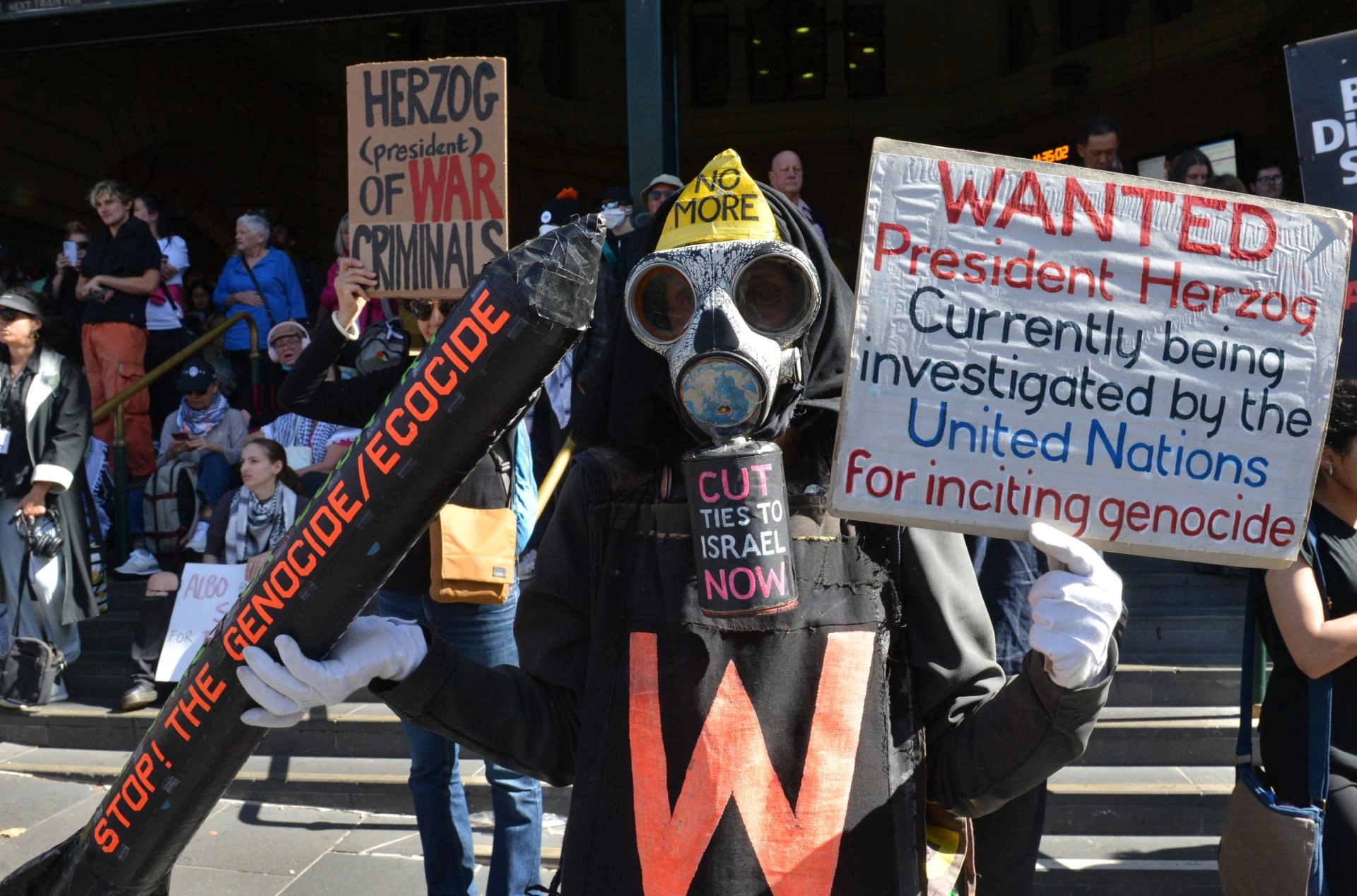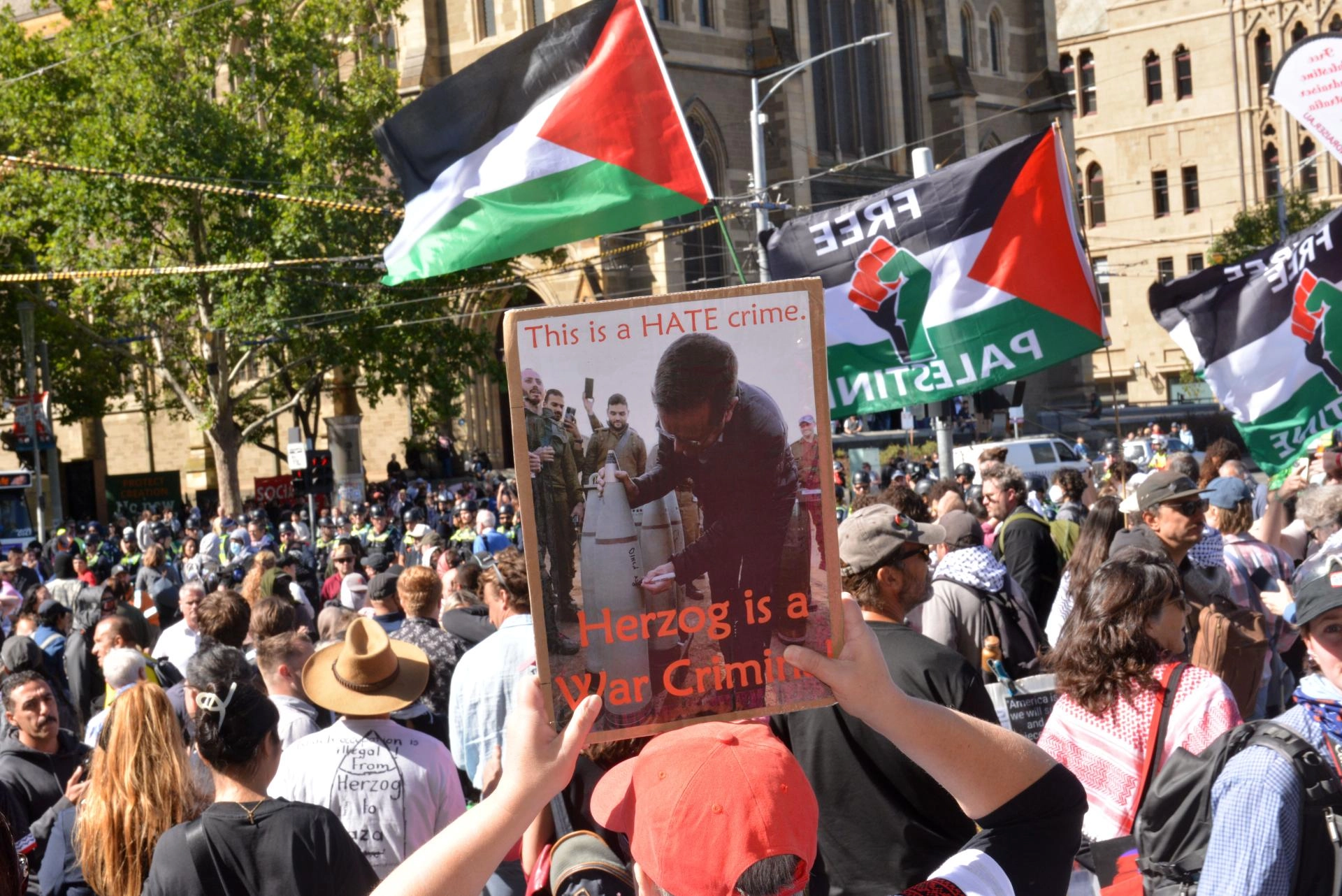 Filistin'i destekleyen göstericiler, Melbourne'ü ziyaretine karşı çıktıkları Herzog'un Gazze'de soykırımı reddetmesine ilişkin ifadelerine tepki gösterdi.