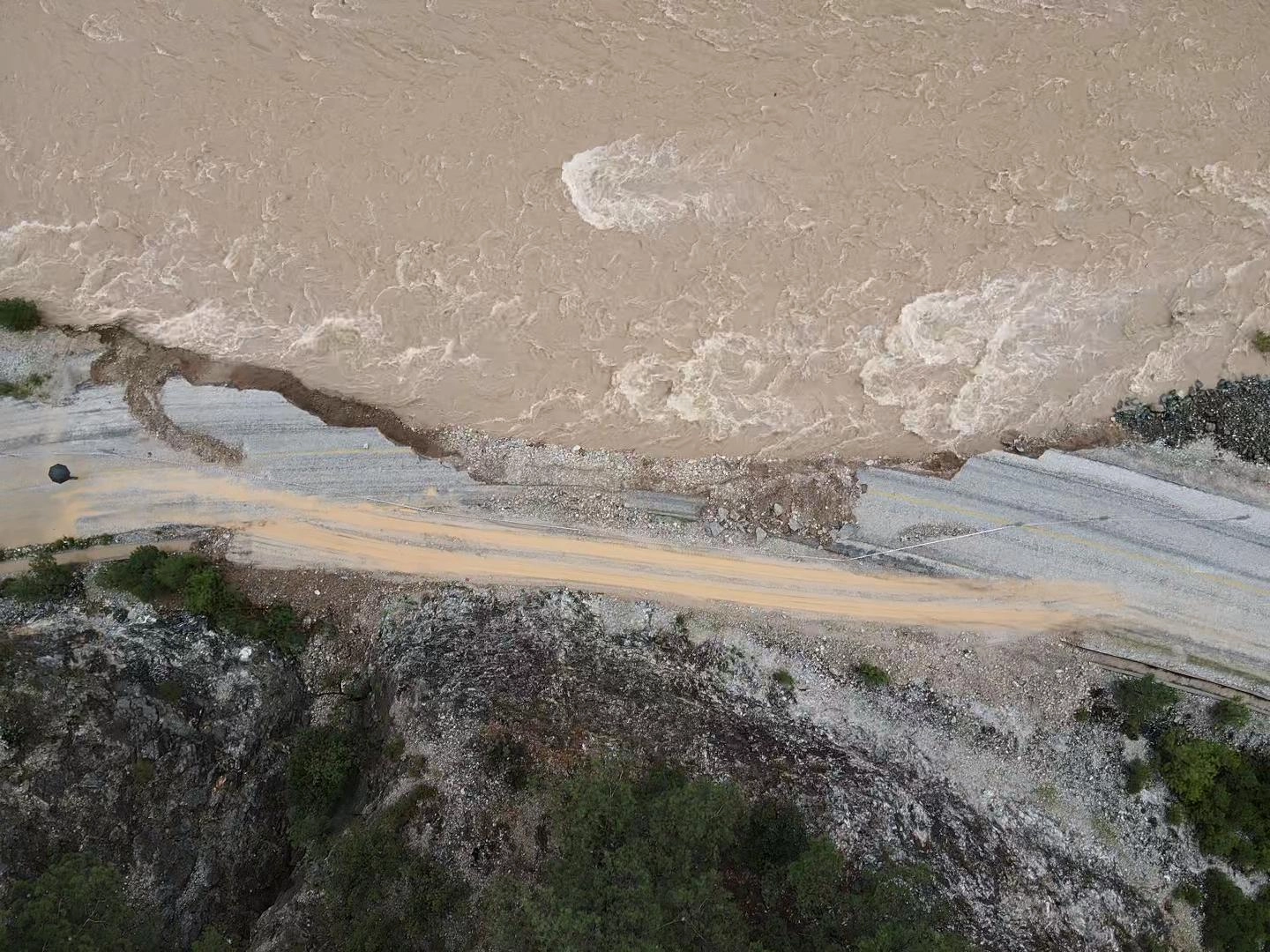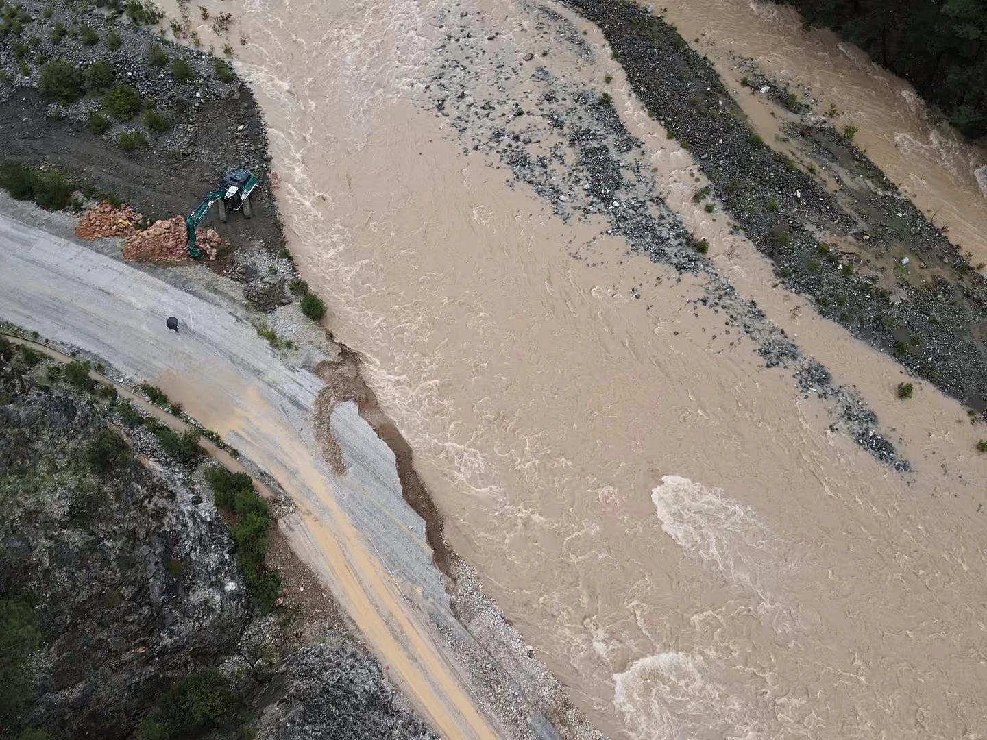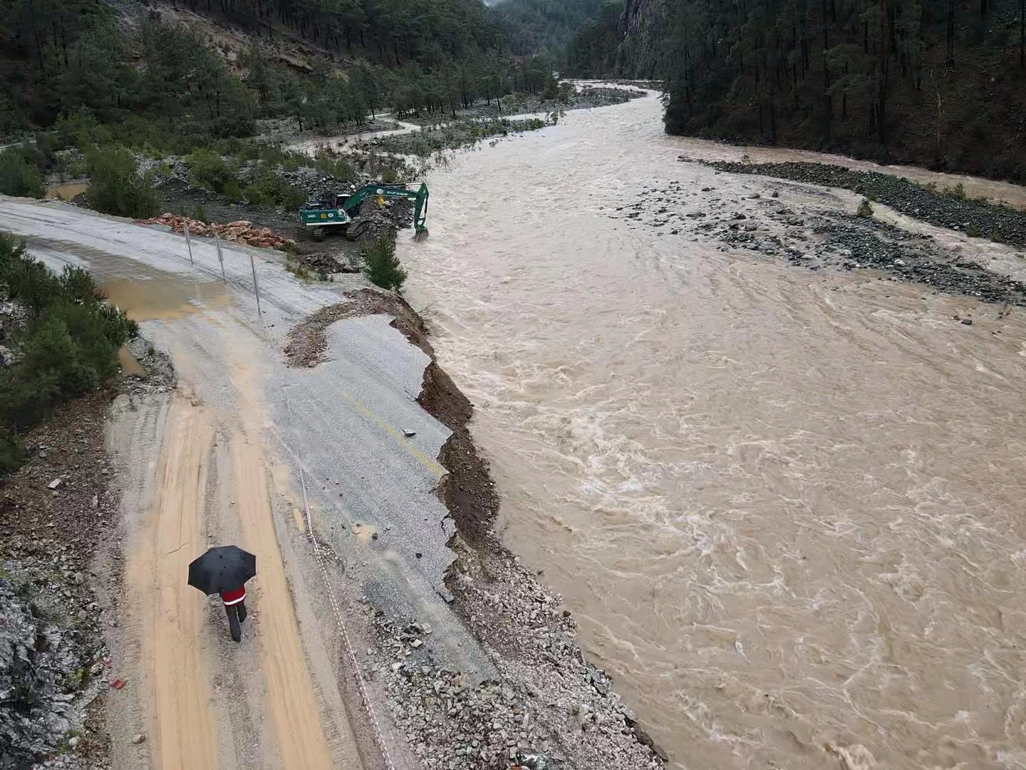 Yolda trafik akışı tek şeritten kontrollü olarak sağlanıyor. Çöken yol ve ekiplerin bölgede yürüttüğü çalışma AA ekibi tarafından dronla görüntülendi.