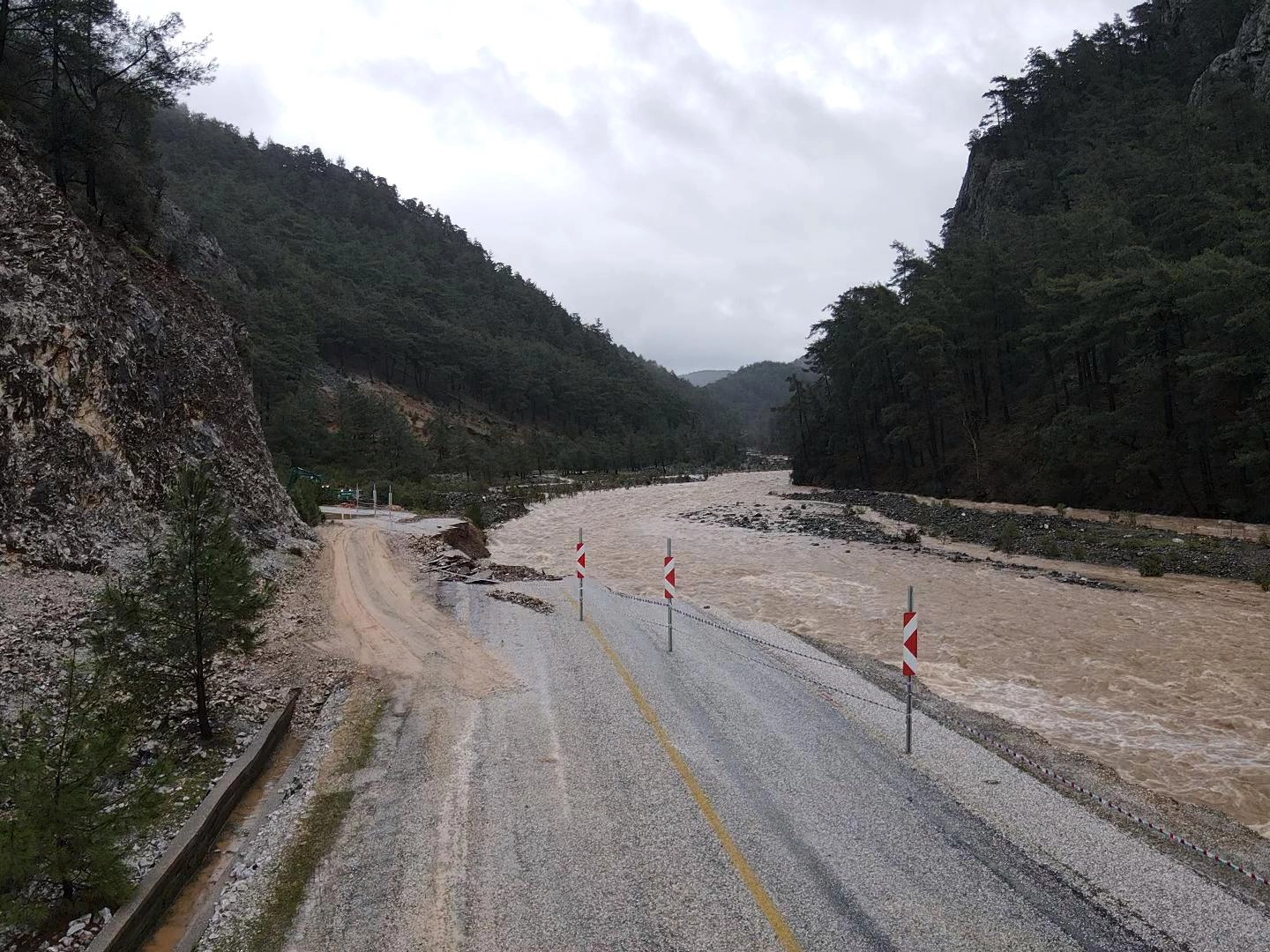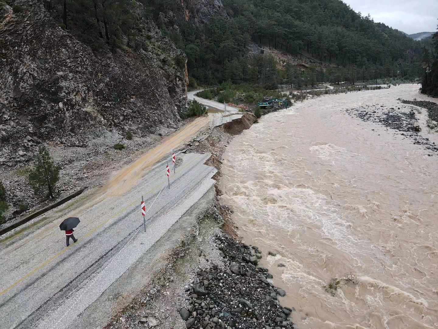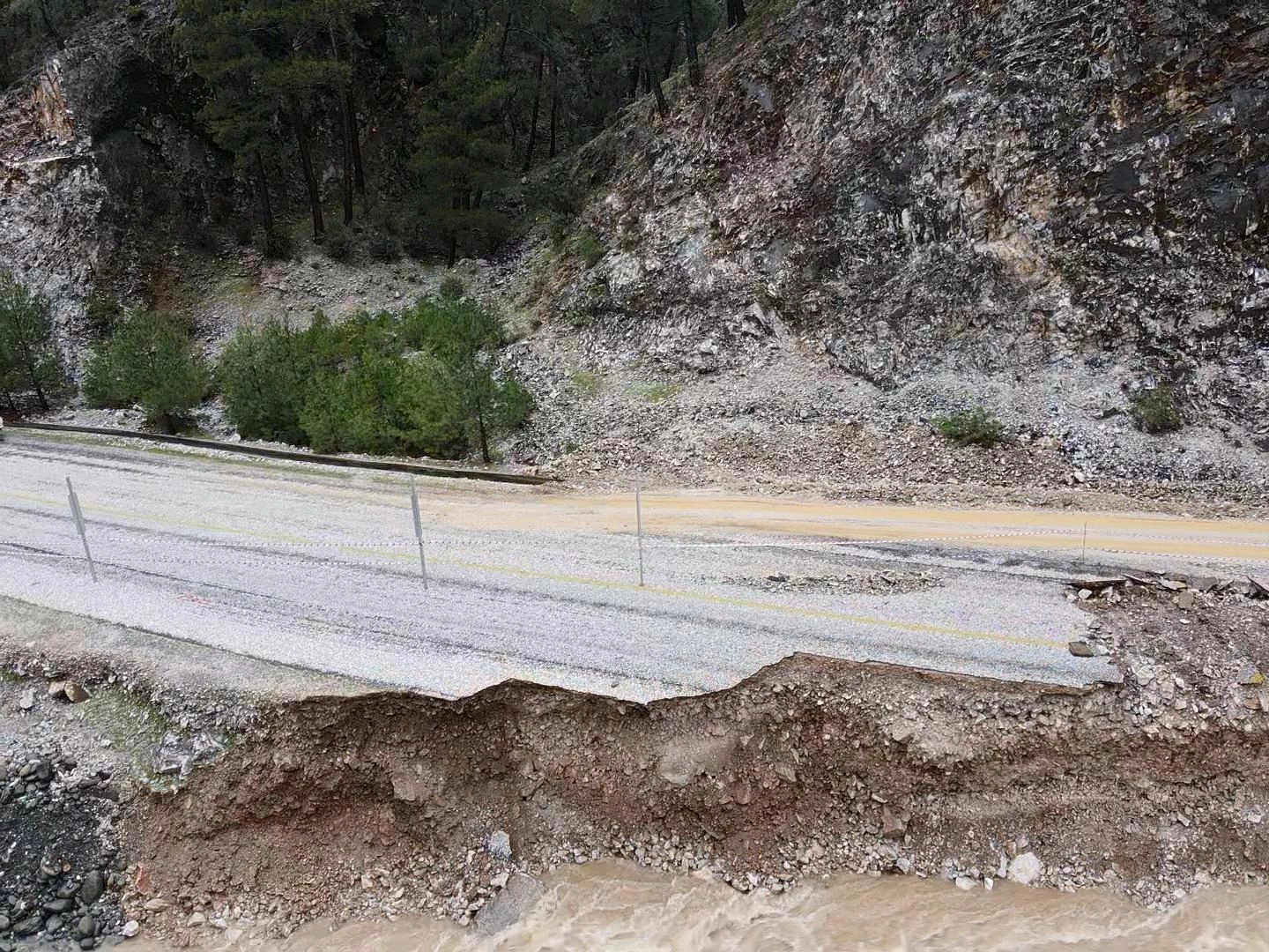 MUĞLA (AA) - Muğla ve ilçelerinde etkili olan kuvvetli yağış nedeniyle bazı dereler taştı, Ula Kavakçalı'da çöken yol kontrollü olarak tek şeritten ulaşıma açıldı.