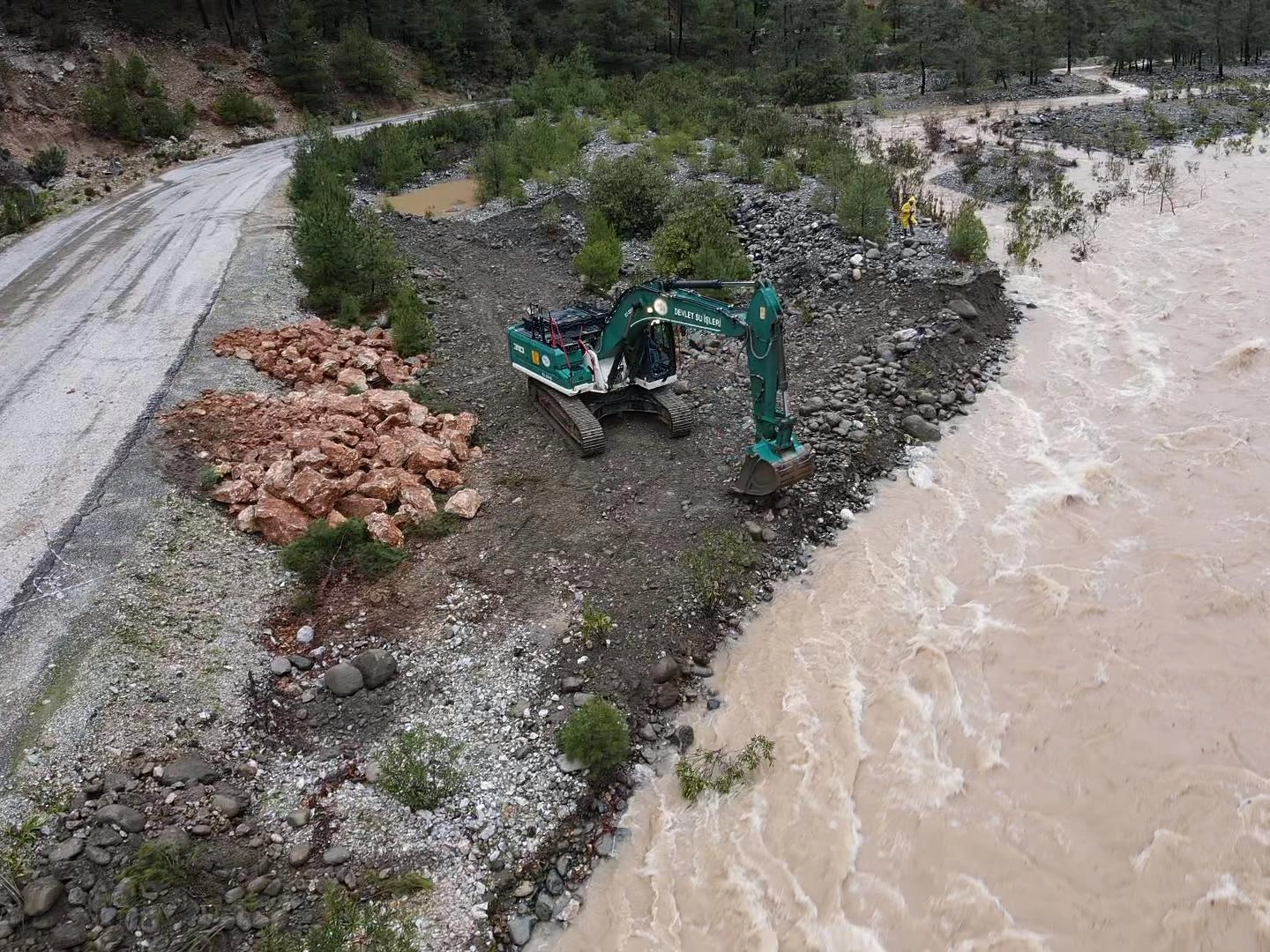 Kepçe ve kamyonlarla Namnam çayı kenarı taşlarla kapatılırken yolda da ekipler tarafından onarım çalışması başlatıldı.