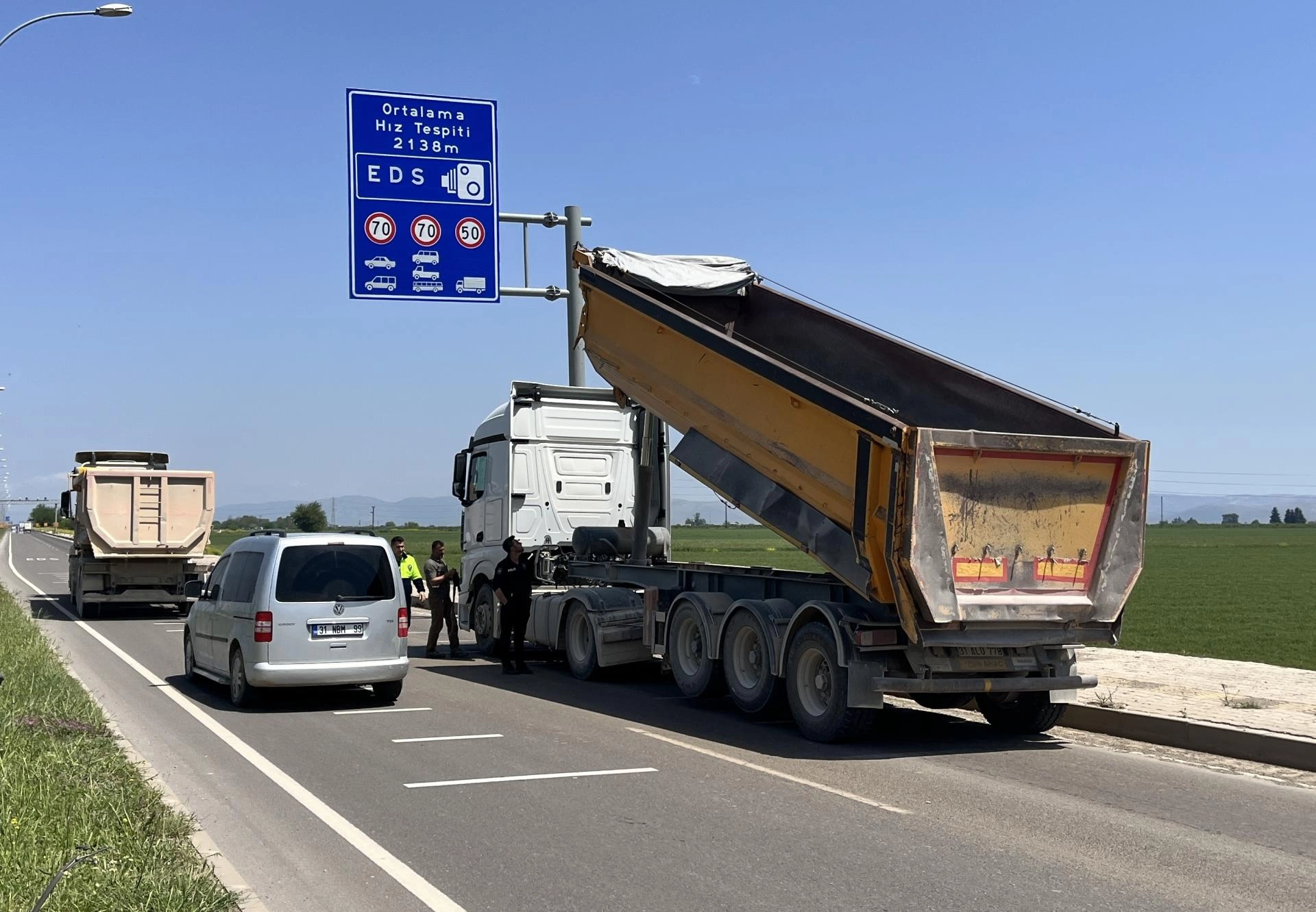 HATAY (AA) - Hatay'ın Kırıkhan ilçesinde damperi açık şekilde ilerleyen kamyon, Elektronik Denetleme Sistemi (EDS) direğine çarptı.