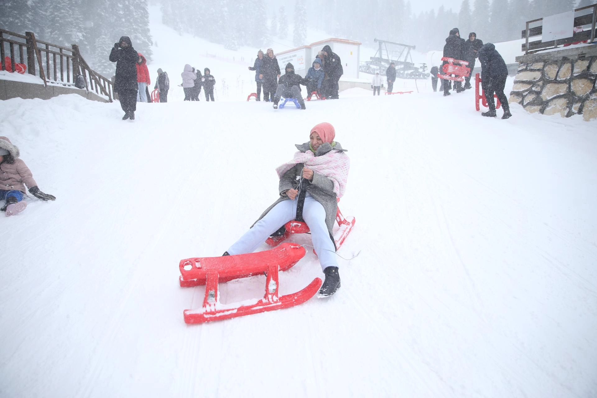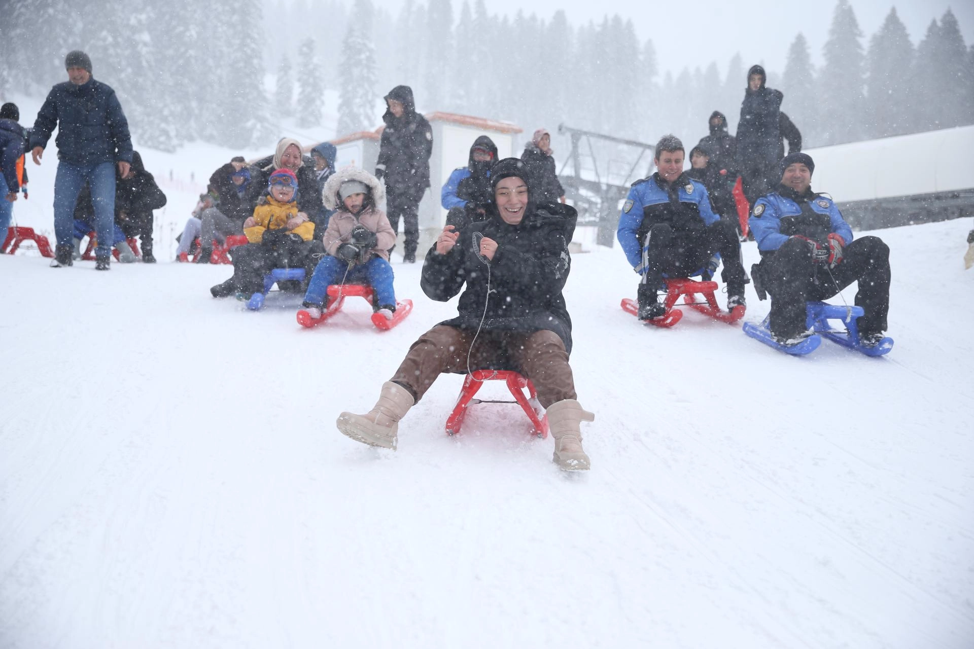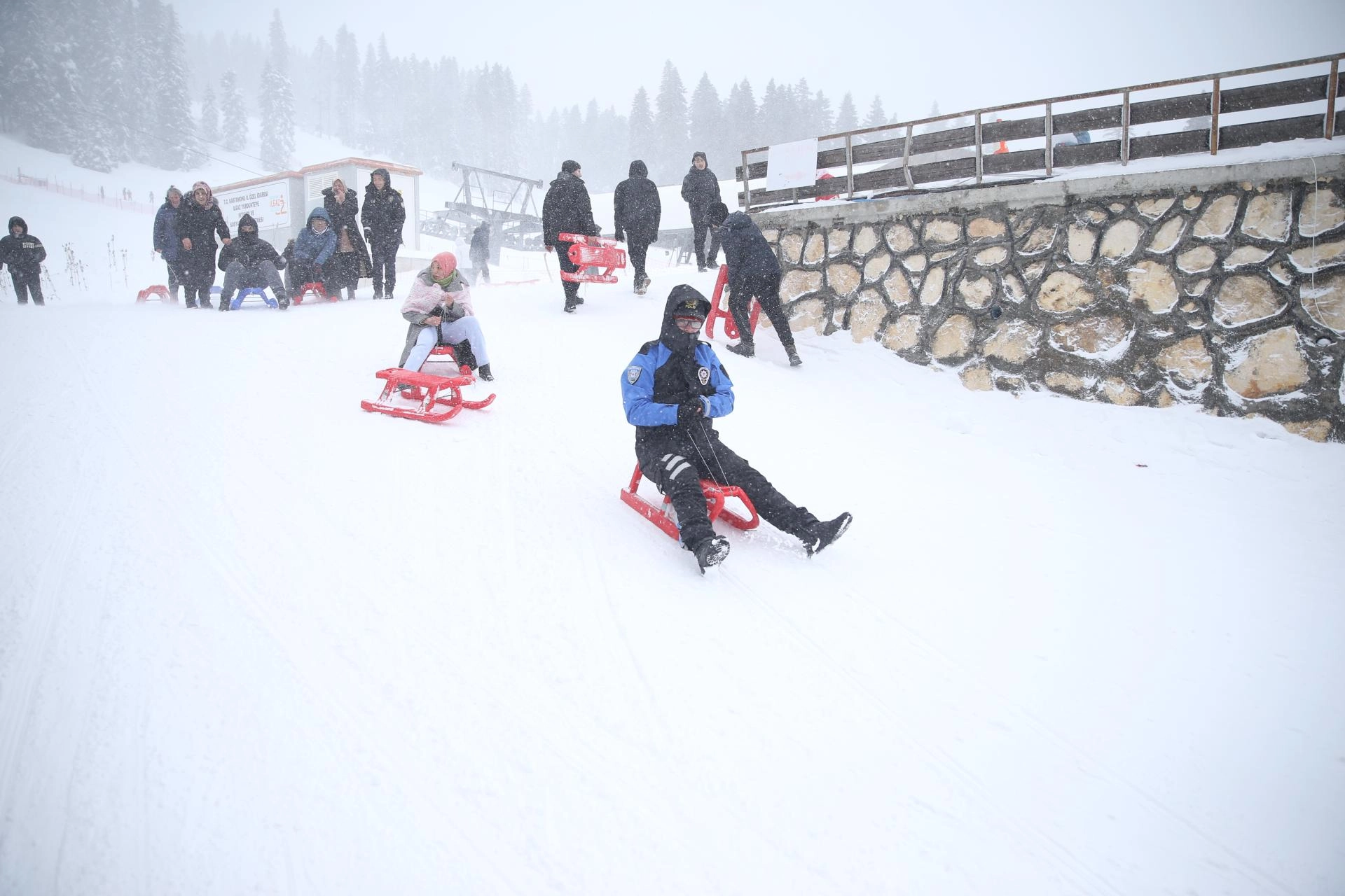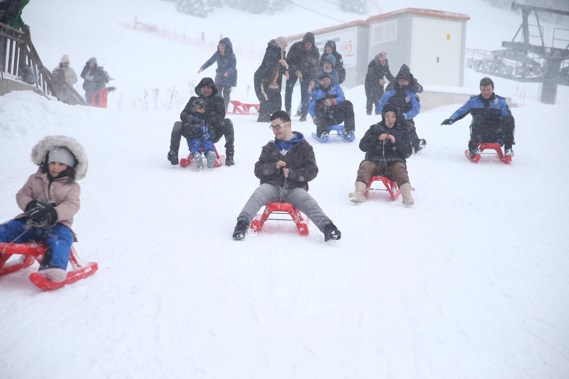 Teleferiğe binen özel bireyler ve aileleri, kızakla kayarak doyasıya eğlendi.