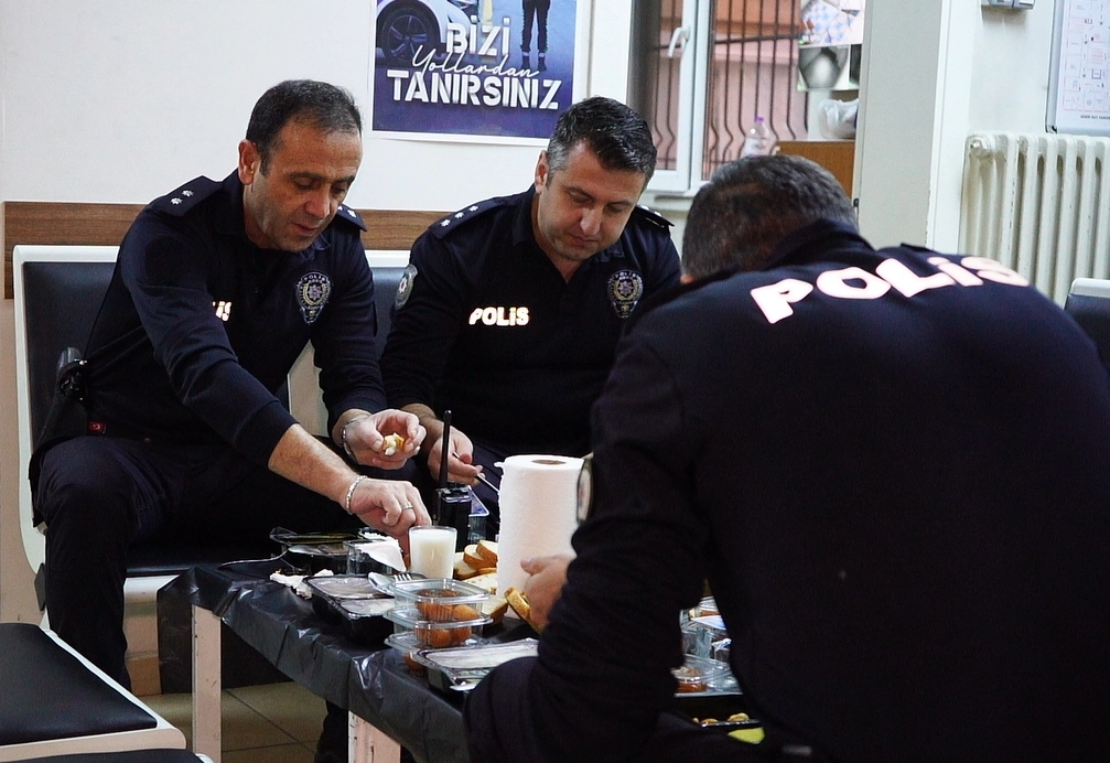 Hazırlanan mütevazı iftar sofrasında yemeklerini yiyen polisler, kısa süreli dinlenmenin ardından yeniden görevlerinin başına geçti.