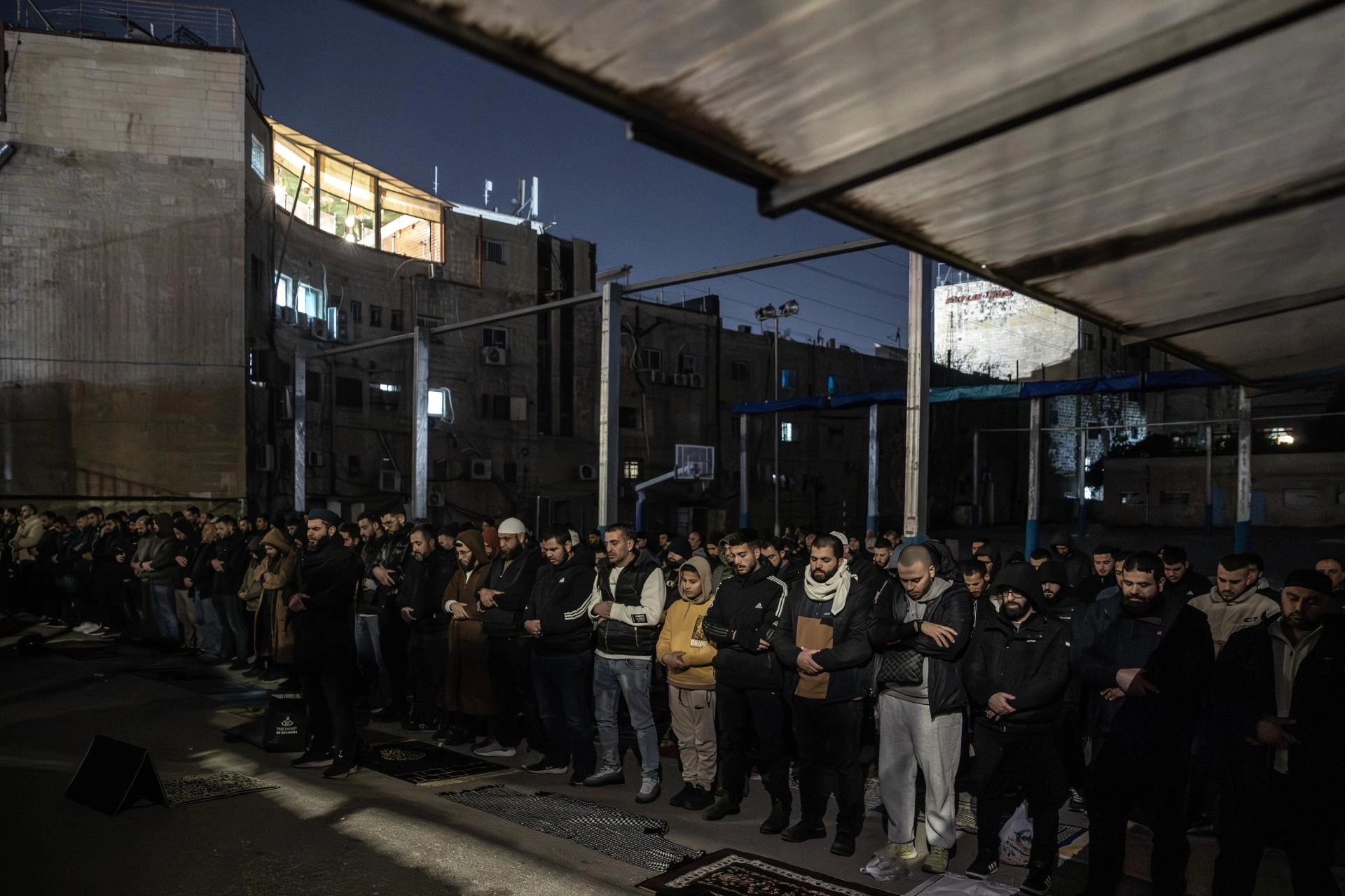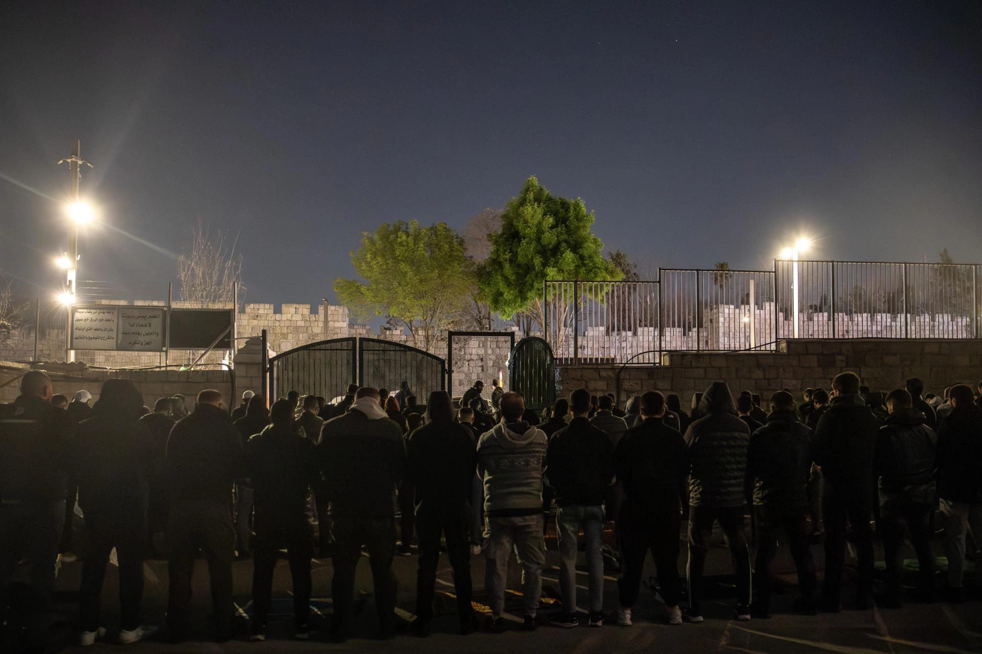 Mescid-i Aksa'nın kapıları yakınlarında ve Kudüs'ün eski şehir bölgesindeki sokaklarda gruplar halinde teravih namazı kılan Filistinliler Harem-i Şerifi yalnız bırakmayacakları mesajını verdi.