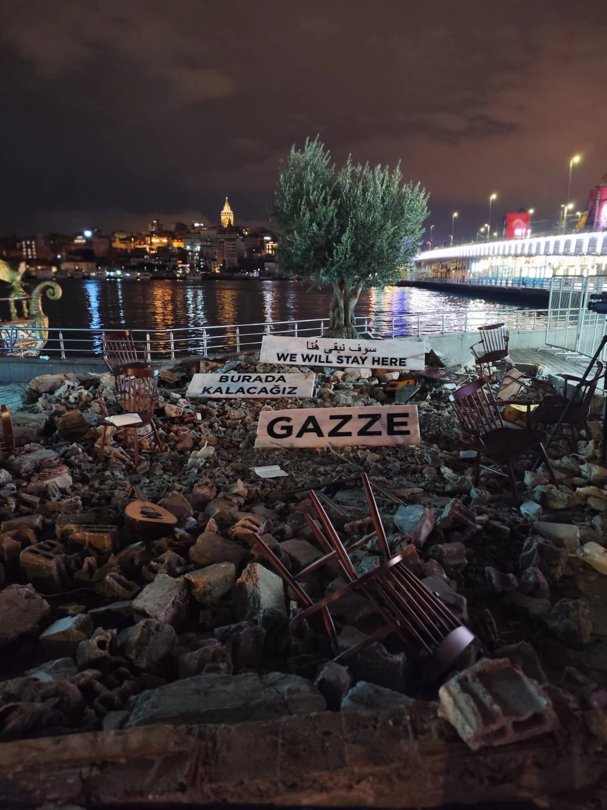 Yıkıntıların ortasında yükselen zeytin ağacı, yok edilmeye çalışılan hafızayı ve kök salmış direnişi temsil eden enstalasyonda devrilmiş sandalyeler, dağıtılmış enstrümanlar, kitaplar ve kamera gibi detaylar, kültürel üretimin susturulmasına karşı bir sembolizmle ifade edildi.