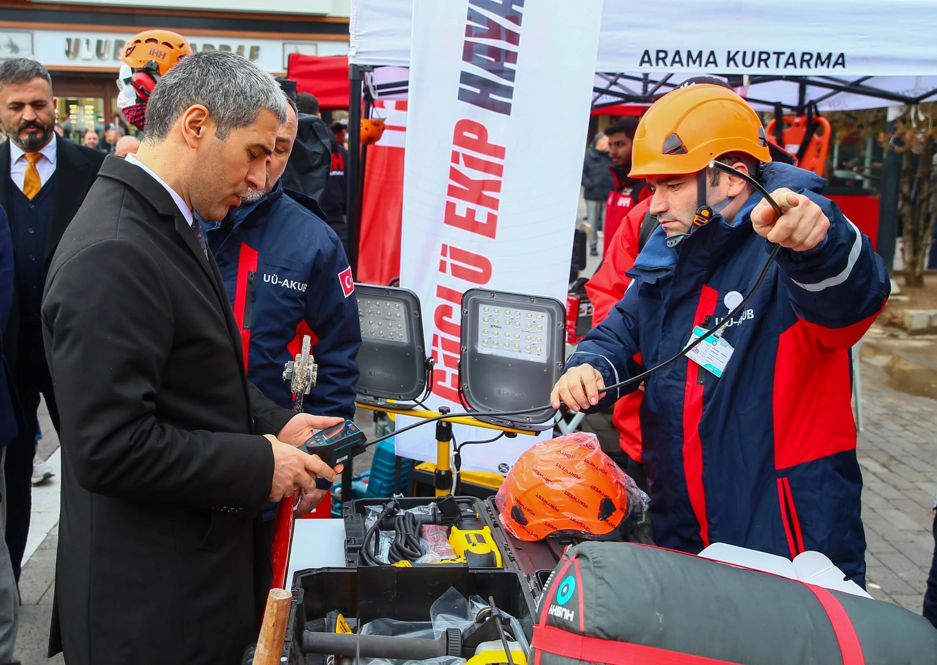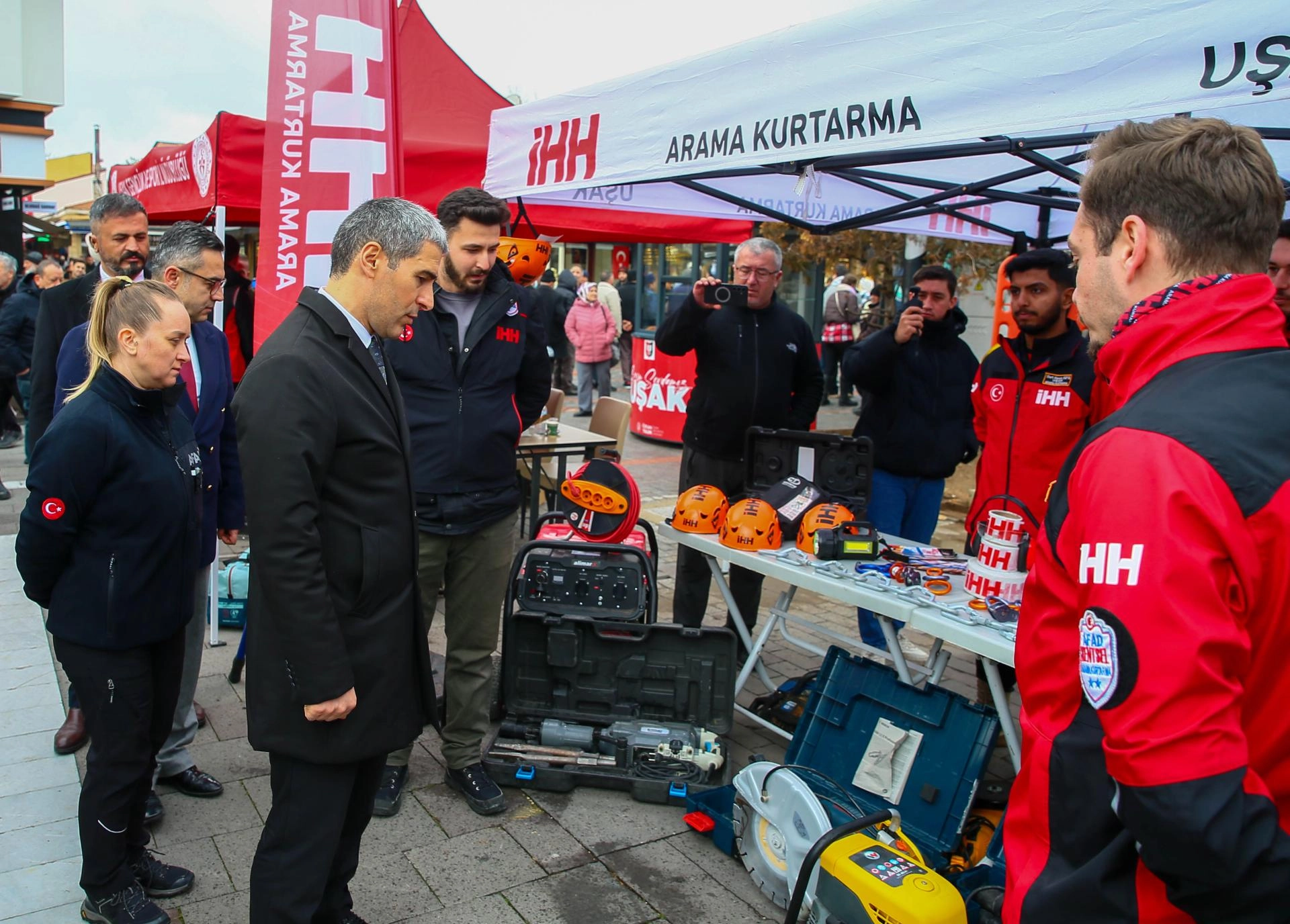 Protokol üyeleri daha sonra Uşak Belediyesi eski hizmet binası önünde AFAD, jandarma, itfaiye ve diğer arama kurtarma dernekleri tarafından açılan stantları gezdi.