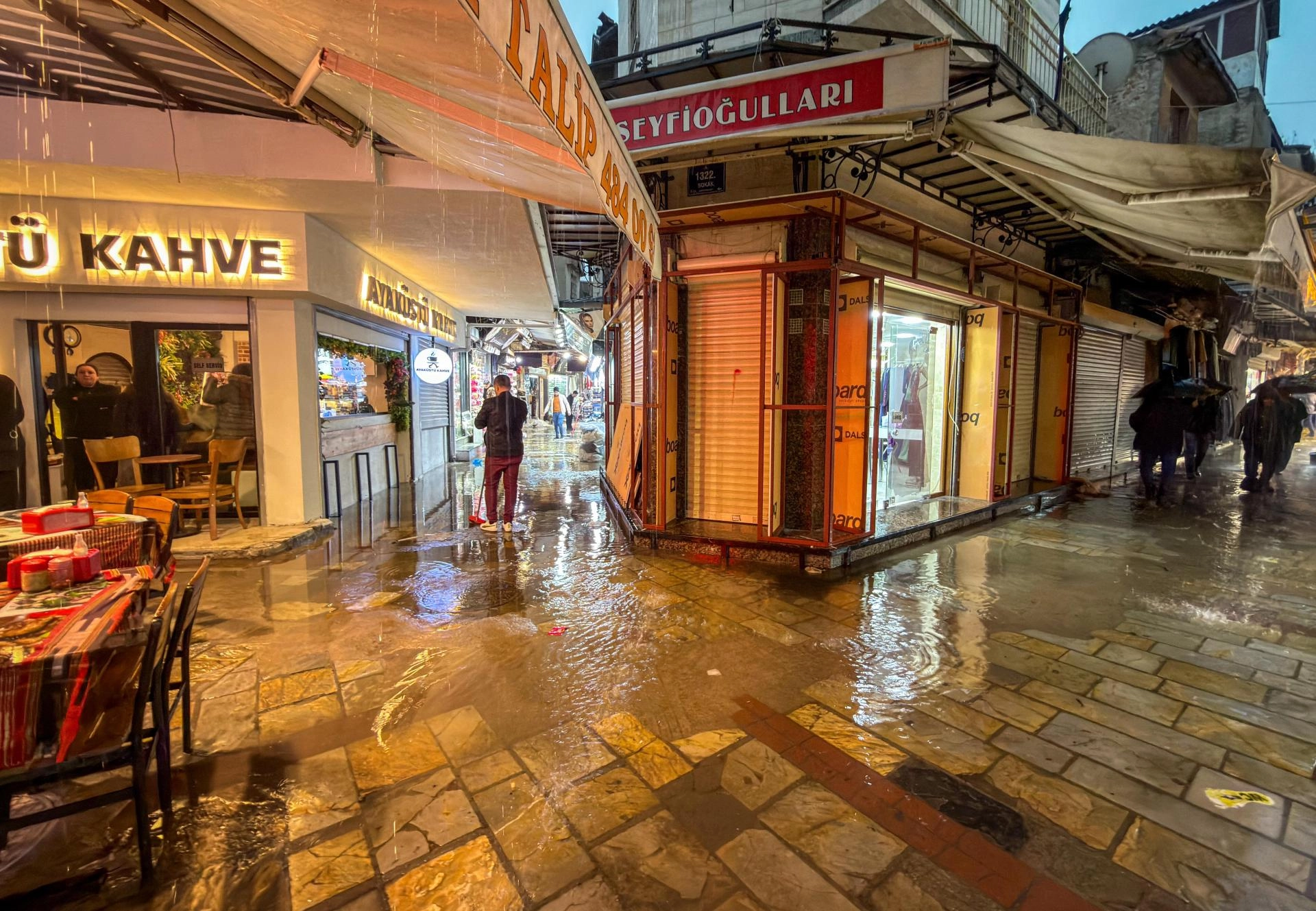 Konak'ta Kemeraltı Çarşısı'nda da bazı iş yerlerini su bastı, iş yeri sahipleri suyu tahliye etmeye çalıştı.